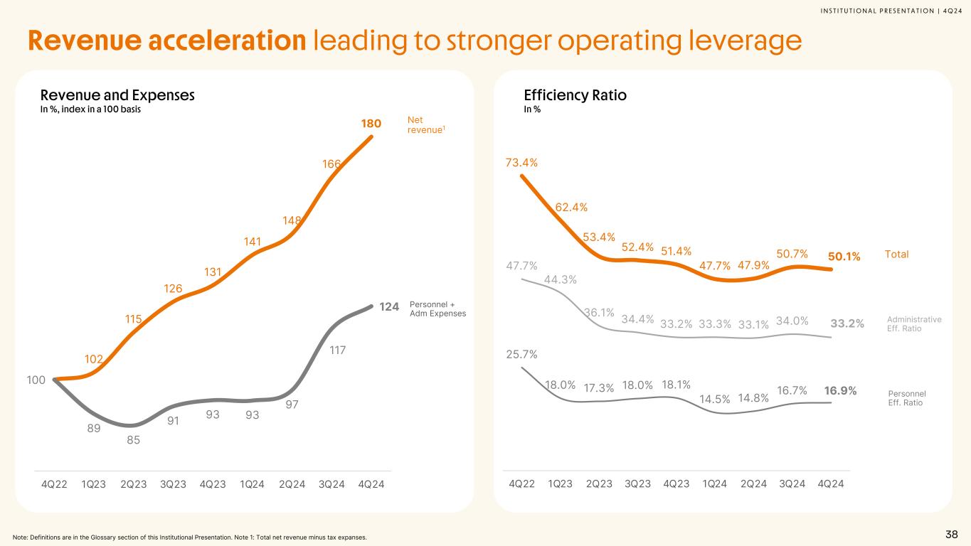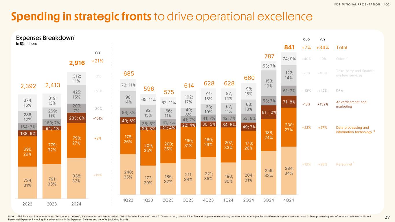 I N S T I T U T I O N A L P R E S E N T A T I O N | 4 Q 2 4 Note 1: IFRS Financial Statements lines: “Personnel expenses”, “Depreciation and Amortization”, “Administrative Expenses”. Note 2: Others = rent, condominium fee and property maintenance; provisions for contingencies and Financial System services. Note 3: Data processing and information technology. Note 4: Personnel Expenses including Share-based and M&A Expenses. Salaries and benefits (including Board). Expenses Breakdown1 In R$ millions 37 240; 35% 172; 29% 186; 32% 211; 34% 221; 35% 190; 30% 204; 31% 259; 33% 284; 34% 178; 26% 209; 35% 200; 35% 190; 31% 180; 29% 207; 33% 173; 26% 188; 24% 230; 27% 40; 6% 20; 3% 21; 4% 22; 4% 30; 5% 34; 5% 49; 7% 81; 10% 71; 8% 56; 8% 38; 6% 41; 7% 41; 7% 41; 7% 42; 7% 53; 8% 53; 7% 61; 7% 98; 14% 92; 15% 66; 11% 49; 8% 63; 10% 67; 11% 83; 13% 153; 19% 122; 14% 73; 11% 65; 11% 62; 11% 102; 17% 91; 15% 87; 14% 98; 15% 53; 7% 74; 9% 685 596 575 614 628 628 660 787 841 - 1 0 2 0 0 3 0 0 4 0 0 5 0 0 6 0 0 7 0 0 8 0 0 9 0 0 4Q22 1Q23 2Q23 3Q23 4Q23 1Q24 2Q24 3Q24 4Q24 4 3 Spending in strategic fronts to drive operational excellence 734; 31% 791; 33% 938; 32% 696; 29% 779; 32% 798; 27% 138; 6% 94; 4% 235; 8% 164; 7% 160; 7% 209; 7% 286; 12% 269; 11% 425; 15% 374; 16% 319; 13% 312; 11% 2,392 2,413 2,916 - 5 0 0 1 ,0 0 1 ,5 0 2 ,0 0 0 2 ,5 0 3 ,0 0 0 3 ,5 0 2022 2023 2024 QoQ YoY +7% +34% Total +40% -19% Other -20% +93% Third party and financial system services +13% +47% D&A -13% +132% Advertisement and marketing +22% +27% Data processing and information technology +10% +28% Personnel 2 YoY +21% -2% +58% +30% +151% +2% +19%