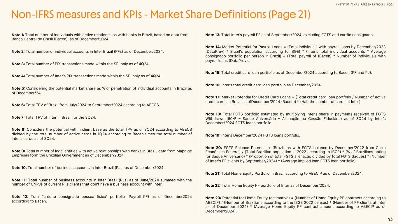 I N S T I T U T I O N A L P R E S E N T A T I O N | 4 Q 2 4 43 Non-IFRS measures and KPIs - Market Share Definitions (Page 21) Note 1: Total number of individuals with active relationships with banks in Brazil, based on data from Banco Central do Brasil (Bacen), as of December/2024. Note 2: Total number of individual accounts in Inter Brazil (PFs) as of December/2024. Note 3: Total number of PIX transactions made within the SPI only as of 4Q24. Note 4: Total number of Inter’s PIX transactions made within the SPI only as of 4Q24. Note 5: Considering the potential market share as % of penetration of individual accounts in Brazil as of December/24. Note 6: Total TPV of Brazil from July/2024 to September/2024 according to ABECS. Note 7: Total TPV of Inter in Brazil for the 3Q24. Note 8: Considers the potential within client base as the total TPV as of 3Q24 according to ABECS divided by the total number of active cards in 1Q24 according to Bacen times the total number of Inter’s cards as of 3Q24. Note 9: Total number of legal entities with active relationships with banks in Brazil, data from Mapa de Empresas form the Brazilian Government as of December/2024. Note 10: Total number of business accounts in Inter Brazil (PJs) as of December/2024. Note 11: Total number of business accounts in Inter Brazil (PJs) as of June/2024 summed with the number of CNPJs of current PFs clients that don't have a business account with Inter. Note 12: Total “crédito consignado pessoa física” portfolio (Payroll PF) as of December2024 according to Bacen. Note 13: Total Inter’s payroll PF as of September/2024, excluding FGTS and cartão consignado. Note 14: Market Potential for Payroll Loans = (Total individuals with payroll loans by December/2023 (DataPrev) * Brazil's population according to IBGE) * (Inter's total individual accounts * Average consignado portfolio per person in Brazil) + (Total payroll pf (Bacen) * Number of individuals with payroll loans (DataPrev). Note 15: Total credit card loan portfolio as of December/2024 according to Bacen (PF and PJ). Note 16: Inter’s total credit card loan portfolio as December/2024. Note 17: Market Potential for Credit Card Loans = (Total credit card loan portfolio / Number of active credit cards in Brazil as ofDecember/2024 (Bacen)) * (Half the number of cards at Inter). Note 18: Total FGTS portfolio estimated by multiplying Inter’s share in payments received of FGTS Withdraws (60-F – Saque Aniversário – Alienação ou Cessão Fiduciária) as of 3Q24 by Inter’s December/2024 FGTS loans portfolio. Note 19: Inter’s December/2024 FGTS loans portfolio. Note 20: FGTS Balance Potential = (Brazilians with FGTS balance by December/2022 from Caixa Econômica Federal) / (Total Brazilian population in 2022 according to IBGE) * (% of Brazilians opting for Saque Aniversário) * (Proportion of total FGTS alienação divided by total FGTS Saques) * (Number of Inter's PF clients by September/2024) * (Average implied loan FGTS loan portfolio). Note 21: Total Home Equity Portfolio in Brazil according to ABECIP as of December/2024. Note 22: Total Home Equity PF portfolio of Inter as of December/2024. Note 23: Potential for Home Equity (estimative) = (Number of Home Equity PF contracts according to ABECIP) / (Number of Brazilians according to the IBGE 2022 census) * (Number of PF clients at Inter as of December 2024) * (Average Home Equity PF contract amount according to ABECIP as of December/2024).