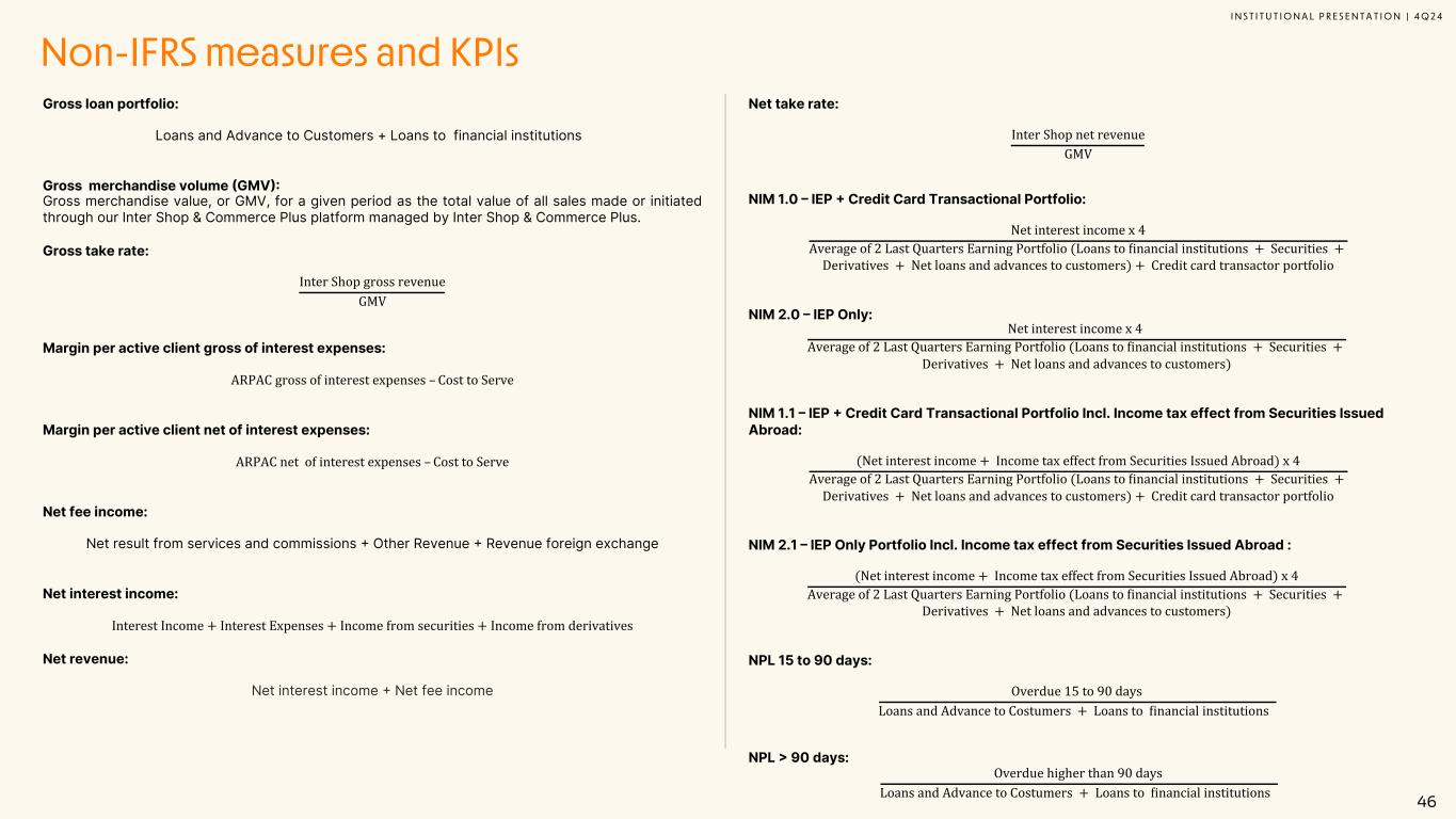 I N S T I T U T I O N A L P R E S E N T A T I O N | 4 Q 2 4 45 Non-IFRS measures and KPIs Card+PIX TPV: PIX, debit and credit cards and withdrawal transacted volumes of a given period. PIX is a Central Bank of Brazil solution to bring instant payments among banks and financial institutions in Brazil. Card+PIX TPV per active client: Card+PIX TPV for a given period divided by the number of active clients as of the last day of the period. Cost of funding: Interest expenses × 4 Average of last 2 quarters Interest bearing liabilities (demand deposits, time deposits, savings deposits, creditors by resources to release, securities issued, securities sold under agreements to repurchase, interbank deposits and others) Cost of risk: Impairment losses on Minancial assets × 4 Average of last 2 quarters of Loans and advances to customers Cost of risk excluding anticipation of credit card receivables: Impairment losses on Minancial assets × 4 Average of last 2 quarters of Loans and advances to customers excluding anticipation of credit card receivables Cost of risk excluding credit card: Impairment losses on Minancial assets × 4 Average of last 2 quarters of Loans and advances to customers excluding credit card Cost-to-serve (CTS): Personnel Expense + Administrative Expenses − Total CAC ÷ 3 Average of the last 2 quarters Active Clients Coverage ratio: Provision for expected credit loss + Provision for expected credit losses on loan commitments Overdue higher than 90 days Earning portfolio (IEP): Earnings Portfolio includes “Amounts due from financial institutions” + “Loans and advances to customers” + “Securities” + “Derivatives” from the IFRS Balance Sheet Efficiency ratio: Personnel expense + Administrative expenses + Depreciation and amortization Net Interest Income + Net result from services and comissions + Other revenue − Tax expense Fee income ratio: Net result from services and commissions + Other revenue Net Interest Income + Net result from services and comissions + Other revenue − Tax expense Funding: Demand Deposits + Time Deposits + Securities Issued + Savings Deposits + Creditors by Resources to Release + Securities sold under agreements to repurchase + Interbank deposits + Borrowing and onlending Global Services Clients: Includes Brazilian Global Account clients, US clients and international investors.