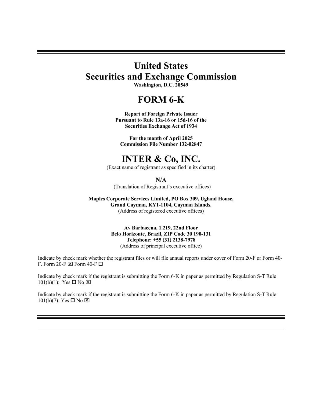 United States Securities and Exchange Commission Washington, D.C. 20549 FORM 6-K Report of Foreign Private Issuer Pursuant to Rule 13a-16 or 15d-16 of the Securities Exchange Act of 1934 For the month of April 2025 Commission File Number 132-02847 INTER & Co, INC. (Exact name of registrant as specified in its charter) N/A (Translation of Registrant’s executive offices) Maples Corporate Services Limited, PO Box 309, Ugland House, Grand Cayman, KY1-1104, Cayman Islands. (Address of registered executive offices) Av Barbacena, 1.219, 22nd Floor Belo Horizonte, Brazil, ZIP Code 30 190-131 Telephone: +55 (31) 2138-7978 (Address of principal executive office) Indicate by check mark whether the registrant files or will file annual reports under cover of Form 20-F or Form 40- F. Form 20-F x Form 40-F o Indicate by check mark if the registrant is submitting the Form 6-K in paper as permitted by Regulation S-T Rule 101(b)(1): Yes o No x Indicate by check mark if the registrant is submitting the Form 6-K in paper as permitted by Regulation S-T Rule 101(b)(7): Yes o No x
