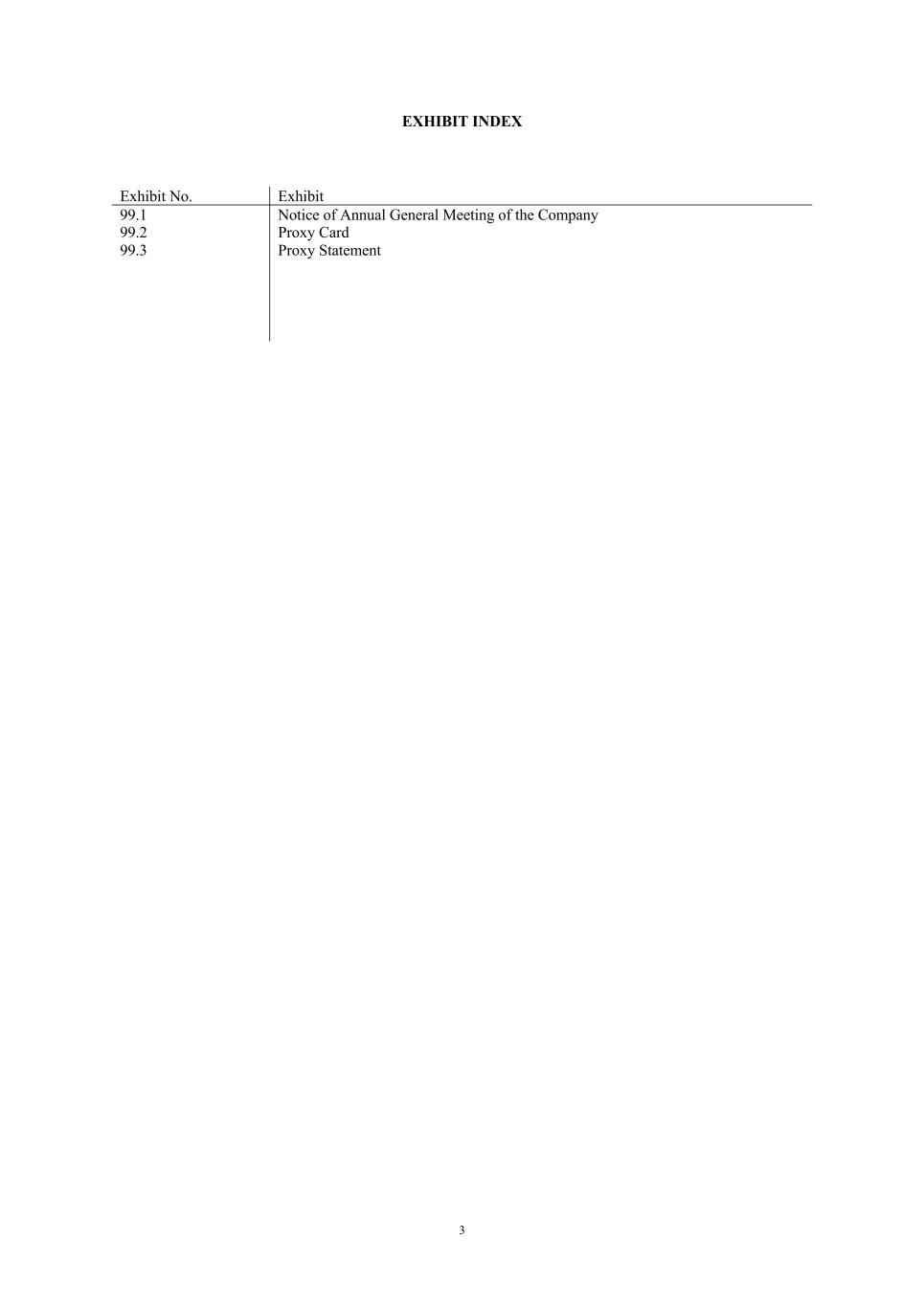 3 EXHIBIT INDEX Exhibit No. Exhibit 99.1 99.2 99.3 Notice of Annual General Meeting of the Company Proxy Card Proxy Statement