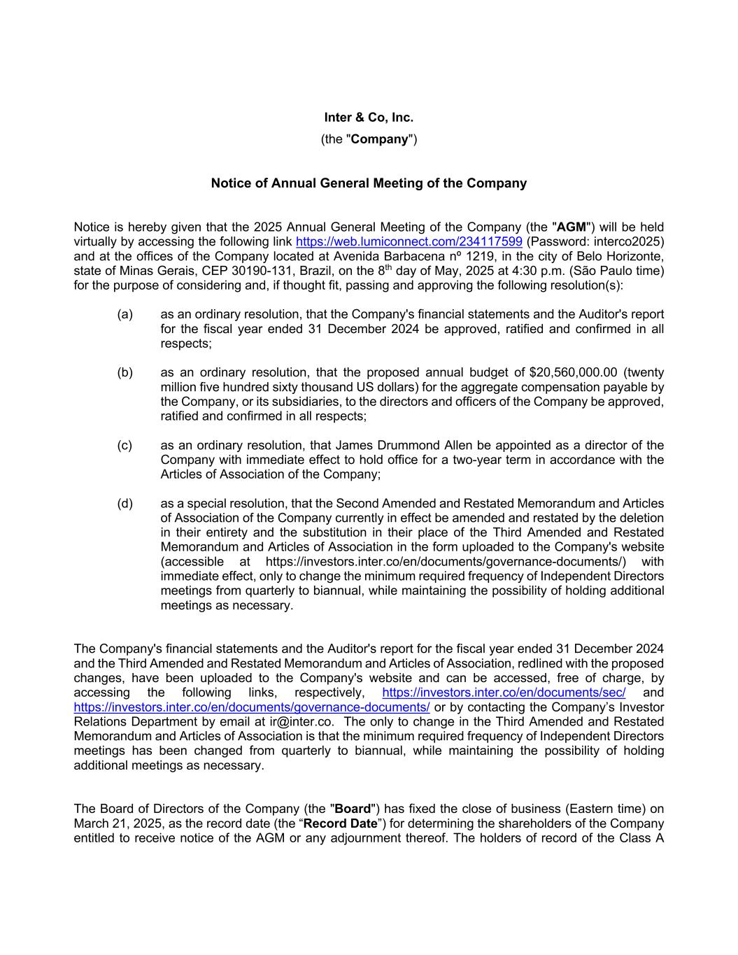 Inter & Co, Inc. (the "Company") Notice of Annual General Meeting of the Company Notice is hereby given that the 2025 Annual General Meeting of the Company (the "AGM") will be held virtually by accessing the following link https://web.lumiconnect.com/234117599 (Password: interco2025) and at the offices of the Company located at Avenida Barbacena nº 1219, in the city of Belo Horizonte, state of Minas Gerais, CEP 30190-131, Brazil, on the 8th day of May, 2025 at 4:30 p.m. (São Paulo time) for the purpose of considering and, if thought fit, passing and approving the following resolution(s): (a) as an ordinary resolution, that the Company's financial statements and the Auditor's report for the fiscal year ended 31 December 2024 be approved, ratified and confirmed in all respects; (b) as an ordinary resolution, that the proposed annual budget of $20,560,000.00 (twenty million five hundred sixty thousand US dollars) for the aggregate compensation payable by the Company, or its subsidiaries, to the directors and officers of the Company be approved, ratified and confirmed in all respects; (c) as an ordinary resolution, that James Drummond Allen be appointed as a director of the Company with immediate effect to hold office for a two-year term in accordance with the Articles of Association of the Company; (d) as a special resolution, that the Second Amended and Restated Memorandum and Articles of Association of the Company currently in effect be amended and restated by the deletion in their entirety and the substitution in their place of the Third Amended and Restated Memorandum and Articles of Association in the form uploaded to the Company's website (accessible at https://investors.inter.co/en/documents/governance-documents/) with immediate effect, only to change the minimum required frequency of Independent Directors meetings from quarterly to biannual, while maintaining the possibility of holding additional meetings as necessary. The Company's financial statements and the Auditor's report for the fiscal year ended 31 December 2024 and the Third Amended and Restated Memorandum and Articles of Association, redlined with the proposed changes, have been uploaded to the Company's website and can be accessed, free of charge, by accessing the following links, respectively, https://investors.inter.co/en/documents/sec/ and https://investors.inter.co/en/documents/governance-documents/ or by contacting the Company’s Investor Relations Department by email at ir@inter.co. The only to change in the Third Amended and Restated Memorandum and Articles of Association is that the minimum required frequency of Independent Directors meetings has been changed from quarterly to biannual, while maintaining the possibility of holding additional meetings as necessary. The Board of Directors of the Company (the "Board") has fixed the close of business (Eastern time) on March 21, 2025, as the record date (the “Record Date”) for determining the shareholders of the Company entitled to receive notice of the AGM or any adjournment thereof. The holders of record of the Class A