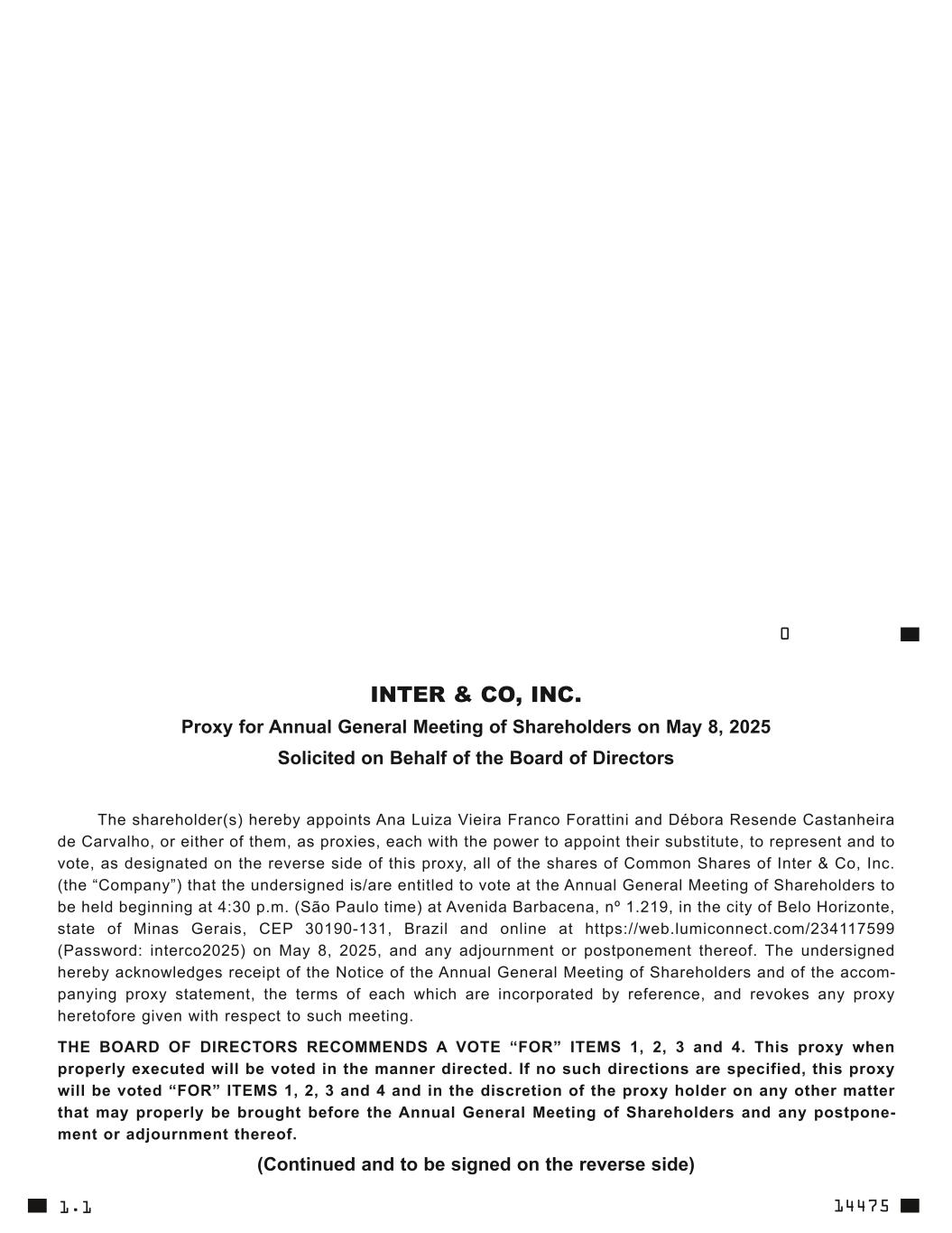 0 ------------------ . . . . . . . . . . . . . . . . . . . . . . . . . . . . . . . . . . . . . . . . . . . . . . . . . . . . . . ---------------- 14475 INTER & CO, INC. Proxy for Annual General Meeting of Shareholders on May 8, 2025 Solicited on Behalf of the Board of Directors The shareholder(s) hereby appoints Ana Luiza Vieira Franco Forattini and Débora Resende Castanheira de Carvalho, or either of them, as proxies, each with the power to appoint their substitute, to represent and to vote, as designated on the reverse side of this proxy, all of the shares of Common Shares of Inter & Co, Inc. (the “Company”) that the undersigned is/are entitled to vote at the Annual General Meeting of Shareholders to be held beginning at 4:30 p.m. (São Paulo time) at Avenida Barbacena, nº 1.219, in the city of Belo Horizonte, state of Minas Gerais, CEP 30190-131, Brazil and online at https://web.lumiconnect.com/234117599 (Password: interco2025) on May 8, 2025, and any adjournment or postponement thereof. The undersigned hereby acknowledges receipt of the Notice of the Annual General Meeting of Shareholders and of the accom- panying proxy statement, the terms of each which are incorporated by reference, and revokes any proxy heretofore given with respect to such meeting. THE BOARD OF DIRECTORS RECOMMENDS A VOTE “FOR” ITEMS 1, 2, 3 and 4. This proxy when properly executed will be voted in the manner directed. If no such directions are specified, this proxy will be voted “FOR” ITEMS 1, 2, 3 and 4 and in the discretion of the proxy holder on any other matter that may properly be brought before the Annual General Meeting of Shareholders and any postpone- ment or adjournment thereof. (Continued and to be signed on the reverse side) 1.1