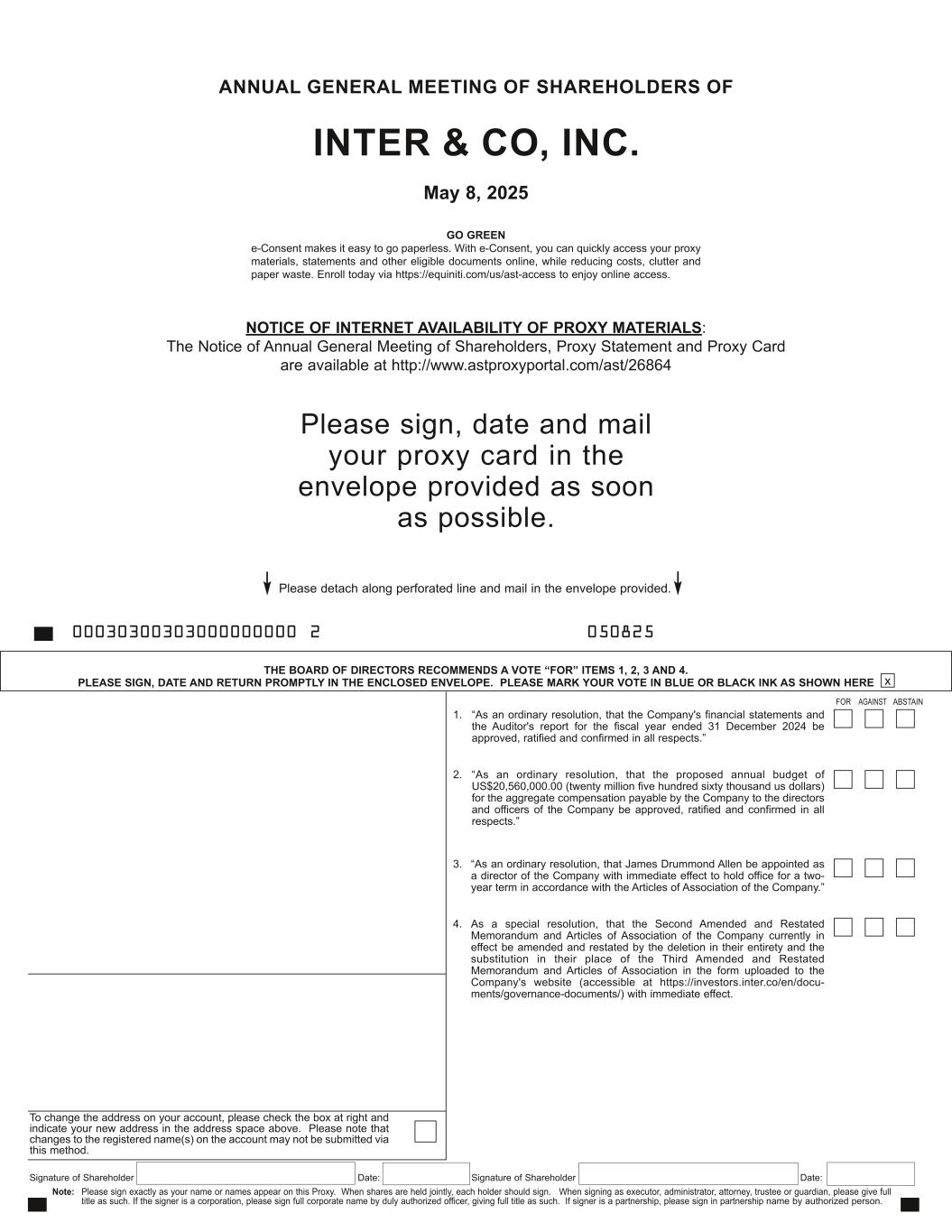 ANNUAL GENERAL MEETING OF SHAREHOLDERS OF INTER & CO, INC. May 8, 2025 NOTICE OF INTERNET AVAILABILITY OF PROXY MATERIALS: The Notice of Annual General Meeting of Shareholders, Proxy Statement and Proxy Card are available at http://www.astproxyportal.com/ast/26864 Please sign, date and mail your proxy card in the envelope provided as soon as possible. Signature of Shareholder Date: Signature of Shareholder Date: Note: Please sign exactly as your name or names appear on this Proxy. When shares are held jointly, each holder should sign. When signing as executor, administrator, attorney, trustee or guardian, please give full title as such. If the signer is a corporation, please sign full corporate name by duly authorized officer, giving full title as such. If signer is a partnership, please sign in partnership name by authorized person. To change the address on your account, please check the box at right and indicate your new address in the address space above. Please note that changes to the registered name(s) on the account may not be submitted via this method. THE BOARD OF DIRECTORS RECOMMENDS A VOTE “FOR” ITEMS 1, 2, 3 AND 4. PLEASE SIGN, DATE AND RETURN PROMPTLY IN THE ENCLOSED ENVELOPE. PLEASE MARK YOUR VOTE IN BLUE OR BLACK INK AS SHOWN HERE x Please detach along perforated line and mail in the envelope provided. 00030300303000000000 2 050825 GO GREEN e-Consent makes it easy to go paperless. With e-Consent, you can quickly access your proxy materials, statements and other eligible documents online, while reducing costs, clutter and paper waste. Enroll today via https://equiniti.com/us/ast-access to enjoy online access. 1. “As an ordinary resolution, that the Company's financial statements and the Auditor's report for the fiscal year ended 31 December 2024 be approved, ratified and confirmed in all respects.” 2. “As an ordinary resolution, that the proposed annual budget of US$20,560,000.00 (twenty million five hundred sixty thousand us dollars) for the aggregate compensation payable by the Company to the directors and officers of the Company be approved, ratified and confirmed in all respects.” 3. “As an ordinary resolution, that James Drummond Allen be appointed as a director of the Company with immediate effect to hold office for a two- year term in accordance with the Articles of Association of the Company.” 4. As a special resolution, that the Second Amended and Restated Memorandum and Articles of Association of the Company currently in effect be amended and restated by the deletion in their entirety and the substitution in their place of the Third Amended and Restated Memorandum and Articles of Association in the form uploaded to the Company's website (accessible at https://investors.inter.co/en/docu- ments/governance-documents/) with immediate effect. FOR AGAINST ABSTAIN