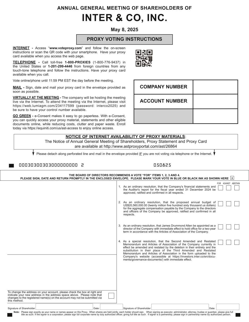 Signature of Shareholder Date: Signature of Shareholder Date: Note: Please sign exactly as your name or names appear on this Proxy. When shares are held jointly, each holder should sign. When signing as executor, administrator, attorney, trustee or guardian, please give full title as such. If the signer is a corporation, please sign full corporate name by duly authorized officer, giving full title as such. If signer is a partnership, please sign in partnership name by authorized person. To change the address on your account, please check the box at right and indicate your new address in the address space above. Please note that changes to the registered name(s) on the account may not be submitted via this method. JOHN SMITH 1234 MAIN STREET APT. 203 NEW YORK, NY 10038 PROXY VOTING INSTRUCTIONS Please detach along perforated line and mail in the envelope provided IF you are not voting via telephone or the Internet. THE BOARD OF DIRECTORS RECOMMENDS A VOTE “FOR” ITEMS 1, 2, 3 AND 4. PLEASE SIGN, DATE AND RETURN PROMPTLY IN THE ENCLOSED ENVELOPE. PLEASE MARK YOUR VOTE IN BLUE OR BLACK INK AS SHOWN HERE x 00030300303000000000 2 050825 COMPANY NUMBER ACCOUNT NUMBER ANNUAL GENERAL MEETING OF SHAREHOLDERS OF INTER & CO, INC. May 8, 2025 NOTICE OF INTERNET AVAILABILITY OF PROXY MATERIALS: The Notice of Annual General Meeting of Shareholders, Proxy Statement and Proxy Card are available at http://www.astproxyportal.com/ast/26864 INTERNET - Access “www.voteproxy.com” and follow the on-screen instructions or scan the QR code with your smartphone. Have your proxy card available when you access the web page. TELEPHONE - Call toll-free 1-800-PROXIES (1-800-776-9437) in the United States or 1-201-299-4446 from foreign countries from any touch-tone telephone and follow the instructions. Have your proxy card available when you call. Vote online/phone until 11:59 PM EST the day before the meeting. MAIL - Sign, date and mail your proxy card in the envelope provided as soon as possible. VIRTUALLY AT THE MEETING - The company will be hosting the meeting live via the Internet. To attend the meeting via the Internet, please visit https://web.lumiagm.com/234117599 (password: interco2025) and be sure to have your control number available. GO GREEN - e-Consent makes it easy to go paperless. With e-Consent, you can quickly access your proxy material, statements and other eligible documents online, while reducing costs, clutter and paper waste. Enroll today via https://equiniti.com/us/ast-access to enjoy online access. 1. As an ordinary resolution, that the Company's financial statements and the Auditor's report for the fiscal year ended 31 December 2024 be approved, ratified and confirmed in all respects. 2. As an ordinary resolution, that the proposed annual budget of US$20,560,000.00 (twenty million five hundred sixty thousand us dollars) for the aggregate compensation payable by the Company to the directors and officers of the Company be approved, ratified and confirmed in all respects. 3. As an ordinary resolution, that James Drummond Allen be appointed as a director of the Company with immediate effect to hold office for a two-year term in accordance with the Articles of Association of the Company. 4. As a special resolution, that the Second Amended and Restated Memorandum and Articles of Association of the Company currently in effect be amended and restated by the deletion in their entirety and the substitution in their place of the Third Amended and Restated Memorandum and Articles of Association in the form uploaded to the Company's website (accessible at https://investors.inter.co/en/docu- ments/governance-documents/) with immediate effect. FOR AGAINST ABSTAIN