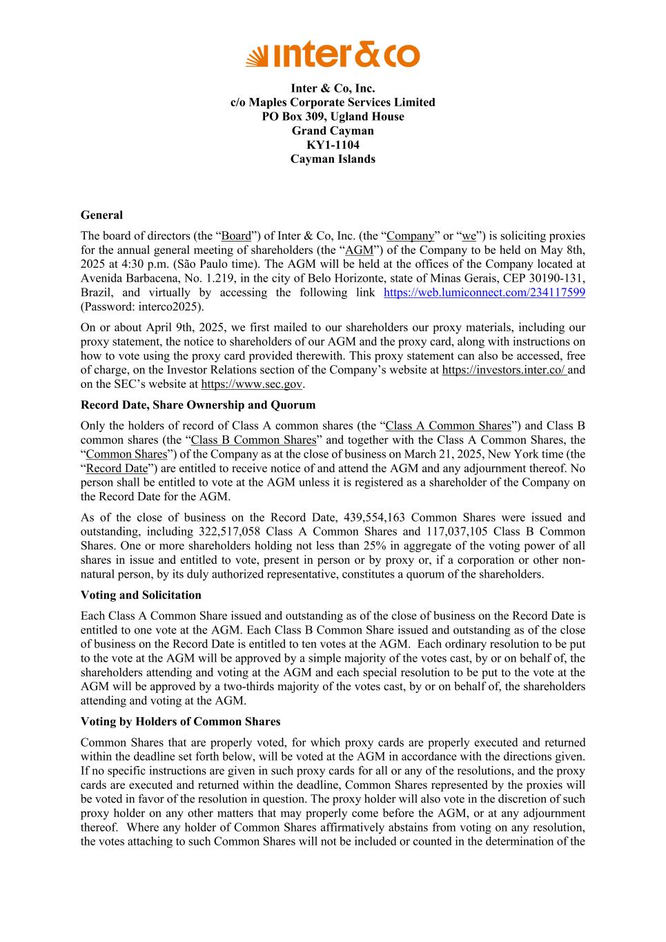 Inter & Co, Inc. c/o Maples Corporate Services Limited PO Box 309, Ugland House Grand Cayman KY1-1104 Cayman Islands General The board of directors (the “Board”) of Inter & Co, Inc. (the “Company” or “we”) is soliciting proxies for the annual general meeting of shareholders (the “AGM”) of the Company to be held on May 8th, 2025 at 4:30 p.m. (São Paulo time). The AGM will be held at the offices of the Company located at Avenida Barbacena, No. 1.219, in the city of Belo Horizonte, state of Minas Gerais, CEP 30190-131, Brazil, and virtually by accessing the following link https://web.lumiconnect.com/234117599 (Password: interco2025). On or about April 9th, 2025, we first mailed to our shareholders our proxy materials, including our proxy statement, the notice to shareholders of our AGM and the proxy card, along with instructions on how to vote using the proxy card provided therewith. This proxy statement can also be accessed, free of charge, on the Investor Relations section of the Company’s website at https://investors.inter.co/ and on the SEC’s website at https://www.sec.gov. Record Date, Share Ownership and Quorum Only the holders of record of Class A common shares (the “Class A Common Shares”) and Class B common shares (the “Class B Common Shares” and together with the Class A Common Shares, the “Common Shares”) of the Company as at the close of business on March 21, 2025, New York time (the “Record Date”) are entitled to receive notice of and attend the AGM and any adjournment thereof. No person shall be entitled to vote at the AGM unless it is registered as a shareholder of the Company on the Record Date for the AGM. As of the close of business on the Record Date, 439,554,163 Common Shares were issued and outstanding, including 322,517,058 Class A Common Shares and 117,037,105 Class B Common Shares. One or more shareholders holding not less than 25% in aggregate of the voting power of all shares in issue and entitled to vote, present in person or by proxy or, if a corporation or other non- natural person, by its duly authorized representative, constitutes a quorum of the shareholders. Voting and Solicitation Each Class A Common Share issued and outstanding as of the close of business on the Record Date is entitled to one vote at the AGM. Each Class B Common Share issued and outstanding as of the close of business on the Record Date is entitled to ten votes at the AGM. Each ordinary resolution to be put to the vote at the AGM will be approved by a simple majority of the votes cast, by or on behalf of, the shareholders attending and voting at the AGM and each special resolution to be put to the vote at the AGM will be approved by a two-thirds majority of the votes cast, by or on behalf of, the shareholders attending and voting at the AGM. Voting by Holders of Common Shares Common Shares that are properly voted, for which proxy cards are properly executed and returned within the deadline set forth below, will be voted at the AGM in accordance with the directions given. If no specific instructions are given in such proxy cards for all or any of the resolutions, and the proxy cards are executed and returned within the deadline, Common Shares represented by the proxies will be voted in favor of the resolution in question. The proxy holder will also vote in the discretion of such proxy holder on any other matters that may properly come before the AGM, or at any adjournment thereof. Where any holder of Common Shares affirmatively abstains from voting on any resolution, the votes attaching to such Common Shares will not be included or counted in the determination of the