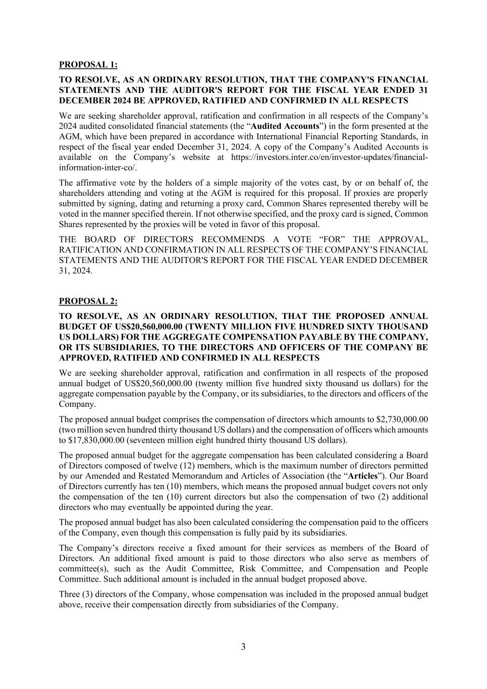 3 PROPOSAL 1: TO RESOLVE, AS AN ORDINARY RESOLUTION, THAT THE COMPANY'S FINANCIAL STATEMENTS AND THE AUDITOR'S REPORT FOR THE FISCAL YEAR ENDED 31 DECEMBER 2024 BE APPROVED, RATIFIED AND CONFIRMED IN ALL RESPECTS We are seeking shareholder approval, ratification and confirmation in all respects of the Company’s 2024 audited consolidated financial statements (the “Audited Accounts”) in the form presented at the AGM, which have been prepared in accordance with International Financial Reporting Standards, in respect of the fiscal year ended December 31, 2024. A copy of the Company’s Audited Accounts is available on the Company’s website at https://investors.inter.co/en/investor-updates/financial- information-inter-co/. The affirmative vote by the holders of a simple majority of the votes cast, by or on behalf of, the shareholders attending and voting at the AGM is required for this proposal. If proxies are properly submitted by signing, dating and returning a proxy card, Common Shares represented thereby will be voted in the manner specified therein. If not otherwise specified, and the proxy card is signed, Common Shares represented by the proxies will be voted in favor of this proposal. THE BOARD OF DIRECTORS RECOMMENDS A VOTE “FOR” THE APPROVAL, RATIFICATION AND CONFIRMATION IN ALL RESPECTS OF THE COMPANY’S FINANCIAL STATEMENTS AND THE AUDITOR'S REPORT FOR THE FISCAL YEAR ENDED DECEMBER 31, 2024. PROPOSAL 2: TO RESOLVE, AS AN ORDINARY RESOLUTION, THAT THE PROPOSED ANNUAL BUDGET OF US$20,560,000.00 (TWENTY MILLION FIVE HUNDRED SIXTY THOUSAND US DOLLARS) FOR THE AGGREGATE COMPENSATION PAYABLE BY THE COMPANY, OR ITS SUBSIDIARIES, TO THE DIRECTORS AND OFFICERS OF THE COMPANY BE APPROVED, RATIFIED AND CONFIRMED IN ALL RESPECTS We are seeking shareholder approval, ratification and confirmation in all respects of the proposed annual budget of US$20,560,000.00 (twenty million five hundred sixty thousand us dollars) for the aggregate compensation payable by the Company, or its subsidiaries, to the directors and officers of the Company. The proposed annual budget comprises the compensation of directors which amounts to $2,730,000.00 (two million seven hundred thirty thousand US dollars) and the compensation of officers which amounts to $17,830,000.00 (seventeen million eight hundred thirty thousand US dollars). The proposed annual budget for the aggregate compensation has been calculated considering a Board of Directors composed of twelve (12) members, which is the maximum number of directors permitted by our Amended and Restated Memorandum and Articles of Association (the “Articles”). Our Board of Directors currently has ten (10) members, which means the proposed annual budget covers not only the compensation of the ten (10) current directors but also the compensation of two (2) additional directors who may eventually be appointed during the year. The proposed annual budget has also been calculated considering the compensation paid to the officers of the Company, even though this compensation is fully paid by its subsidiaries. The Company’s directors receive a fixed amount for their services as members of the Board of Directors. An additional fixed amount is paid to those directors who also serve as members of committee(s), such as the Audit Committee, Risk Committee, and Compensation and People Committee. Such additional amount is included in the annual budget proposed above. Three (3) directors of the Company, whose compensation was included in the proposed annual budget above, receive their compensation directly from subsidiaries of the Company.