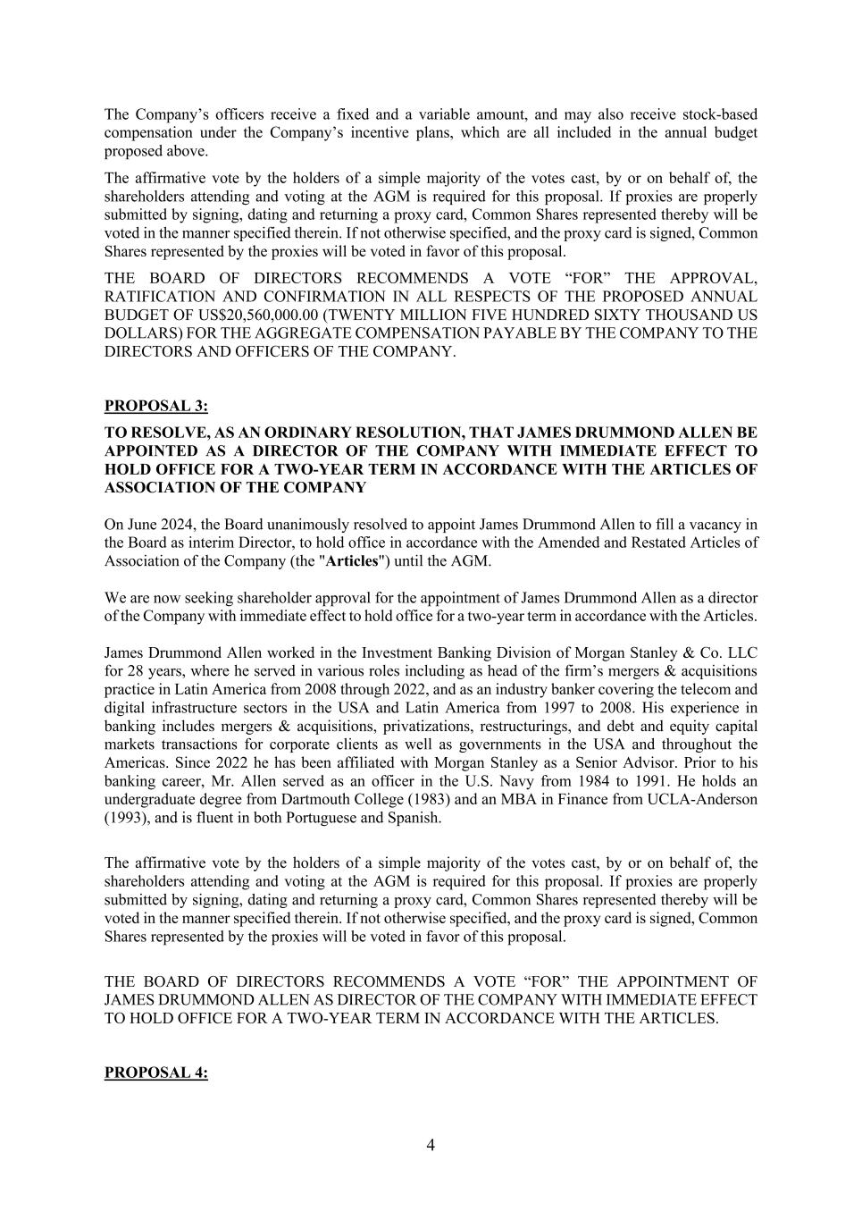 4 The Company’s officers receive a fixed and a variable amount, and may also receive stock-based compensation under the Company’s incentive plans, which are all included in the annual budget proposed above. The affirmative vote by the holders of a simple majority of the votes cast, by or on behalf of, the shareholders attending and voting at the AGM is required for this proposal. If proxies are properly submitted by signing, dating and returning a proxy card, Common Shares represented thereby will be voted in the manner specified therein. If not otherwise specified, and the proxy card is signed, Common Shares represented by the proxies will be voted in favor of this proposal. THE BOARD OF DIRECTORS RECOMMENDS A VOTE “FOR” THE APPROVAL, RATIFICATION AND CONFIRMATION IN ALL RESPECTS OF THE PROPOSED ANNUAL BUDGET OF US$20,560,000.00 (TWENTY MILLION FIVE HUNDRED SIXTY THOUSAND US DOLLARS) FOR THE AGGREGATE COMPENSATION PAYABLE BY THE COMPANY TO THE DIRECTORS AND OFFICERS OF THE COMPANY. PROPOSAL 3: TO RESOLVE, AS AN ORDINARY RESOLUTION, THAT JAMES DRUMMOND ALLEN BE APPOINTED AS A DIRECTOR OF THE COMPANY WITH IMMEDIATE EFFECT TO HOLD OFFICE FOR A TWO-YEAR TERM IN ACCORDANCE WITH THE ARTICLES OF ASSOCIATION OF THE COMPANY On June 2024, the Board unanimously resolved to appoint James Drummond Allen to fill a vacancy in the Board as interim Director, to hold office in accordance with the Amended and Restated Articles of Association of the Company (the "Articles") until the AGM. We are now seeking shareholder approval for the appointment of James Drummond Allen as a director of the Company with immediate effect to hold office for a two-year term in accordance with the Articles. James Drummond Allen worked in the Investment Banking Division of Morgan Stanley & Co. LLC for 28 years, where he served in various roles including as head of the firm’s mergers & acquisitions practice in Latin America from 2008 through 2022, and as an industry banker covering the telecom and digital infrastructure sectors in the USA and Latin America from 1997 to 2008. His experience in banking includes mergers & acquisitions, privatizations, restructurings, and debt and equity capital markets transactions for corporate clients as well as governments in the USA and throughout the Americas. Since 2022 he has been affiliated with Morgan Stanley as a Senior Advisor. Prior to his banking career, Mr. Allen served as an officer in the U.S. Navy from 1984 to 1991. He holds an undergraduate degree from Dartmouth College (1983) and an MBA in Finance from UCLA-Anderson (1993), and is fluent in both Portuguese and Spanish. The affirmative vote by the holders of a simple majority of the votes cast, by or on behalf of, the shareholders attending and voting at the AGM is required for this proposal. If proxies are properly submitted by signing, dating and returning a proxy card, Common Shares represented thereby will be voted in the manner specified therein. If not otherwise specified, and the proxy card is signed, Common Shares represented by the proxies will be voted in favor of this proposal. THE BOARD OF DIRECTORS RECOMMENDS A VOTE “FOR” THE APPOINTMENT OF JAMES DRUMMOND ALLEN AS DIRECTOR OF THE COMPANY WITH IMMEDIATE EFFECT TO HOLD OFFICE FOR A TWO-YEAR TERM IN ACCORDANCE WITH THE ARTICLES. PROPOSAL 4: