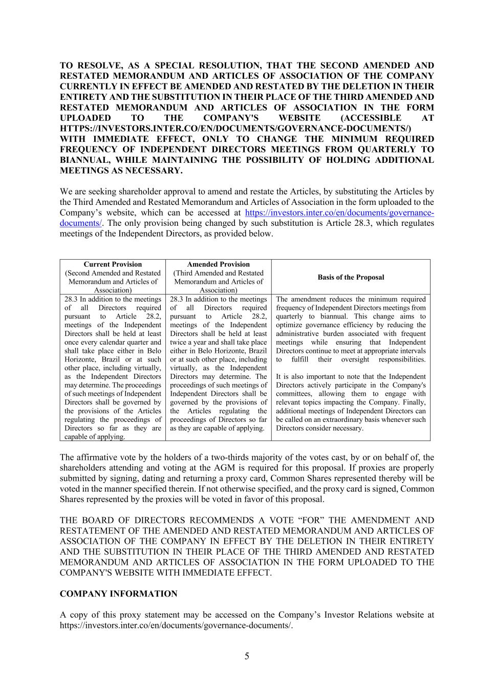 5 TO RESOLVE, AS A SPECIAL RESOLUTION, THAT THE SECOND AMENDED AND RESTATED MEMORANDUM AND ARTICLES OF ASSOCIATION OF THE COMPANY CURRENTLY IN EFFECT BE AMENDED AND RESTATED BY THE DELETION IN THEIR ENTIRETY AND THE SUBSTITUTION IN THEIR PLACE OF THE THIRD AMENDED AND RESTATED MEMORANDUM AND ARTICLES OF ASSOCIATION IN THE FORM UPLOADED TO THE COMPANY'S WEBSITE (ACCESSIBLE AT HTTPS://INVESTORS.INTER.CO/EN/DOCUMENTS/GOVERNANCE-DOCUMENTS/) WITH IMMEDIATE EFFECT, ONLY TO CHANGE THE MINIMUM REQUIRED FREQUENCY OF INDEPENDENT DIRECTORS MEETINGS FROM QUARTERLY TO BIANNUAL, WHILE MAINTAINING THE POSSIBILITY OF HOLDING ADDITIONAL MEETINGS AS NECESSARY. We are seeking shareholder approval to amend and restate the Articles, by substituting the Articles by the Third Amended and Restated Memorandum and Articles of Association in the form uploaded to the Company’s website, which can be accessed at https://investors.inter.co/en/documents/governance- documents/. The only provision being changed by such substitution is Article 28.3, which regulates meetings of the Independent Directors, as provided below. Current Provision (Second Amended and Restated Memorandum and Articles of Association) Amended Provision (Third Amended and Restated Memorandum and Articles of Association) Basis of the Proposal 28.3 In addition to the meetings of all Directors required pursuant to Article 28.2, meetings of the Independent Directors shall be held at least once every calendar quarter and shall take place either in Belo Horizonte, Brazil or at such other place, including virtually, as the Independent Directors may determine. The proceedings of such meetings of Independent Directors shall be governed by the provisions of the Articles regulating the proceedings of Directors so far as they are capable of applying. 28.3 In addition to the meetings of all Directors required pursuant to Article 28.2, meetings of the Independent Directors shall be held at least twice a year and shall take place either in Belo Horizonte, Brazil or at such other place, including virtually, as the Independent Directors may determine. The proceedings of such meetings of Independent Directors shall be governed by the provisions of the Articles regulating the proceedings of Directors so far as they are capable of applying. The amendment reduces the minimum required frequency of Independent Directors meetings from quarterly to biannual. This change aims to optimize governance efficiency by reducing the administrative burden associated with frequent meetings while ensuring that Independent Directors continue to meet at appropriate intervals to fulfill their oversight responsibilities. It is also important to note that the Independent Directors actively participate in the Company's committees, allowing them to engage with relevant topics impacting the Company. Finally, additional meetings of Independent Directors can be called on an extraordinary basis whenever such Directors consider necessary. The affirmative vote by the holders of a two-thirds majority of the votes cast, by or on behalf of, the shareholders attending and voting at the AGM is required for this proposal. If proxies are properly submitted by signing, dating and returning a proxy card, Common Shares represented thereby will be voted in the manner specified therein. If not otherwise specified, and the proxy card is signed, Common Shares represented by the proxies will be voted in favor of this proposal. THE BOARD OF DIRECTORS RECOMMENDS A VOTE “FOR” THE AMENDMENT AND RESTATEMENT OF THE AMENDED AND RESTATED MEMORANDUM AND ARTICLES OF ASSOCIATION OF THE COMPANY IN EFFECT BY THE DELETION IN THEIR ENTIRETY AND THE SUBSTITUTION IN THEIR PLACE OF THE THIRD AMENDED AND RESTATED MEMORANDUM AND ARTICLES OF ASSOCIATION IN THE FORM UPLOADED TO THE COMPANY'S WEBSITE WITH IMMEDIATE EFFECT. COMPANY INFORMATION A copy of this proxy statement may be accessed on the Company’s Investor Relations website at https://investors.inter.co/en/documents/governance-documents/.