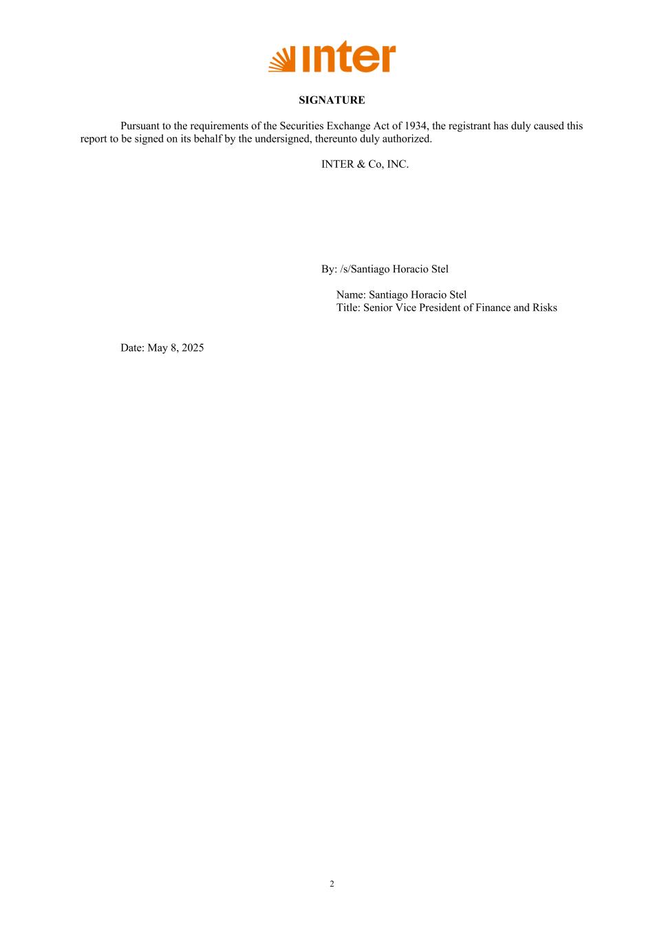 2 SIGNATURE Pursuant to the requirements of the Securities Exchange Act of 1934, the registrant has duly caused this report to be signed on its behalf by the undersigned, thereunto duly authorized. INTER & Co, INC. By: /s/Santiago Horacio Stel Name: Santiago Horacio Stel Title: Senior Vice President of Finance and Risks Date: May 8, 2025