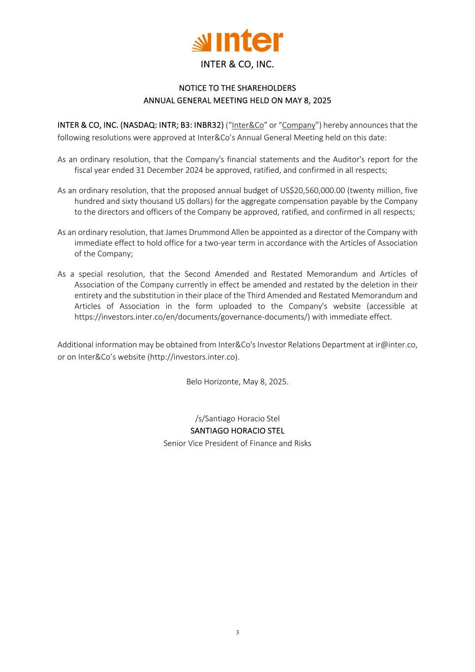 3 INTER & CO, INC. NOTICE TO THE SHAREHOLDERS ANNUAL GENERAL MEETING HELD ON MAY 8, 2025 INTER & CO, INC. (NASDAQ: INTR; B3: INBR32) (“Inter&Co” or “Company”) hereby announces that the following resolutions were approved at Inter&Co’s Annual General Meeting held on this date: As an ordinary resolution, that the Company's financial statements and the Auditor's report for the fiscal year ended 31 December 2024 be approved, ratified, and confirmed in all respects; As an ordinary resolution, that the proposed annual budget of US$20,560,000.00 (twenty million, five hundred and sixty thousand US dollars) for the aggregate compensation payable by the Company to the directors and officers of the Company be approved, ratified, and confirmed in all respects; As an ordinary resolution, that James Drummond Allen be appointed as a director of the Company with immediate effect to hold office for a two-year term in accordance with the Articles of Association of the Company; As a special resolution, that the Second Amended and Restated Memorandum and Articles of Association of the Company currently in effect be amended and restated by the deletion in their entirety and the substitution in their place of the Third Amended and Restated Memorandum and Articles of Association in the form uploaded to the Company's website (accessible at https://investors.inter.co/en/documents/governance-documents/) with immediate effect. Additional information may be obtained from Inter&Co's Investor Relations Department at ir@inter.co, or on Inter&Co’s website (http://investors.inter.co). Belo Horizonte, May 8, 2025. /s/Santiago Horacio Stel SANTIAGO HORACIO STEL Senior Vice President of Finance and Risks