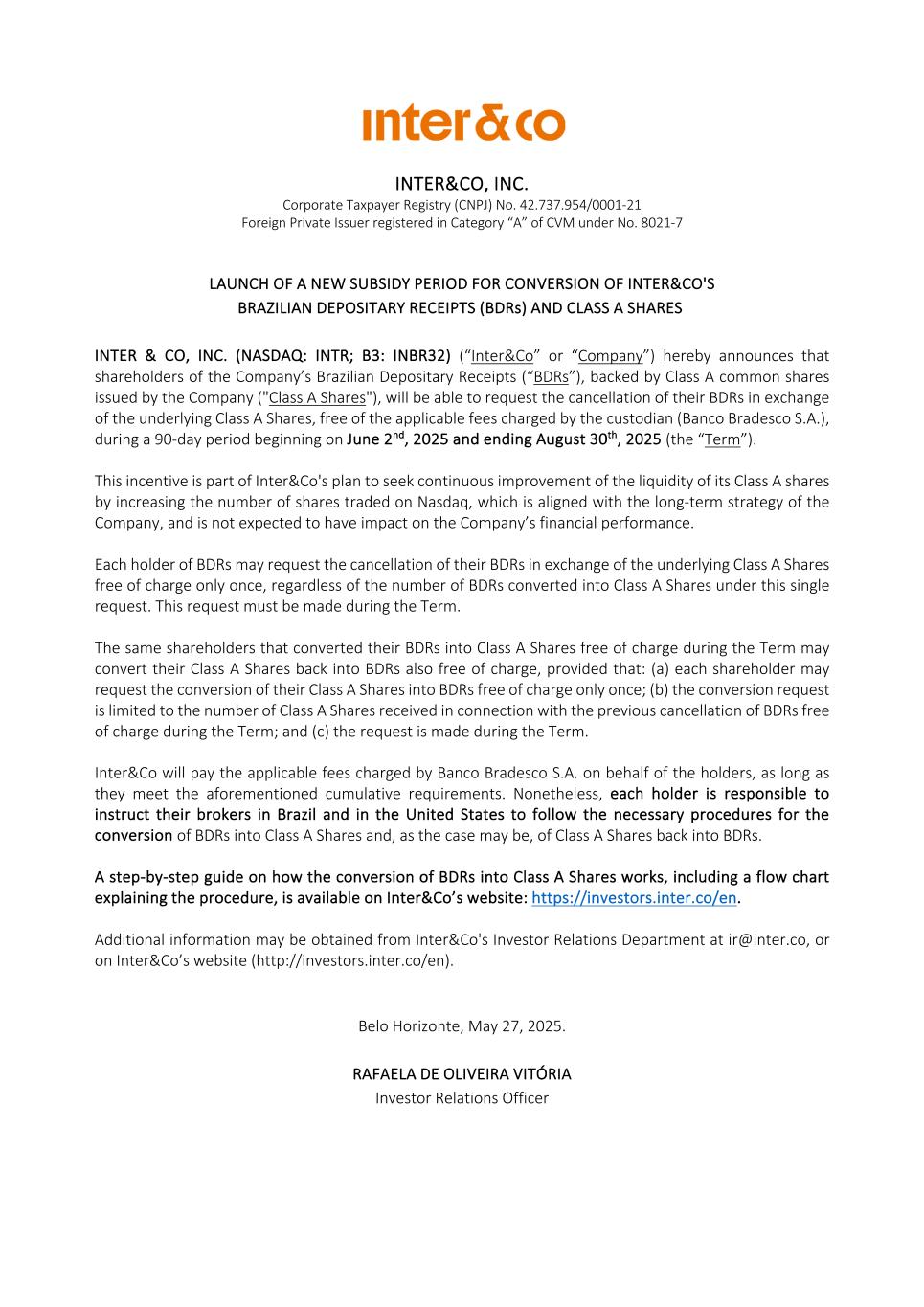 INTER&CO, INC. Corporate Taxpayer Registry (CNPJ) No. 42.737.954/0001-21 Foreign Private Issuer registered in Category “A” of CVM under No. 8021-7 LAUNCH OF A NEW SUBSIDY PERIOD FOR CONVERSION OF INTER&CO'S BRAZILIAN DEPOSITARY RECEIPTS (BDRs) AND CLASS A SHARES INTER & CO, INC. (NASDAQ: INTR; B3: INBR32) (“Inter&Co” or “Company”) hereby announces that shareholders of the Company’s Brazilian Depositary Receipts (“BDRs”), backed by Class A common shares issued by the Company ("Class A Shares"), will be able to request the cancellation of their BDRs in exchange of the underlying Class A Shares, free of the applicable fees charged by the custodian (Banco Bradesco S.A.), during a 90-day period beginning on June 2nd, 2025 and ending August 30th, 2025 (the “Term”). This incentive is part of Inter&Co's plan to seek continuous improvement of the liquidity of its Class A shares by increasing the number of shares traded on Nasdaq, which is aligned with the long-term strategy of the Company, and is not expected to have impact on the Company’s financial performance. Each holder of BDRs may request the cancellation of their BDRs in exchange of the underlying Class A Shares free of charge only once, regardless of the number of BDRs converted into Class A Shares under this single request. This request must be made during the Term. The same shareholders that converted their BDRs into Class A Shares free of charge during the Term may convert their Class A Shares back into BDRs also free of charge, provided that: (a) each shareholder may request the conversion of their Class A Shares into BDRs free of charge only once; (b) the conversion request is limited to the number of Class A Shares received in connection with the previous cancellation of BDRs free of charge during the Term; and (c) the request is made during the Term. Inter&Co will pay the applicable fees charged by Banco Bradesco S.A. on behalf of the holders, as long as they meet the aforementioned cumulative requirements. Nonetheless, each holder is responsible to instruct their brokers in Brazil and in the United States to follow the necessary procedures for the conversion of BDRs into Class A Shares and, as the case may be, of Class A Shares back into BDRs. A step-by-step guide on how the conversion of BDRs into Class A Shares works, including a flow chart explaining the procedure, is available on Inter&Co’s website: https://investors.inter.co/en. Additional information may be obtained from Inter&Co's Investor Relations Department at ir@inter.co, or on Inter&Co’s website (http://investors.inter.co/en). Belo Horizonte, May 27, 2025. RAFAELA DE OLIVEIRA VITÓRIA Investor Relations Officer