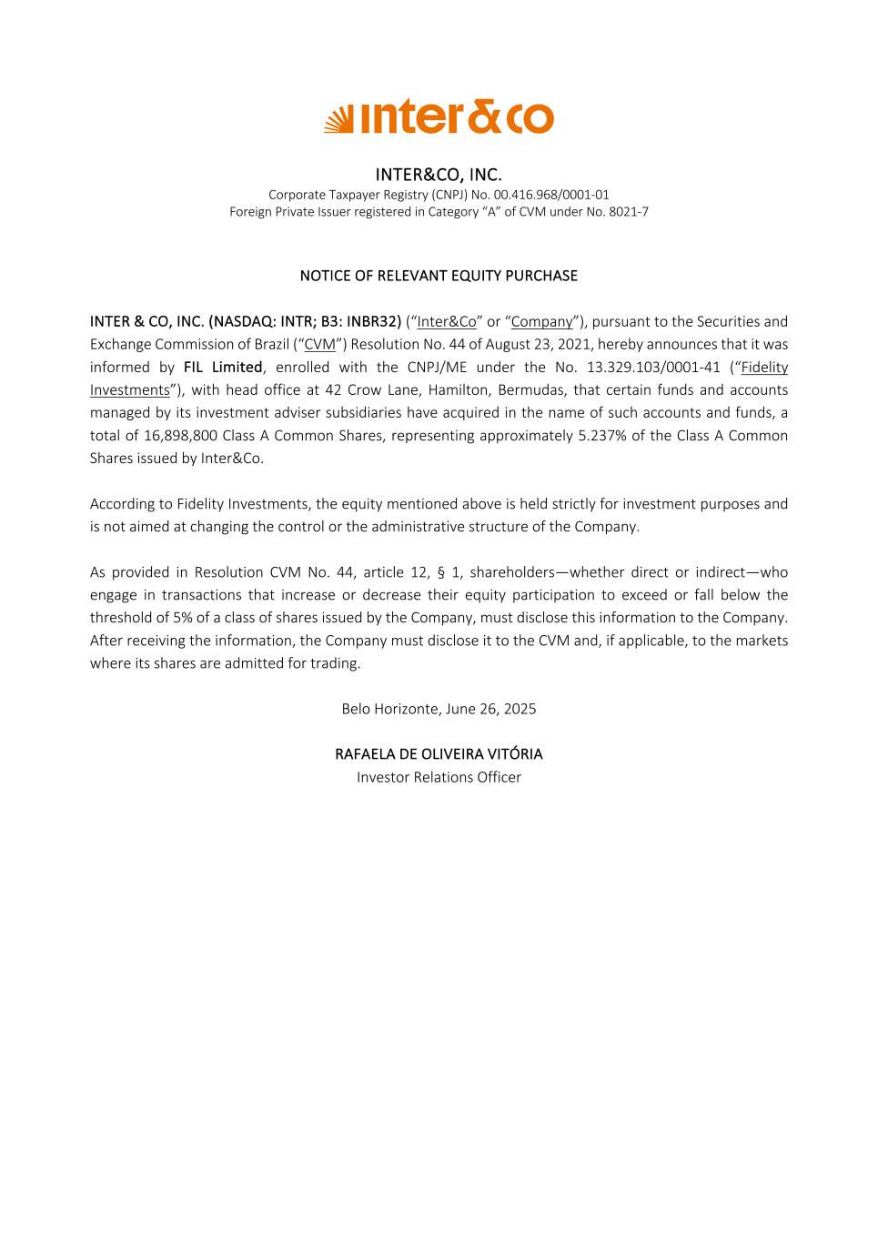 INTER&CO, INC. Corporate Taxpayer Registry (CNPJ) No. 00.416.968/0001-01 Foreign Private Issuer registered in Category “A” of CVM under No. 8021-7 NOTICE OF RELEVANT EQUITY PURCHASE INTER & CO, INC. (NASDAQ: INTR; B3: INBR32) (“Inter&Co” or “Company”), pursuant to the Securities and Exchange Commission of Brazil (“CVM”) Resolution No. 44 of August 23, 2021, hereby announces that it was informed by FIL Limited, enrolled with the CNPJ/ME under the No. 13.329.103/0001-41 (“Fidelity Investments”), with head office at 42 Crow Lane, Hamilton, Bermudas, that certain funds and accounts managed by its investment adviser subsidiaries have acquired in the name of such accounts and funds, a total of 16,898,800 Class A Common Shares, representing approximately 5.237% of the Class A Common Shares issued by Inter&Co. According to Fidelity Investments, the equity mentioned above is held strictly for investment purposes and is not aimed at changing the control or the administrative structure of the Company. As provided in Resolution CVM No. 44, article 12, § 1, shareholders—whether direct or indirect—who engage in transactions that increase or decrease their equity participation to exceed or fall below the threshold of 5% of a class of shares issued by the Company, must disclose this information to the Company. After receiving the information, the Company must disclose it to the CVM and, if applicable, to the markets where its shares are admitted for trading. Belo Horizonte, June 26, 2025 RAFAELA DE OLIVEIRA VITÓRIA Investor Relations Officer