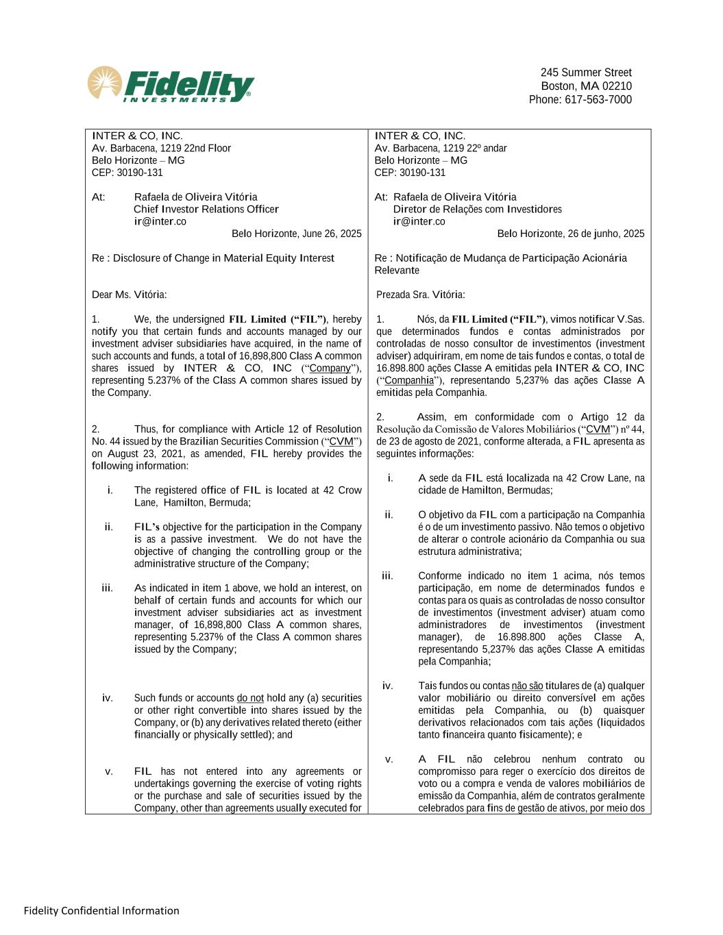 245 Summer Street Boston, MA 02210 Phone: 617-563-7000 Fidelity Confidential Information INTER & CO, INC. Av. Barbacena, 1219 22nd Floor Belo Horizonte – MG CEP: 30190-131 At: Rafaela de Oliveira Vitória Chief Investor Relations Officer ir@inter.co Belo Horizonte, June 26, 2025 Re : Disclosure of Change in Material Equity Interest Dear Ms. Vitória: 1. We, the undersigned FIL Limited (“FIL”), hereby notify you that certain funds and accounts managed by our investment adviser subsidiaries have acquired, in the name of such accounts and funds, a total of 16,898,800 Class A common shares issued by INTER & CO, INC (“Company”), representing 5.237% of the Class A common shares issued by the Company. 2. Thus, for compliance with Article 12 of Resolution No. 44 issued by the Brazilian Securities Commission (“CVM”) on August 23, 2021, as amended, FIL hereby provides the following information: i. The registered office of FIL is located at 42 Crow Lane, Hamilton, Bermuda; ii. FIL’s objective for the participation in the Company is as a passive investment. We do not have the objective of changing the controlling group or the administrative structure of the Company; iii. As indicated in item 1 above, we hold an interest, on behalf of certain funds and accounts for which our investment adviser subsidiaries act as investment manager, of 16,898,800 Class A common shares, representing 5.237% of the Class A common shares issued by the Company; iv. Such funds or accounts do not hold any (a) securities or other right convertible into shares issued by the Company, or (b) any derivatives related thereto (either financially or physically settled); and v. FIL has not entered into any agreements or undertakings governing the exercise of voting rights or the purchase and sale of securities issued by the Company, other than agreements usually executed for INTER & CO, INC. Av. Barbacena, 1219 22º andar Belo Horizonte – MG CEP: 30190-131 At: Rafaela de Oliveira Vitória Diretor de Relações com Investidores ir@inter.co Belo Horizonte, 26 de junho, 2025 Re : Notificação de Mudança de Participação Acionária Relevante Prezada Sra. Vitória: 1. Nós, da FIL Limited (“FIL”), vimos notificar V.Sas. que determinados fundos e contas administrados por controladas de nosso consultor de investimentos (investment adviser) adquiriram, em nome de tais fundos e contas, o total de 16.898.800 ações Classe A emitidas pela INTER & CO, INC (“Companhia”), representando 5,237% das ações Classe A emitidas pela Companhia. 2. Assim, em conformidade com o Artigo 12 da Resolução da Comissão de Valores Mobiliários (“CVM”) nº 44, de 23 de agosto de 2021, conforme alterada, a FIL apresenta as seguintes informações: i. A sede da FIL está localizada na 42 Crow Lane, na cidade de Hamilton, Bermudas; ii. O objetivo da FIL com a participação na Companhia é o de um investimento passivo. Não temos o objetivo de alterar o controle acionário da Companhia ou sua estrutura administrativa; iii. Conforme indicado no item 1 acima, nós temos participação, em nome de determinados fundos e contas para os quais as controladas de nosso consultor de investimentos (investment adviser) atuam como administradores de investimentos (investment manager), de 16.898.800 ações Classe A, representando 5,237% das ações Classe A emitidas pela Companhia; iv. Tais fundos ou contas não são titulares de (a) qualquer valor mobiliário ou direito conversível em ações emitidas pela Companhia, ou (b) quaisquer derivativos relacionados com tais ações (liquidados tanto financeira quanto fisicamente); e v. A FIL não celebrou nenhum contrato ou compromisso para reger o exercício dos direitos de voto ou a compra e venda de valores mobiliários de emissão da Companhia, além de contratos geralmente celebrados para fins de gestão de ativos, por meio dos