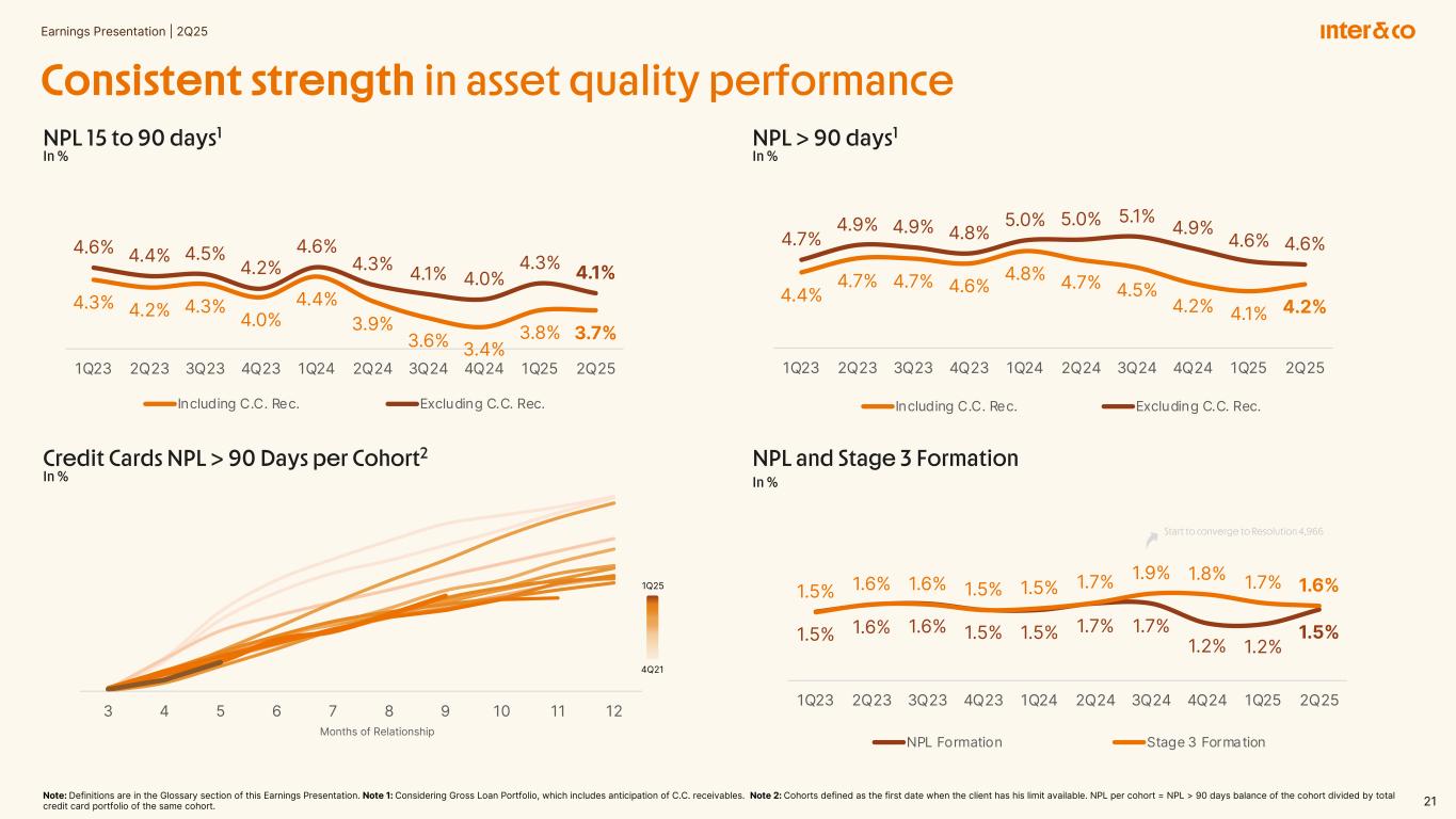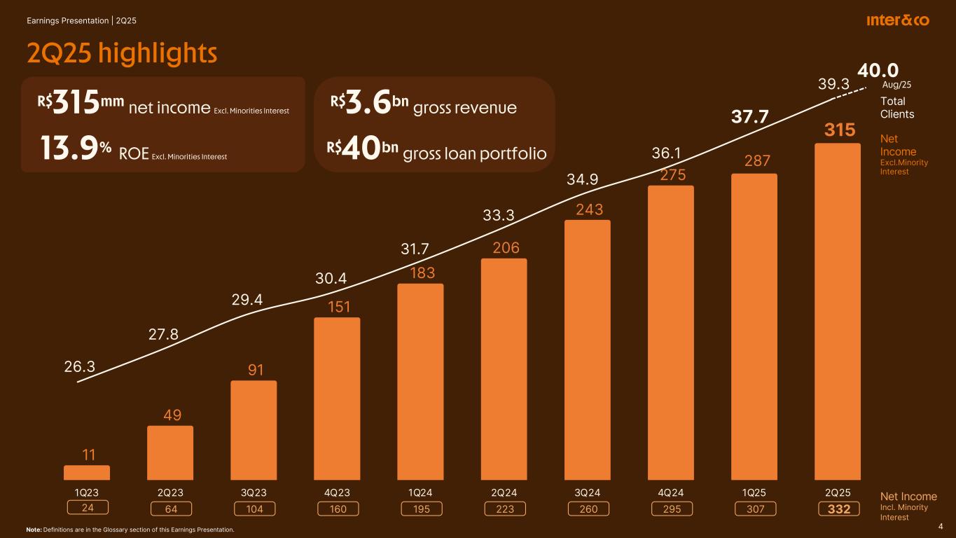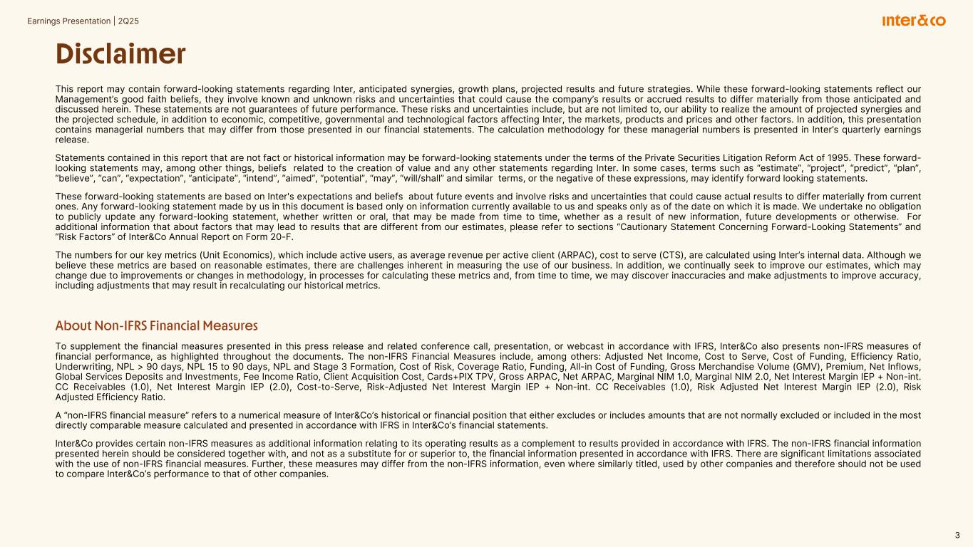 3 Earnings Presentation | 2Q25 This report may contain forward-looking statements regarding Inter, anticipated synergies, growth plans, projected results and future strategies. While these forward-looking statements reflect our Management’s good faith beliefs, they involve known and unknown risks and uncertainties that could cause the company’s results or accrued results to differ materially from those anticipated and discussed herein. These statements are not guarantees of future performance. These risks and uncertainties include, but are not limited to, our ability to realize the amount of projected synergies and the projected schedule, in addition to economic, competitive, governmental and technological factors affecting Inter, the markets, products and prices and other factors. In addition, this presentation contains managerial numbers that may differ from those presented in our financial statements. The calculation methodology for these managerial numbers is presented in Inter’s quarterly earnings release. Statements contained in this report that are not fact or historical information may be forward-looking statements under the terms of the Private Securities Litigation Reform Act of 1995. These forward- looking statements may, among other things, beliefs related to the creation of value and any other statements regarding Inter. In some cases, terms such as “estimate”, “project”, “predict”, “plan”, “believe”, “can”, “expectation”, “anticipate”, “intend”, “aimed”, “potential”, “may”, “will/shall” and similar terms, or the negative of these expressions, may identify forward looking statements. These forward-looking statements are based on Inter's expectations and beliefs about future events and involve risks and uncertainties that could cause actual results to differ materially from current ones. Any forward-looking statement made by us in this document is based only on information currently available to us and speaks only as of the date on which it is made. We undertake no obligation to publicly update any forward-looking statement, whether written or oral, that may be made from time to time, whether as a result of new information, future developments or otherwise. For additional information that about factors that may lead to results that are different from our estimates, please refer to sections “Cautionary Statement Concerning Forward-Looking Statements” and “Risk Factors” of Inter&Co Annual Report on Form 20-F. The numbers for our key metrics (Unit Economics), which include active users, as average revenue per active client (ARPAC), cost to serve (CTS), are calculated using Inter’s internal data. Although we believe these metrics are based on reasonable estimates, there are challenges inherent in measuring the use of our business. In addition, we continually seek to improve our estimates, which may change due to improvements or changes in methodology, in processes for calculating these metrics and, from time to time, we may discover inaccuracies and make adjustments to improve accuracy, including adjustments that may result in recalculating our historical metrics. About Non-IFRS Financial Measures To supplement the financial measures presented in this press release and related conference call, presentation, or webcast in accordance with IFRS, Inter&Co also presents non-IFRS measures of financial performance, as highlighted throughout the documents. The non-IFRS Financial Measures include, among others: Adjusted Net Income, Cost to Serve, Cost of Funding, Efficiency Ratio, Underwriting, NPL > 90 days, NPL 15 to 90 days, NPL and Stage 3 Formation, Cost of Risk, Coverage Ratio, Funding, All-in Cost of Funding, Gross Merchandise Volume (GMV), Premium, Net Inflows, Global Services Deposits and Investments, Fee Income Ratio, Client Acquisition Cost, Cards+PIX TPV, Gross ARPAC, Net ARPAC, Marginal NIM 1.0, Marginal NIM 2.0, Net Interest Margin IEP + Non-int. CC Receivables (1.0), Net Interest Margin IEP (2.0), Cost-to-Serve, Risk-Adjusted Net Interest Margin IEP + Non-int. CC Receivables (1.0), Risk Adjusted Net Interest Margin IEP (2.0), Risk Adjusted Efficiency Ratio. A “non-IFRS financial measure” refers to a numerical measure of Inter&Co’s historical or financial position that either excludes or includes amounts that are not normally excluded or included in the most directly comparable measure calculated and presented in accordance with IFRS in Inter&Co’s financial statements. Inter&Co provides certain non-IFRS measures as additional information relating to its operating results as a complement to results provided in accordance with IFRS. The non-IFRS financial information presented herein should be considered together with, and not as a substitute for or superior to, the financial information presented in accordance with IFRS. There are significant limitations associated with the use of non-IFRS financial measures. Further, these measures may differ from the non-IFRS information, even where similarly titled, used by other companies and therefore should not be used to compare Inter&Co’s performance to that of other companies. Disclaimer