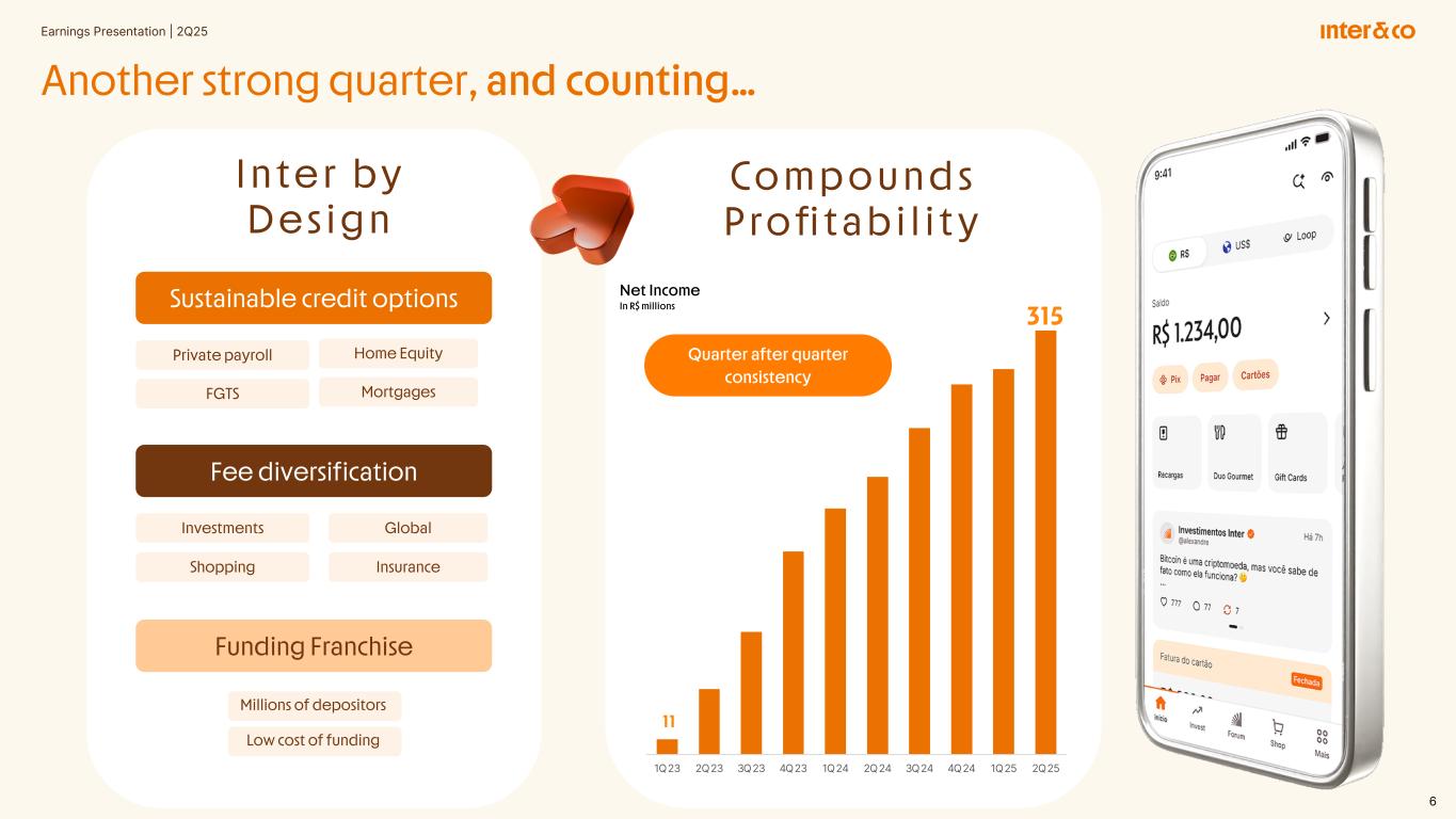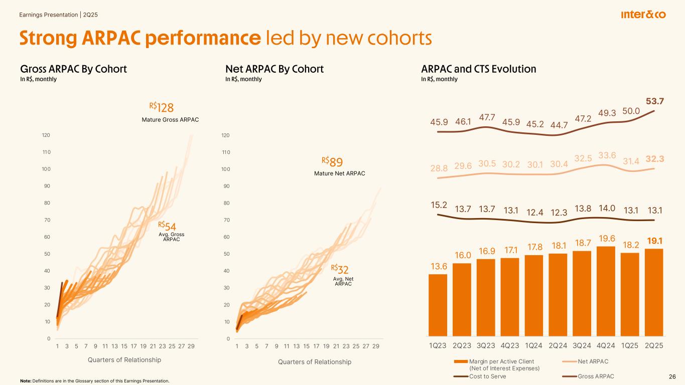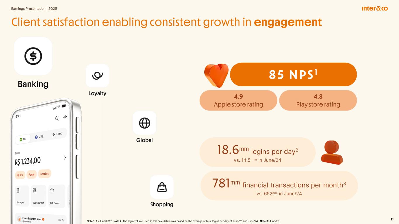 3 Earnings Presentation | 2Q25 This report may contain forward-looking statements regarding Inter, anticipated synergies, growth plans, projected results and future strategies. While these forward-looking statements reflect our Management’s good faith beliefs, they involve known and unknown risks and uncertainties that could cause the company’s results or accrued results to differ materially from those anticipated and discussed herein. These statements are not guarantees of future performance. These risks and uncertainties include, but are not limited to, our ability to realize the amount of projected synergies and the projected schedule, in addition to economic, competitive, governmental and technological factors affecting Inter, the markets, products and prices and other factors. In addition, this presentation contains managerial numbers that may differ from those presented in our financial statements. The calculation methodology for these managerial numbers is presented in Inter’s quarterly earnings release. Statements contained in this report that are not fact or historical information may be forward-looking statements under the terms of the Private Securities Litigation Reform Act of 1995. These forward- looking statements may, among other things, beliefs related to the creation of value and any other statements regarding Inter. In some cases, terms such as “estimate”, “project”, “predict”, “plan”, “believe”, “can”, “expectation”, “anticipate”, “intend”, “aimed”, “potential”, “may”, “will/shall” and similar terms, or the negative of these expressions, may identify forward looking statements. These forward-looking statements are based on Inter's expectations and beliefs about future events and involve risks and uncertainties that could cause actual results to differ materially from current ones. Any forward-looking statement made by us in this document is based only on information currently available to us and speaks only as of the date on which it is made. We undertake no obligation to publicly update any forward-looking statement, whether written or oral, that may be made from time to time, whether as a result of new information, future developments or otherwise. For additional information that about factors that may lead to results that are different from our estimates, please refer to sections “Cautionary Statement Concerning Forward-Looking Statements” and “Risk Factors” of Inter&Co Annual Report on Form 20-F. The numbers for our key metrics (Unit Economics), which include active users, as average revenue per active client (ARPAC), cost to serve (CTS), are calculated using Inter’s internal data. Although we believe these metrics are based on reasonable estimates, there are challenges inherent in measuring the use of our business. In addition, we continually seek to improve our estimates, which may change due to improvements or changes in methodology, in processes for calculating these metrics and, from time to time, we may discover inaccuracies and make adjustments to improve accuracy, including adjustments that may result in recalculating our historical metrics. About Non-IFRS Financial Measures To supplement the financial measures presented in this press release and related conference call, presentation, or webcast in accordance with IFRS, Inter&Co also presents non-IFRS measures of financial performance, as highlighted throughout the documents. The non-IFRS Financial Measures include, among others: Adjusted Net Income, Cost to Serve, Cost of Funding, Efficiency Ratio, Underwriting, NPL > 90 days, NPL 15 to 90 days, NPL and Stage 3 Formation, Cost of Risk, Coverage Ratio, Funding, All-in Cost of Funding, Gross Merchandise Volume (GMV), Premium, Net Inflows, Global Services Deposits and Investments, Fee Income Ratio, Client Acquisition Cost, Cards+PIX TPV, Gross ARPAC, Net ARPAC, Marginal NIM 1.0, Marginal NIM 2.0, Net Interest Margin IEP + Non-int. CC Receivables (1.0), Net Interest Margin IEP (2.0), Cost-to-Serve, Risk-Adjusted Net Interest Margin IEP + Non-int. CC Receivables (1.0), Risk Adjusted Net Interest Margin IEP (2.0), Risk Adjusted Efficiency Ratio. A “non-IFRS financial measure” refers to a numerical measure of Inter&Co’s historical or financial position that either excludes or includes amounts that are not normally excluded or included in the most directly comparable measure calculated and presented in accordance with IFRS in Inter&Co’s financial statements. Inter&Co provides certain non-IFRS measures as additional information relating to its operating results as a complement to results provided in accordance with IFRS. The non-IFRS financial information presented herein should be considered together with, and not as a substitute for or superior to, the financial information presented in accordance with IFRS. There are significant limitations associated with the use of non-IFRS financial measures. Further, these measures may differ from the non-IFRS information, even where similarly titled, used by other companies and therefore should not be used to compare Inter&Co’s performance to that of other companies. Disclaimer