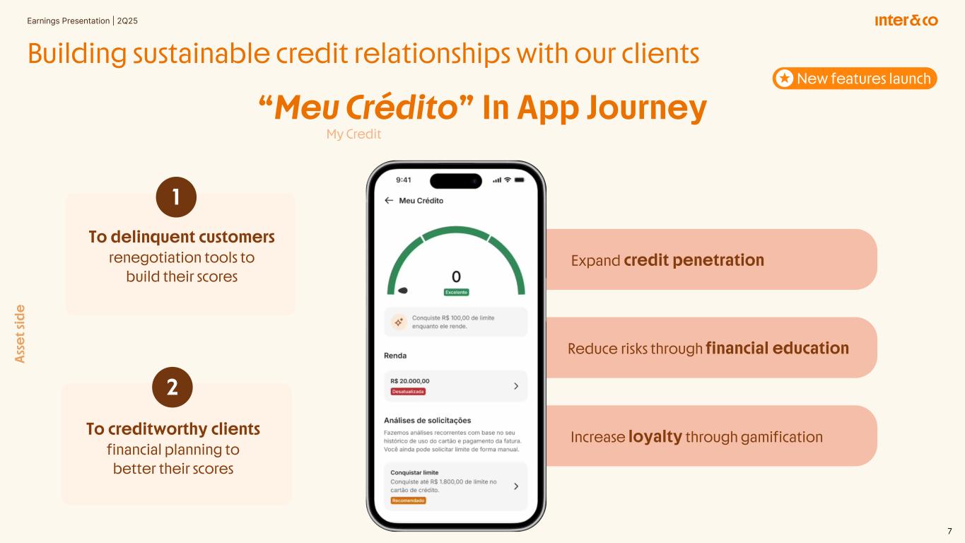 6 Earnings Presentation | 2Q25 11 315 - 5 0 1 0 1 50 2 0 2 50 3 0 1Q23 2Q23 3Q23 4Q23 1Q24 2Q24 3Q24 4Q24 1Q25 2Q25 I n t e r b y D e s i g n Private payroll FGTS Home Equity Mortgages Fee diversification Sustainable credit options Investments Shopping Global Insurance Another strong quarter, and counting… Co m p o u n d s P r o fi t a b i l i t y Quarter after quarter consistency Net Income In R$ millions Funding Franchise Millions of depositors Low cost of funding