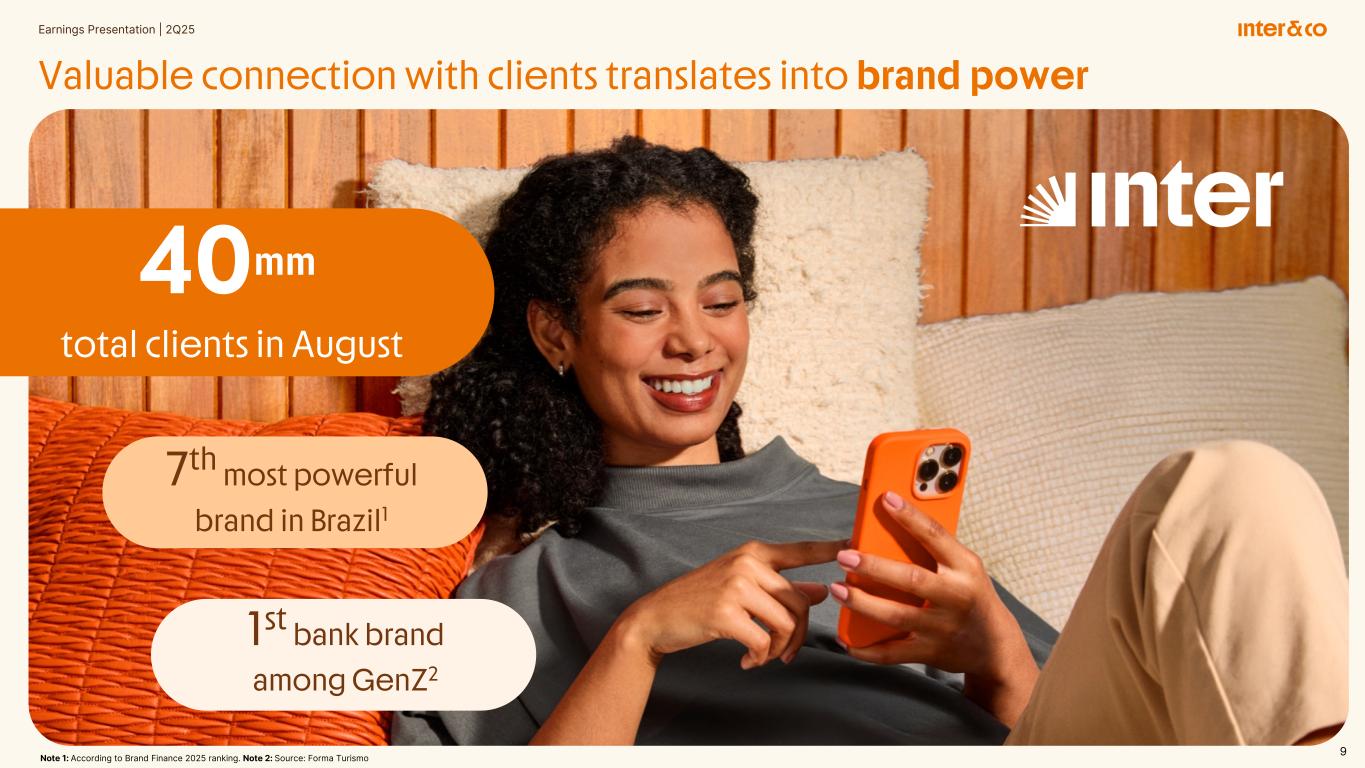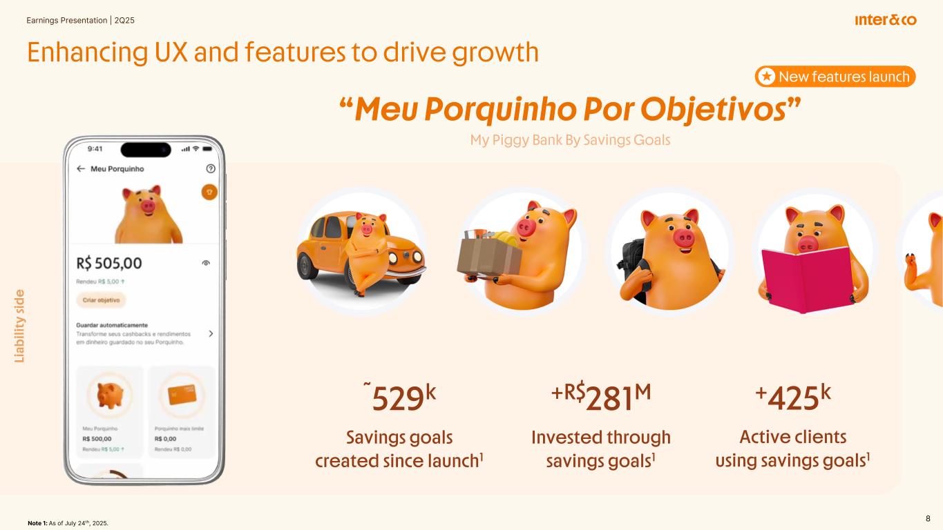 8 Earnings Presentation | 2Q25 “Meu Porquinho Por Objetivos” My Piggy Bank By Savings Goals ˜529k Savings goals created since launch1 +R$281M Invested through savings goals1 +425k Active clients using savings goals1 Enhancing UX and features to drive growth New features launch Li ab ili ty si d e Note 1: As of July 24th, 2025.