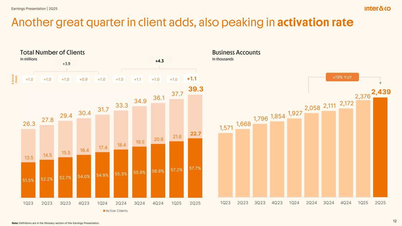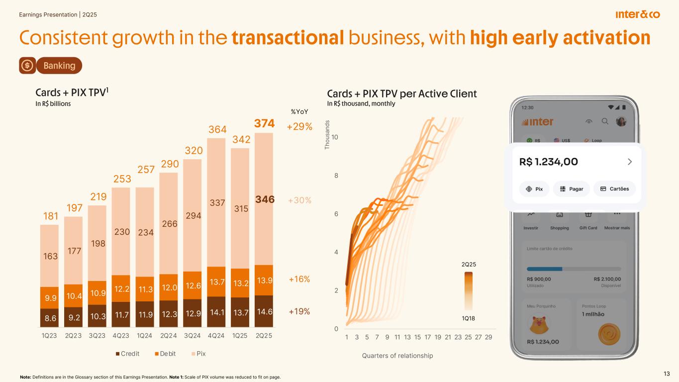 12 Earnings Presentation | 2Q25 1,571 1,668 1,796 1,854 1,927 2,058 2,111 2,172 2,376 2,439 1 5 0 1 1 ,0 01 1 ,5 01 2 ,0 0 1 2 ,5 01 1Q23 2Q23 3Q23 4Q23 1Q24 2Q24 3Q24 4Q24 1Q25 2Q25 +1.0 +1.0 +1.0 +0.9 +1.0 +1.0 +1.1 +1.0 +1.0 +1.1 0 0.5 1 1.5 +19% YoY 51.5% 52.2% 52.7% 54.0% 54.9% 55.3% 55.9% 56.9% 57.2% 57.7% 13.5 14.5 15.5 16.4 17.4 18.4 19.5 20.6 21.6 22.7 26.3 27.8 29.4 30.4 31.7 33.3 34.9 36.1 37.7 39.3 - 5 .0 1 0. 1 5.0 2 0. 2 5.0 3 0. 3 5.0 4 0. 1Q23 2Q23 3Q23 4Q23 1Q24 2Q24 3Q24 4Q24 1Q25 2Q25 Active Clients Δ A ct iv e cl ie nt s Total Number of Clients In millions Business Accounts In thousands Note: Definitions are in the Glossary section of this Earnings Presentation. +3.9 +4.3 Another great quarter in client adds, also peaking in activation rate