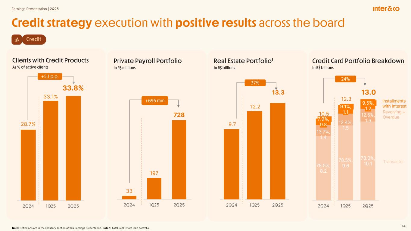 13 Earnings Presentation | 2Q25 Cards + PIX TPV per Active Client In R$ thousand, monthly Cards + PIX TPV1 In R$ billions Note: Definitions are in the Glossary section of this Earnings Presentation. Note 1: Scale of PIX volume was reduced to fit on page. %YoY +29% +16% +19% 8.6 9.2 10.3 11.7 11.9 12.3 12.9 14.1 13.7 14.6 9.9 10.4 10.9 12.2 11.3 12.0 12.6 13.7 13.2 13.9 163 177 198 230 234 266 294 337 315 346 181 197 219 253 257 290 320 364 342 374 - 1 0. 0 2 0 .0 3 0 .0 4 0 .0 5 0 .0 6 0 .0 7 0 .0 8 0 .0 9 0 .0 1Q23 2Q23 3Q23 4Q23 1Q24 2Q24 3Q24 4Q24 1Q25 2Q25 Credit Debit Pix Quarters of relationship +30% 0 2 4 6 8 10 1 3 5 7 9 11 13 15 17 19 21 23 25 27 29 Th ou sa nd s Consistent growth in the transactional business, with high early activation Banking 2Q25 1Q18