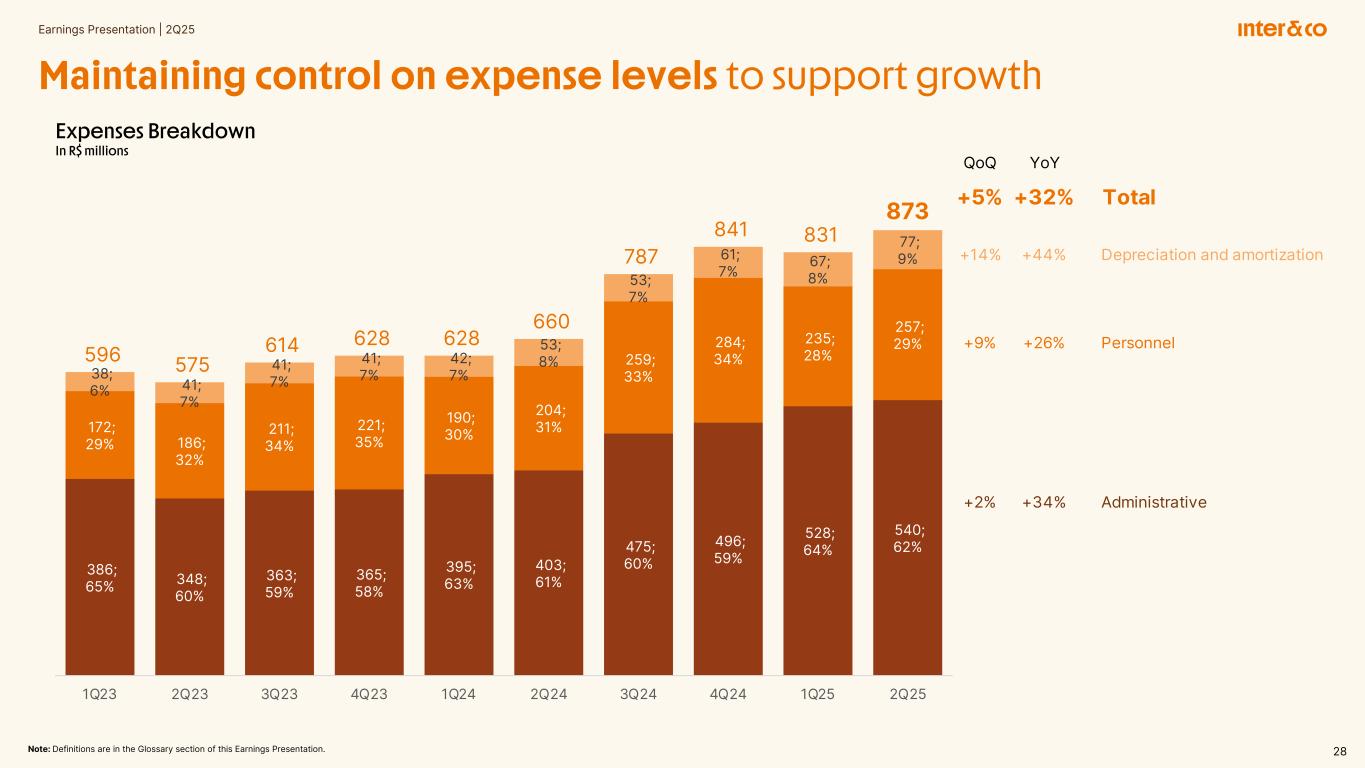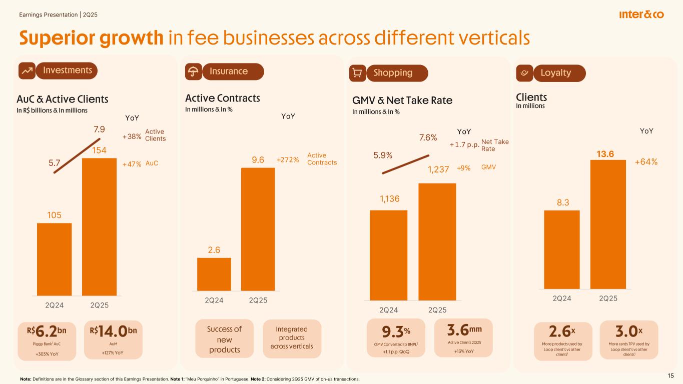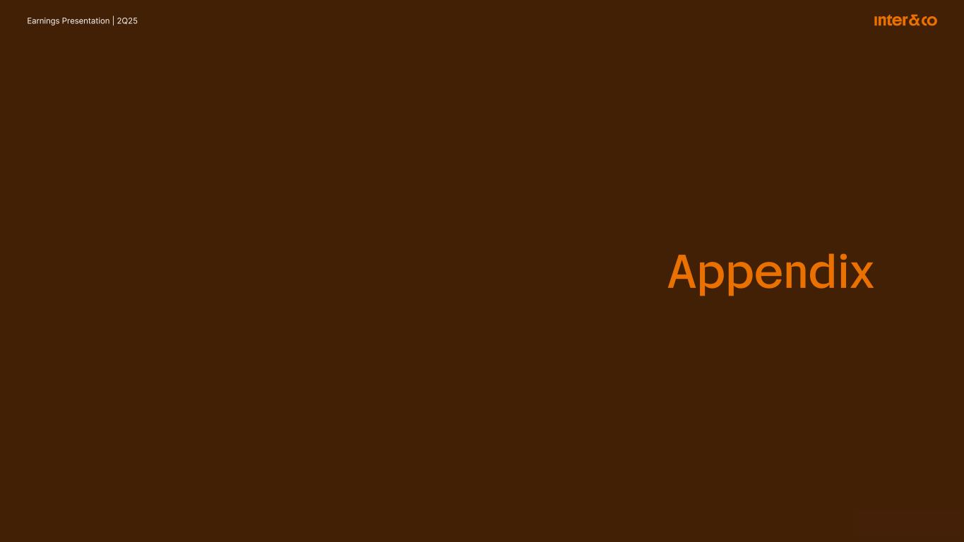 37 Earnings Presentation | 2Q25 Activation Rate: Number of active clients at the end of the quarter Total number of clients at the end of the quarter Active clients: We define an active client as a customer at any given date that was the source of any amount of revenue for us in the preceding three months, or/and a customer that used products in the preceding three months. For Inter insurance, we calculate the number of active clients for our insurance brokerage vertical as the number of beneficiaries of insurance policies effective as of a particular date. For Inter Invest, we calculate the number of active clients as the number of individual accounts that have invested on our platform over the applicable period. Active clients per employee: Number of active clients at the end of the quarter Total number of employees at the end of the quarter, including interns Administrative efficiency ratio: Administrative expenses + Depreciation and amortization Net Interest Income + Net result from services and comissions + Other revenue − Tax expense Annualized interest rates: Yearly rate calculated by multiplying the quarterly interest by four, over the average portfolio of the last two quarters. All-in loans rate considers Real Estate, Personnal +FGTS, SMBs, Credit Card, excluding non-interest earnings credit card receivables, and Anticipation of Credit Card Receivables. Anticipation of credit card receivables: Disclosed in note 9.a of the Financial Statements, line " "Loans to financial institutions”. ARPAC gross of interest expenses: (Interest income + (Revenue from services and comissions − Cashback − Inter rewards) + Income from securities and derivarives + Other revenue) ÷ 3 Average of the last 2 quarters Active Clients ARPAC net of interest expenses: (Revenue − Interest expenses) ÷ 3 Average of the last 2 quarters Active Clients ARPAC per quarterly cohort: Total Gross revenue net of interest expenses in a given cohort divided by the average number of active clients in the current and previous periods1. Cohort is defined as the period in which the client started his relationship with Inter. 1 - Average number of active clients in the current and previous periods: For the first period, is used the total number of active clients in the end of the period. Assets under custody (AuC): We calculate assets under custody, or AUC, at a given date as the market value of all retail clients’ assets invested through our investment platform as of that same date. We believe that AUC, as it reflects the total volume of assets invested in our investment platform without accounting for our operational efficiency, provides us useful insight on the appeal of our platform. We use this metric to monitor the size of our investment platform. Card fee revenue: It is part of the “Revenue from services and commission” and “Other revenue” on IFRS Income Statement. Card+PIX TPV: PIX, debit and credit cards and withdrawal transacted volumes of a given period. PIX is a Central Bank of Brazil solution to bring instant payments among banks and financial institutions in Brazil. Non-IFRS measures and KPIs