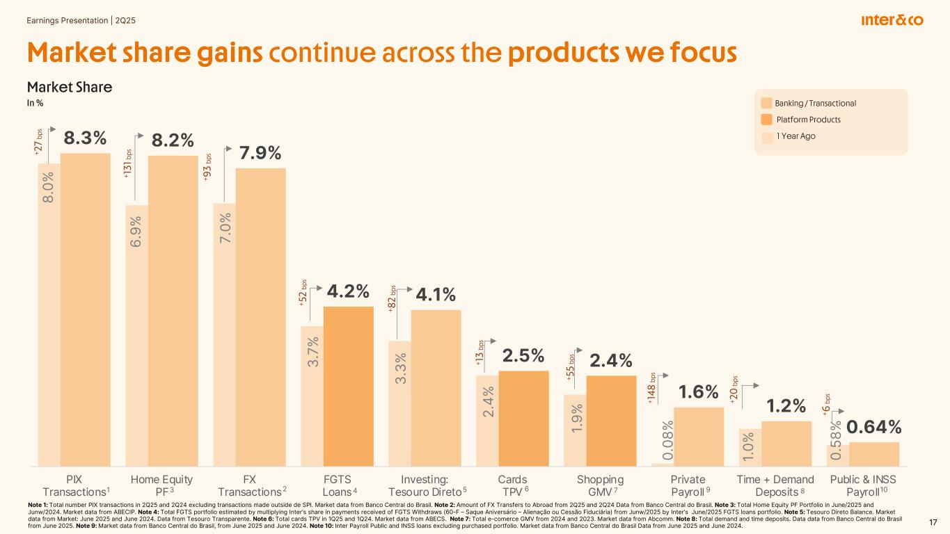 16 Earnings Presentation | 2Q25 41 66 85 121 123 154 171 184 238 294 - 5 0. 1 0 .0 1 50 .0 2 0 .0 2 50 .0 3 0 .0 3 50 .0 Note: Definitions are in the Glossary section of this Earnings Presentation. Note 1: Assets under Inter&Co Securities custody and/or management. Best-ever performance in global account deposits growth Global 1.4 1.8 1.8 2.2 2.9 3.3 3.6 3.9 4.1 4.4 0 .5 1 .0 1 .5 2 .0 2 .5 3 .0 3 .5 4 .0 1Q23 2Q23 3Q23 4Q23 1Q24 2Q24 3Q24 4Q24 1Q25 2Q25 Global Clients & Deposits In millions and USD Million ~USD 1.6bn Global AuC1 2Q25 YoY +90% 34% Total Deposits Total Clients