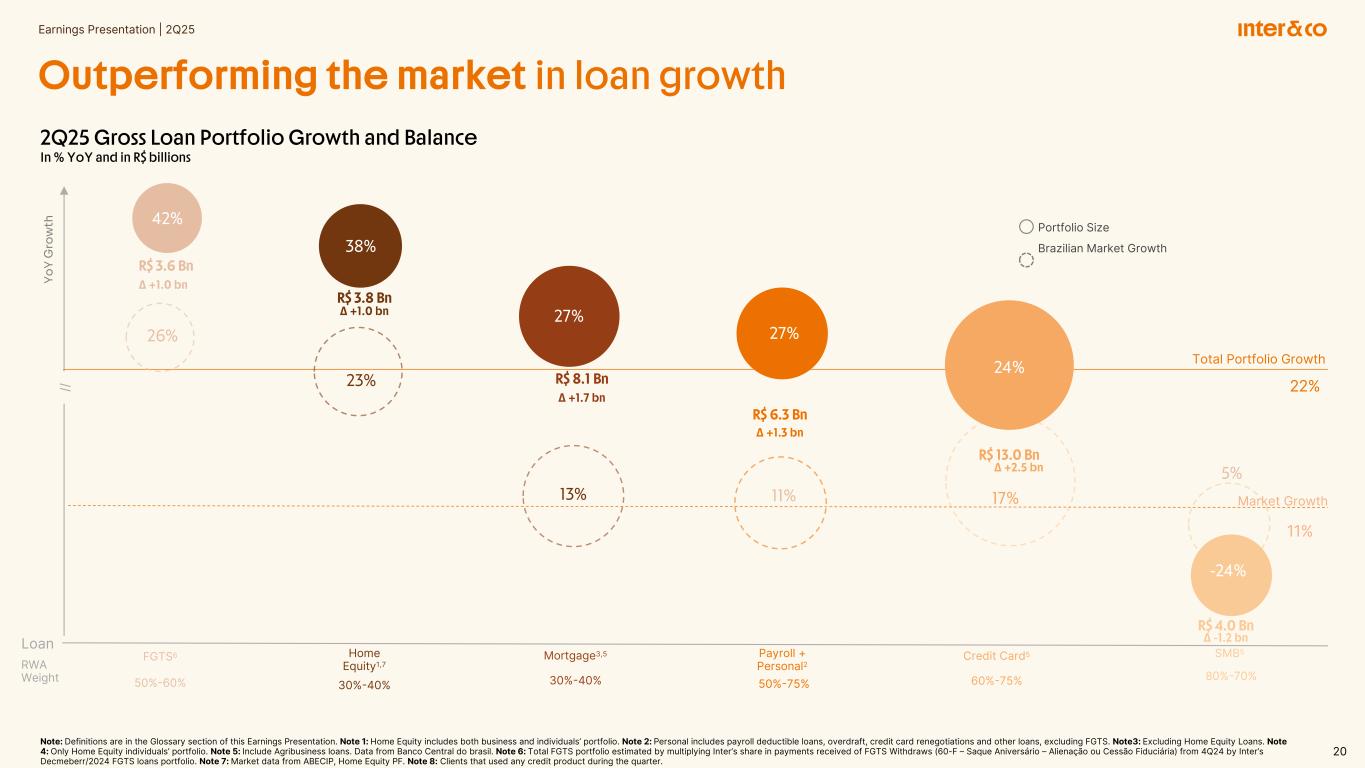 17 Earnings Presentation | 2Q25 8. 0% 6. 9% 7. 0% 3. 7% 3. 3% 2. 4% 1. 9% 0. 08 % 1. 0% 0. 58 % 8.3% 8.2% 7.9% 4.2% 4.1% 2.5% 2.4% 1.6% 1.2% 0.64% 0. 0% 1.0 % 2. 0% 3. 0% 4. 0% 5. 0% 6. 0% 7. 0% 8. 0% 9. 0% PIX Transactions Home Equity PF FX Transactions FGTS Loans Investing: Tesouro Direto Cards TPV Shopping GMV Private Payroll Time + Demand Deposits Public & INSS Payroll Banking / Transactional Platform Products 1 Year Ago Market Share In % Market share gains continue across the products we focus Note 1: Total number PIX transactions in 2Q25 and 2Q24 excluding transactions made outside de SPI. Market data from Banco Central do Brasil. Note 2: Amount of FX Transfers to Abroad from 2Q25 and 2Q24 Data from Banco Central do Brasil. Note 3: Total Home Equity PF Portfolio in June/2025 and Junw/2024. Market data from ABECIP. Note 4: Total FGTS portfolio estimated by multiplying Inter’s share in payments received of FGTS Withdraws (60-F – Saque Aniversário – Alienação ou Cessão Fiduciária) from Junw/2025 by Inter’s June/2025 FGTS loans portfolio. Note 5: Tesouro Direto Balance. Market data from Market: June 2025 and June 2024. Data from Tesouro Transparente. Note 6: Total cards TPV in 1Q25 and 1Q24. Market data from ABECS. Note 7: Total e-comerce GMV from 2024 and 2023. Market data from Abcomm. Note 8: Total demand and time deposits. Data data from Banco Central do Brasil from June 2025. Note 9: Market data from Banco Central do Brasil, from June 2025 and June 2024. Note 10: Inter Payroll Public and INSS loans excluding purchased portfolio. Market data from Banco Central do Brasil Data from June 2025 and June 2024. + 13 1 b p s + 93 bp s + 20 bp s + 27 bp s + 52 bp s + 55 bp s + 6 b p s + 14 8 b p s + 82 bp s + 13 bp s 1 23 4 5 6 7 9 8 10