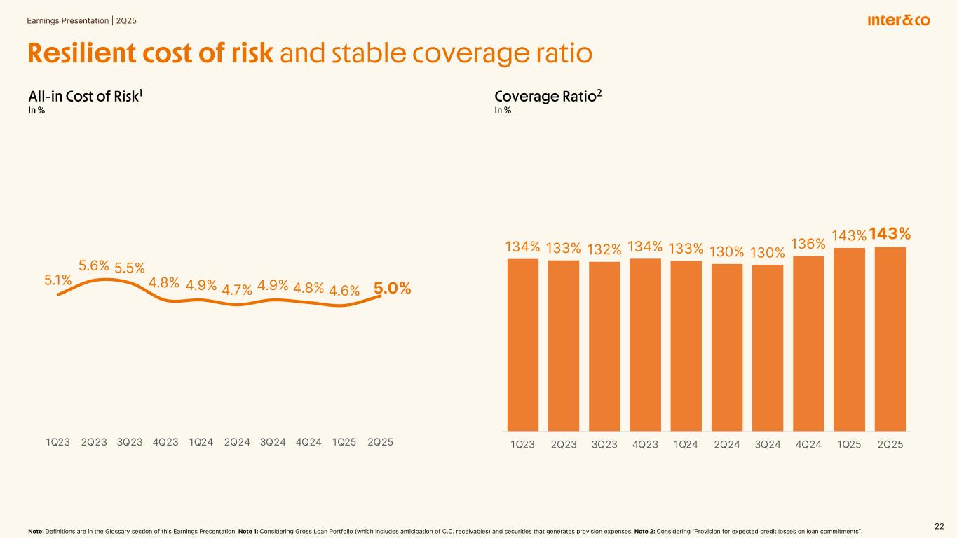 21 Earnings Presentation | 2Q25 NPL > 90 days1 In % Credit Cards NPL > 90 Days per Cohort2 In % NPL 15 to 90 days1 In % NPL and Stage 3 Formation In % Note: Definitions are in the Glossary section of this Earnings Presentation. Note 1: Considering Gross Loan Portfolio, which includes anticipation of C.C. receivables. Note 2: Cohorts defined as the first date when the client has his limit available. NPL per cohort = NPL > 90 days balance of the cohort divided by total credit card portfolio of the same cohort. 4.4% 4.7% 4.7% 4.6% 4.8% 4.7% 4.5% 4.2% 4.1% 4.2% 4.7% 4.9% 4.9% 4.8% 5.0% 5.0% 5.1% 4.9% 4.6% 4.6% 3 .0 % 3 .5 % 4 .0 % 4 .5 % 5 .0 % 5 .5 % 6 .0 % 1Q23 2Q23 3Q23 4Q23 1Q24 2Q24 3Q24 4Q24 1Q25 2Q25 Including C.C. Rec. Excluding C.C. Rec. 1.5% 1.6% 1.6% 1.5% 1.5% 1.7% 1.7% 1.2% 1.2% 1.5% 1.5% 1.6% 1.6% 1.5% 1.5% 1.7% 1.9% 1.8% 1.7% 1.6% 0 .0 % 0 .5 % 1. 0% 1. 5% 2 .0 % 2 .5 % 3 .0 % 3 .5 % 4 .0 % 1Q23 2Q23 3Q23 4Q23 1Q24 2Q24 3Q24 4Q24 1Q25 2Q25 NPL Formation Stage 3 Formation 4.3% 4.2% 4.3% 4.0% 4.4% 3.9% 3.6% 3.4% 3.8% 3.7% 4.6% 4.4% 4.5% 4.2% 4.6% 4.3% 4.1% 4.0% 4.3% 4.1% 3 .0 % 3 .5 % 4 .0 % 4 .5 % 5 .0 % 5 .5 % 6 .0 % 1Q23 2Q23 3Q23 4Q23 1Q24 2Q24 3Q24 4Q24 1Q25 2Q25 Including C.C. Rec. Excluding C.C. Rec. Start to converge to Resolution 4,966 3 4 5 6 7 8 9 10 11 12 1Q25 4Q21 Months of Relationship Consistent strength in asset quality performance