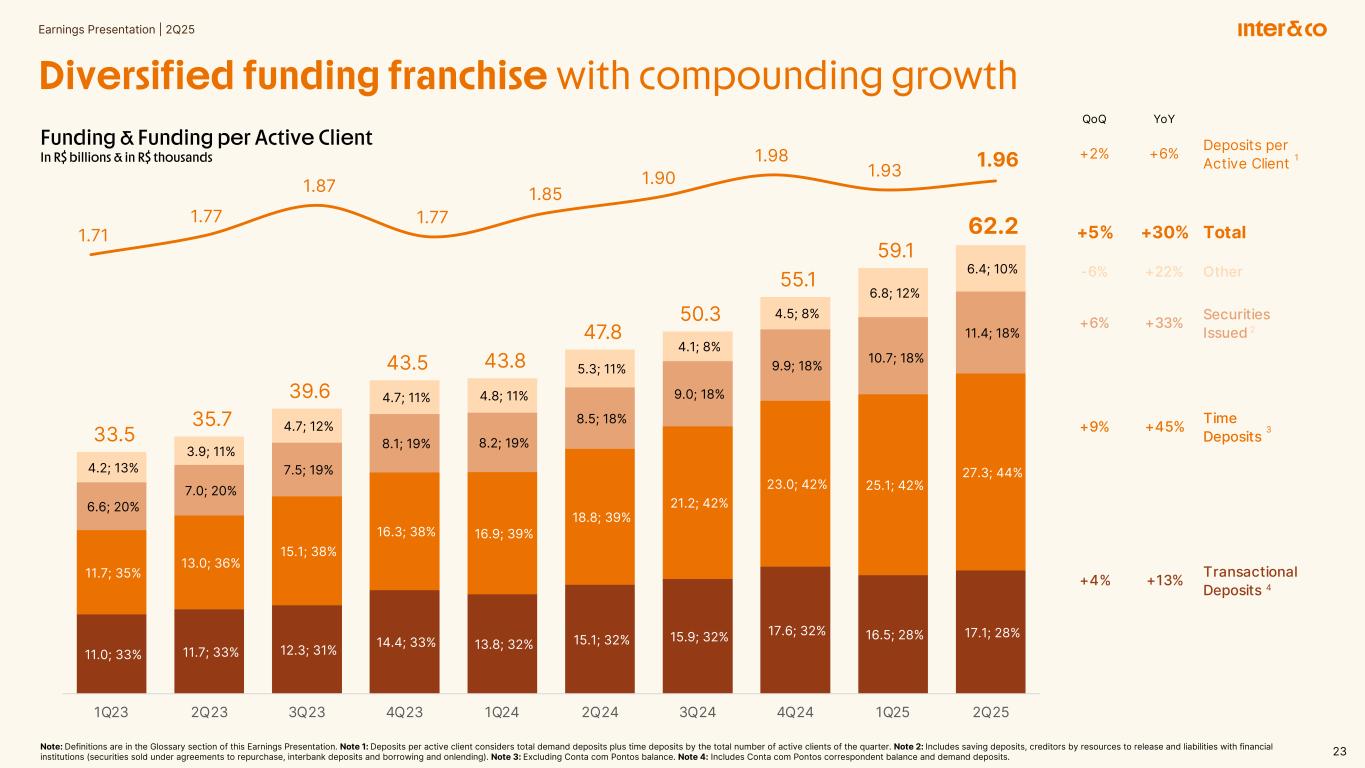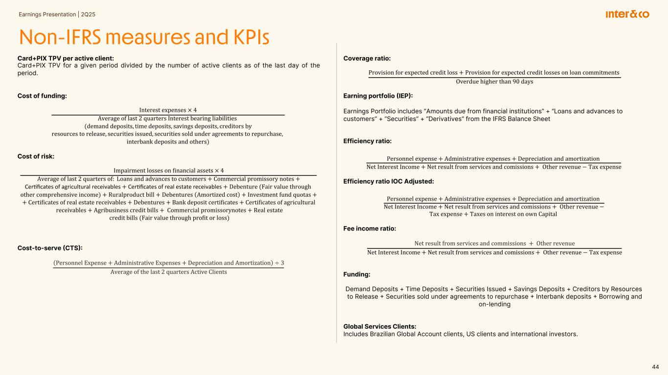 38 Earnings Presentation | 2Q25 Card+PIX TPV per active client: Card+PIX TPV for a given period divided by the number of active clients as of the last day of the period. Cost of funding: Interest expenses × 4 Average of last 2 quarters Interest bearing liabilities (demand deposits, time deposits, savings deposits, creditors by resources to release, securities issued, securities sold under agreements to repurchase, interbank deposits and others) Cost of risk: Impairment losses on Minancial assets × 4 Average of last 2 quarters of: Loans and advances to customers + Commercial promissory notes + Cer$ficates of agricultural receivables+ Cer$ficates of real estate receivables+ Debenture (Fair value through other comprehensive income) + Ruralproduct bill + Debentures Amortized cost + Investment fund quotas + + CertiMicates of real estate receivables + Debentures + Bank deposit certiMicates + CertiMicates of agricultural receivables + Agribusiness credit bills + Commercial promissorynotes + Real estate credit bills (Fair value through proMit or loss) Cost-to-serve (CTS): Personnel Expense + Administrative Expenses + Depreciation and Amortization ÷ 3 Average of the last 2 quarters Active Clients Coverage ratio: Provision for expected credit loss + Provision for expected credit losses on loan commitments Overdue higher than 90 days Earning portfolio (IEP): Earnings Portfolio includes “Amounts due from financial institutions” + “Loans and advances to customers” + “Securities” + “Derivatives” from the IFRS Balance Sheet Efficiency ratio: Personnel expense + Administrative expenses + Depreciation and amortization Net Interest Income + Net result from services and comissions + Other revenue − Tax expense Efficiency ratio IOC Adjusted: Personnel expense + Administrative expenses + Depreciation and amortization Net Interest Income + Net result from services and comissions + Other revenue − Tax expense + Taxes on interest on own Capital Fee income ratio: Net result from services and commissions + Other revenue Net Interest Income + Net result from services and comissions + Other revenue − Tax expense Funding: Demand Deposits + Time Deposits + Securities Issued + Savings Deposits + Creditors by Resources to Release + Securities sold under agreements to repurchase + Interbank deposits + Borrowing and on-lending Global Services Clients: Includes Brazilian Global Account clients, US clients and international investors. Non-IFRS measures and KPIs 44