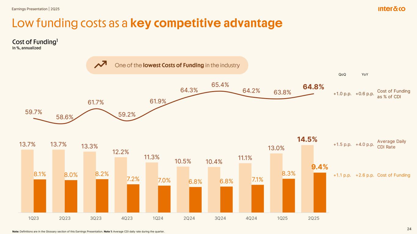 23 Earnings Presentation | 2Q25 QoQ YoY +2% +6% Deposits per Active Client +5% +30% Total -6% +22% Other +6% +33% Securities Issued +9% +45% Time Deposits +4% +13% Transactional Deposits 11.0; 33% 11.7; 33% 12.3; 31% 14.4; 33% 13.8; 32% 15.1; 32% 15.9; 32% 17.6; 32% 16.5; 28% 17.1; 28% 11.7; 35% 13.0; 36% 15.1; 38% 16.3; 38% 16.9; 39% 18.8; 39% 21.2; 42% 23.0; 42% 25.1; 42% 27.3; 44% 6.6; 20% 7.0; 20% 7.5; 19% 8.1; 19% 8.2; 19% 8.5; 18% 9.0; 18% 9.9; 18% 10.7; 18% 11.4; 18% 4.2; 13% 3.9; 11% 4.7; 12% 4.7; 11% 4.8; 11% 5.3; 11% 4.1; 8% 4.5; 8% 6.8; 12% 6.4; 10% 33.5 35.7 39.6 43.5 43.8 47.8 50.3 55.1 59.1 62.2 1Q23 2Q23 3Q23 4Q23 1Q24 2Q24 3Q24 4Q24 1Q25 2Q25 1.71 1.77 1.87 1.77 1.85 1.90 1.98 1.93 1.96 1 .65 1 .70 1 .75 1 .80 1 .85 1 .90 1 .95 2 .0 Funding & Funding per Active Client In R$ billions & in R$ thousands Note: Definitions are in the Glossary section of this Earnings Presentation. Note 1: Deposits per active client considers total demand deposits plus time deposits by the total number of active clients of the quarter. Note 2: Includes saving deposits, creditors by resources to release and liabilities with financial institutions (securities sold under agreements to repurchase, interbank deposits and borrowing and onlending). Note 3: Excluding Conta com Pontos balance. Note 4: Includes Conta com Pontos correspondent balance and demand deposits. 2 3 4 1 Diversified funding franchise with compounding growth