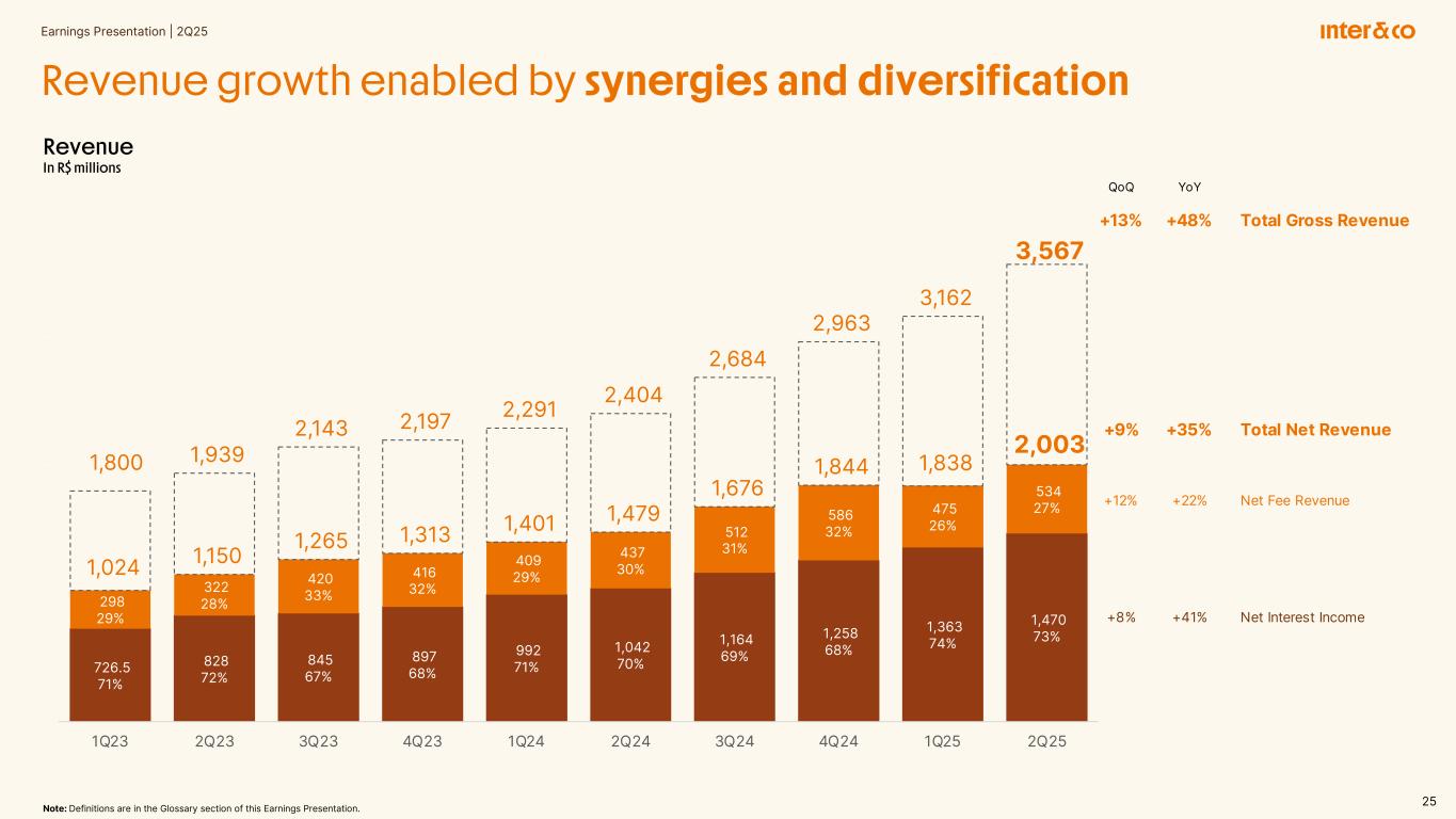 25 Earnings Presentation | 2Q25 726.5 71% 828 72% 845 67% 897 68% 992 71% 1,042 70% 1,164 69% 1,258 68% 1,363 74% 1,470 73% 298 29% 322 28% 420 33% 416 32% 409 29% 437 30% 512 31% 586 32% 475 26% 534 27% 1,024 1,150 1,265 1,313 1,401 1,479 1,676 1,844 1,838 2,003 1,800 1,939 2,143 2,197 2,291 2,404 2,684 2,963 3,162 3,567 - 5 00 1, 00 0 1, 50 0 2 ,0 00 2 ,50 0 3 ,0 00 3 ,50 0 4 ,0 00 1Q23 2Q23 3Q23 4Q23 1Q24 2Q24 3Q24 4Q24 1Q25 2Q25 QoQ YoY +13% +48% Total Gross Revenue +9% +35% Total Net Revenue +12% +22% Net Fee Revenue +8% +41% Net Interest Income Revenue In R$ millions Revenue growth enabled by synergies and diversification Note: Definitions are in the Glossary section of this Earnings Presentation.