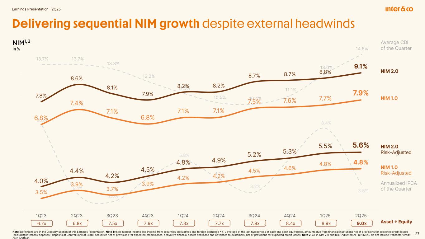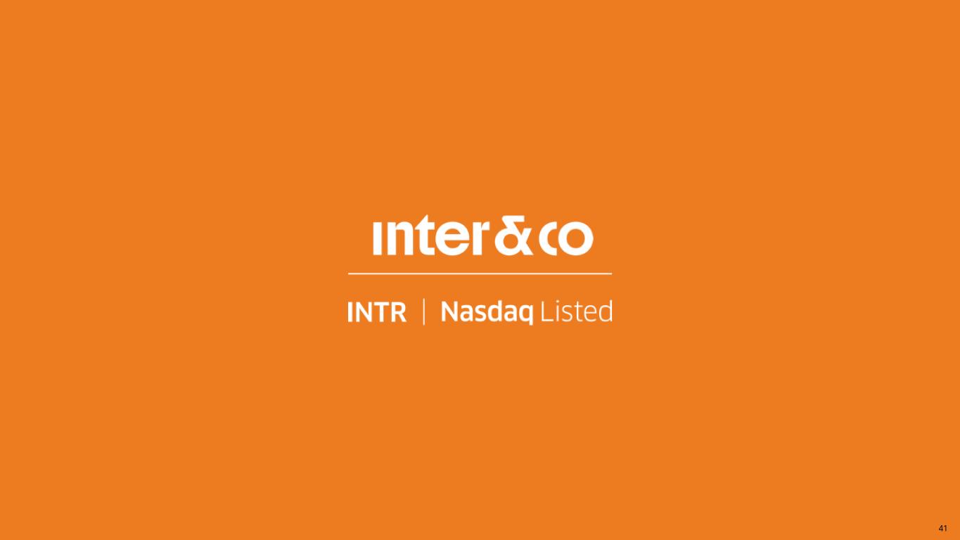 40 Earnings Presentation | 2Q25 Risk-Adjusted NIM 2.0: Net interest income and income from securities, derivatives and foreign Exchange x 4 Average of 2 Last Quarters Earning Portfolio (Cash and cash equivalents + Amounts due from Minancial institutions, net of provisions for expected credit losses + Deposits at Central Bank of Brazil + Securi$es, net of provisions for expected losses + Derivative Minancial assets + Loans and advances to customers, net of provisions for expected credit losses) – Interbank deposits − Credit card transactor portfolio SG&A: Administrative Expenses + Personnel Expenses + Depreciation and Amortization Securities: Income from securities and derivatives – Income from derivatives Stage 3 formation: Stage 3 balance in the current quarter – Stage 3 balance in the previous quarter +Write − off change in the current quarter Total loans and advance to customers in the previous quarter Tier I ratio: Tier I referential equity Risk weighted assets Total gross revenue: Interest income + Revenue from services and commissions − Cashback expenses − Inter rewards + Income from securities and derivatives + Other revenue NPL formation: Overdue balance higher than 90 days in the current quarter – Overdue balance higher than 90 days in the previous quarter + Write − off change in the current quarter Total loans and advance to customers in the previous quarter Personal efficiency ratio: Personnel expense Net Interest Income + Net result from services and comissions + Other revenue − Tax expense Primary Banking Relationship: A client who has 50% or more of their income after tax for that period flowing to their bank account with us during the month. Return on average equity (ROE): (ProMit / (loss) for the quarter)× 4 Average of last 2 quarters of total shareholder`s equity Risk-adjusted efficiency ratio: Personnel expense + Administrative expenses + Depreciation and amortization Net Interest Income + Net result from services and comissions + Other revenue − Tax expense − Impairment losses on Minancial assets Risk-adjusted NIM 1.0 Net interest income and income from securities, derivatives and foreign Exchange x 4 Average of 2 Last Quarters Earning Portfolio (Cash and cash equivalents + Amounts due from Minancial institutions, net of provisions for expected credit losses + Deposits at Central Bank of Brazil + Securi$es, net of provisions for expected losses + Derivative Minancial assets + Loans and advances to customers, net of provisions for expected credit losses) – Interbank deposits Non-IFRS measures and KPIs