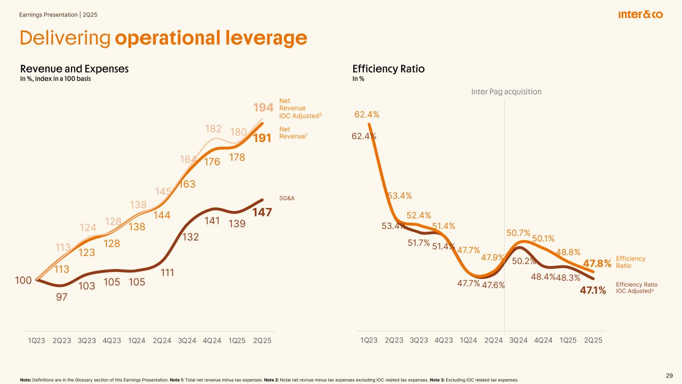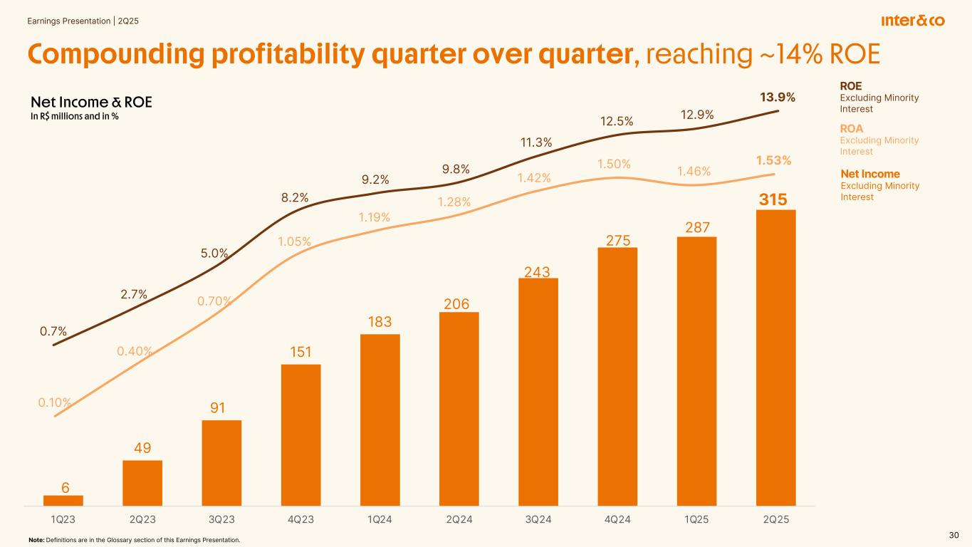 29 Earnings Presentation | 2Q25 62.4% 53.4% 51.7% 51.4% 47.7% 47.6% 50.2% 48.4%48.3% 47.1% 62.4% 53.4% 52.4% 51.4% 47.7% 47.9% 50.7% 50.1% 48.8% 47.8% 4 2. 0% 4 7.0 % 5 2. 0% 5 7.0 % 6 2. 0% 6 7.0 % 1Q23 2Q23 3Q23 4Q23 1Q24 2Q24 3Q24 4Q24 1Q25 2Q25 SG&A Net Revenue1 113 123 128 138 144 163 176 178 191 100 97 103 105 105 111 132 141 139 147 113 124 128 138 145 164 182 180 194 7 0 10 0 13 0 16 0 19 0 2 20 1Q23 2Q23 3Q23 4Q23 1Q24 2Q24 3Q24 4Q24 1Q25 2Q25 Note: Definitions are in the Glossary section of this Earnings Presentation. Note 1: Total net revenue minus tax expenses. Note 2: Notal net revnue minus tax expenses excluding IOC related tax expenses. Note 3: Excluding IOC related tax expenses. Efficiency Ratio In % Revenue and Expenses In %, index in a 100 basis Delivering operational leverage Inter Pag acquisition Efficiency Ratio IOC Adjusted3 Efficiency Ratio Net Revenue IOC Adjusted2