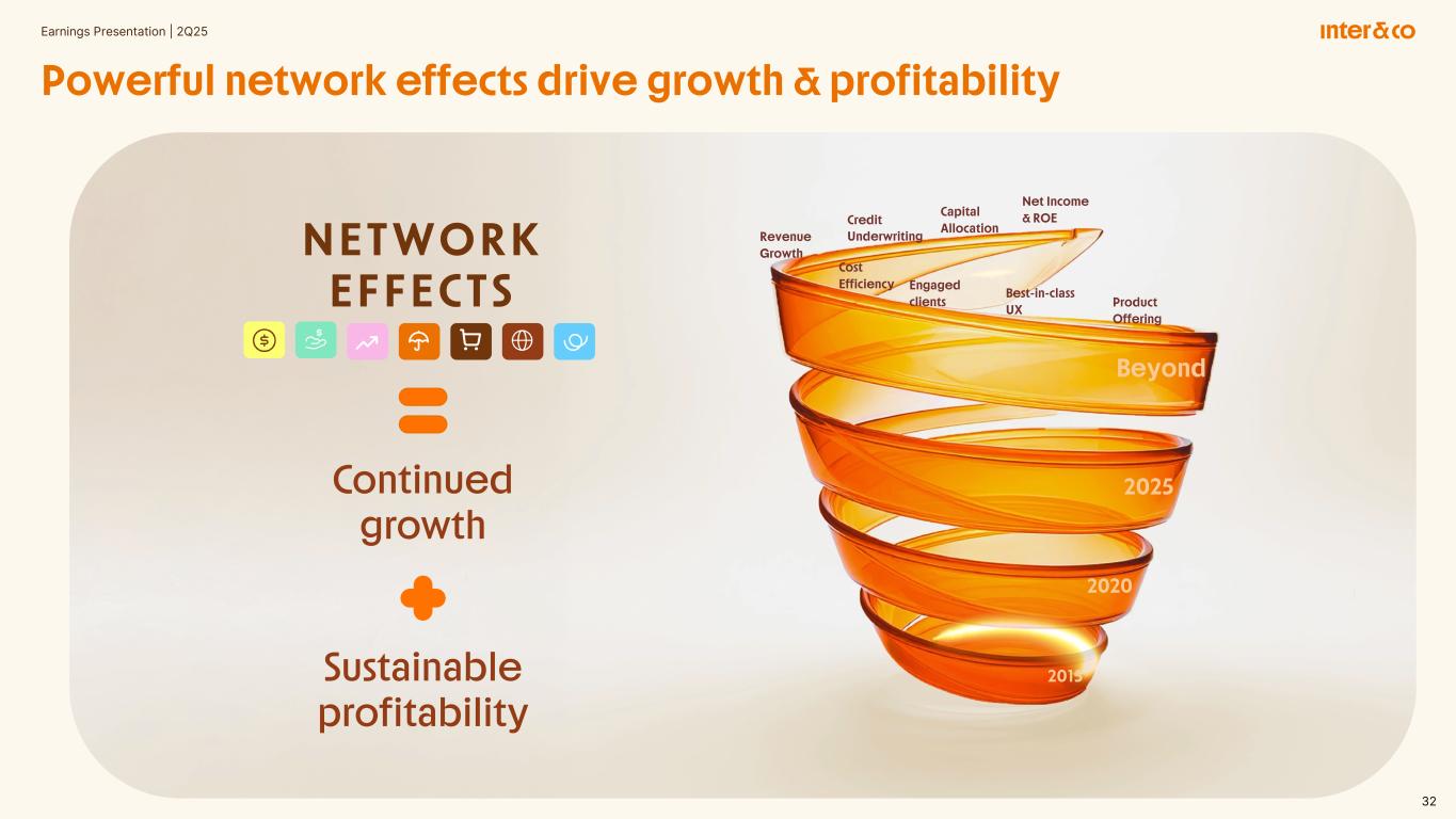 Sustainable profitability Continued growth NETWORK EFFECTS Engaged clients Best-in-class UX Product Offering Cost Efficiency Revenue Growth Credit Underwriting Capital Allocation Net Income & ROE 2015 2020 2025 Beyond Earnings Presentation | 2Q25 Powerful network effects drive growth & profitability 32