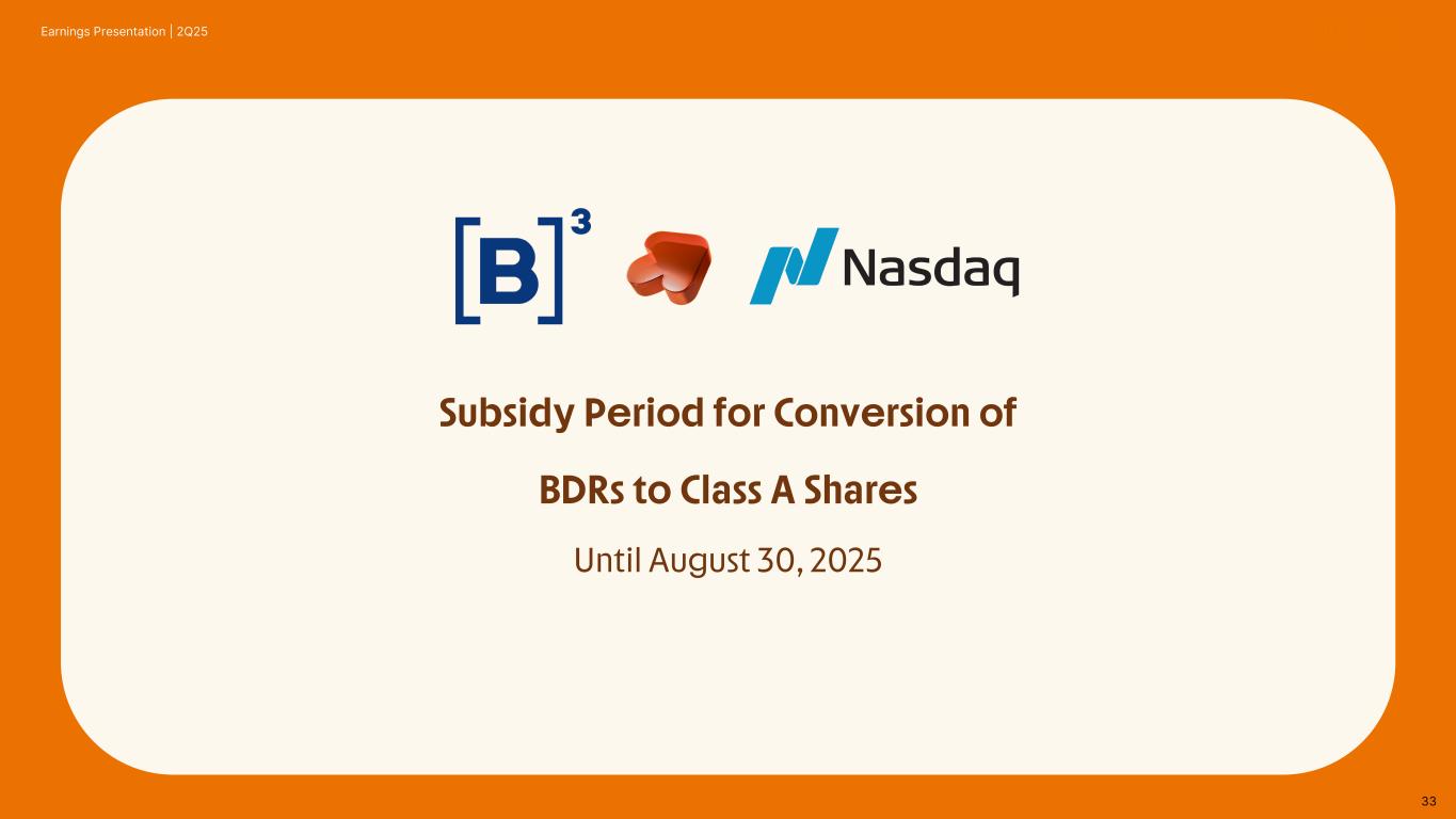 33 Earnings Presentation | 2Q25 Subsidy Period for Conversion of BDRs to Class A Shares Until August 30, 2025