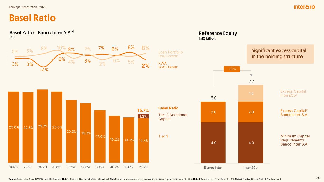 35 Earnings Presentation | 2Q25 23.0% 22.8% 23.7% 23.0% 20.3% 19.3% 17.0% 15.2% 14.7% 14.4% 1.3% 15.7% 0 .0 % 5 .0 % 10 .0 % 15 .0 % 2 0. 0% 2 5. 0% 1Q23 2Q23 3Q23 4Q23 1Q24 2Q24 3Q24 4Q24 1Q25 2Q25 Basel Ratio – Banco Inter S.A.4 In % 3% 3% -4% 6% 8% 6% 7% 6% 8% 2% 5% 5% 8% 10% 4% 7% 2% 6% 5% 8% -6% -4% -2% 0% 2% 4% 6% 8% 10% 12% Loan Portfolio QoQ Growth RWA QoQ Growth Tier 1 Minimum Capital Requirement3 Banco Inter S.A. Excess Capital2 Banco Inter S.A. 4.0 4.0 2.0 2.0 1.6 6.0 7.7 - 1 .0 2 .0 3 .0 4 .0 5 .0 6 .0 7 .0 8 .0 9 .0 Banco Inter Inter&Co Excess Capital Inter&Co1 +27% Reference Equity In R$ billions Significant excess capital in the holding structure Source: Banco Inter Bacen GAAP Financial Statements. Note 1: Capital hold at the Inter&Co Holding level. Note 2: Additional reference equity considering minimum capital requirement of 10.5%. Note 3: Considering a Basel Ratio of 10.5%. Note 4: Pending Central Bank of Brazil approval. Basel Ratio Tier 2 Additional Capital Basel Ratio