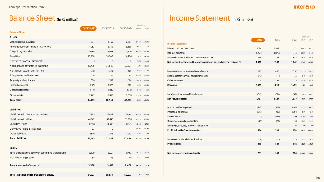 36 Earnings Presentation | 2Q25 Balance Sheet (In R$ million) Income Statement (In R$ million) 06/30/2025 03/31/2025 06/30/2024 ∆QoQ ∆YoY Balance Sheet Assets Cash and cash equivalents 4,834 1,459 2,797 +231.4% +72.8% Amounts due from financial institutions 4,953 6,595 5,280 -24.9% -6.2% Compulsory deposits 6,180 5,648 3,726 +9.4% +65.9% Securities 23,860 24,703 18,276 -3.4% +30.6% Derivative financial instruments 1 8 7 -91.5% -90.4% Net loans and advances to customers 37,780 35,088 30,807 +7.7% +22.6% Non-current assets held-for-sale 261 258 180 +1.1% +44.8% Equity accounted investees 10 10 88 +0.0% -88.2% Property and equipment 378 359 194 +5.1% +95.0% Intangible assets 1,971 1,926 1,662 +2.3% +18.6% Deferred tax assets 1,719 1,849 1,218 -7.0% +41.1% Variation % Other assets 2,787 2,655 2,338 +5.0% +19.2% Total assets 84,733 80,559 66,573 +5.2% +27.3% Liabilities Liabilities with financial institutions 13,885 13,808 10,914 +0.6% +27.2% Liabilities with clients 46,667 43,648 35,978 +6.9% +29.7% Securities issued 11,378 10,698 8,543 +6.4% +33.2% Derivative financial liabilities 33 6 14 +466.2% +136.4% Other liabilities 1,910 2,195 1,982 -13.0% -3.6% Total Liabilities 75,345 71,546 57,966 +5.3% +30.0% Equity Total shareholder's equity of controlling shareholders 9,290 8,901 8,462 +4.4% +9.8% Non-controlling interest 98 112 146 -12.5% -32.5% Total shareholder's equity 9,388 9,013 8,608 +4.2% +9.1% Total liabilities and shareholder's equity 84,733 80,559 66,573 +5.2% +27.3% 2Q25 1Q25 2Q24 ∆QoQ ∆YoY Income Statement Interest income from loans 2,128 1,807 1,172 +17.8% +81.5% Interest expenses (1,424) (1,179) (773) +20.8% +84.3% Income from securities and derivatives and FX 765 735 642 +4.2% +19.2% Net interest income and income from securities and derivatives and FX 1,470 1,363 1,042 +7.8% +41.0% Revenues from services and commissions 495 460 397 +7.7% +24.7% Expenses from services and commissions (43) (41) (33) +5.4% +30.5% Other revenues 81 56 73 +45.2% +12.3% Revenue 2,003 1,838 1,479 +9.0% +35.5% Impairment losses on financial assets (569) (514) (421) +10.8% +35.1% Net result of losses 1,434 1,324 1,057 +8.3% +35.6% Variation % Administrative expenses (540) (528) (403) +2.2% +34.1% Personnel expenses (257) (235) (204) +9.3% +25.7% Tax expenses (177) (136) (99) +30.0% +77.9% Depreciation and amortization (77) (67) (53) +13.6% +44.5% Income from equity interests in affiliates - - (0) N/M N/M Profit / (loss) before income tax 384 358 298 +7.3% +28.9% Income tax and social contribution (51) (51) (75) +1.2% -31.5% Profit / (loss) 332 307 223 +8.3% +49.2% Net income excluding minority 315 287 206 +10.0% +52.6%