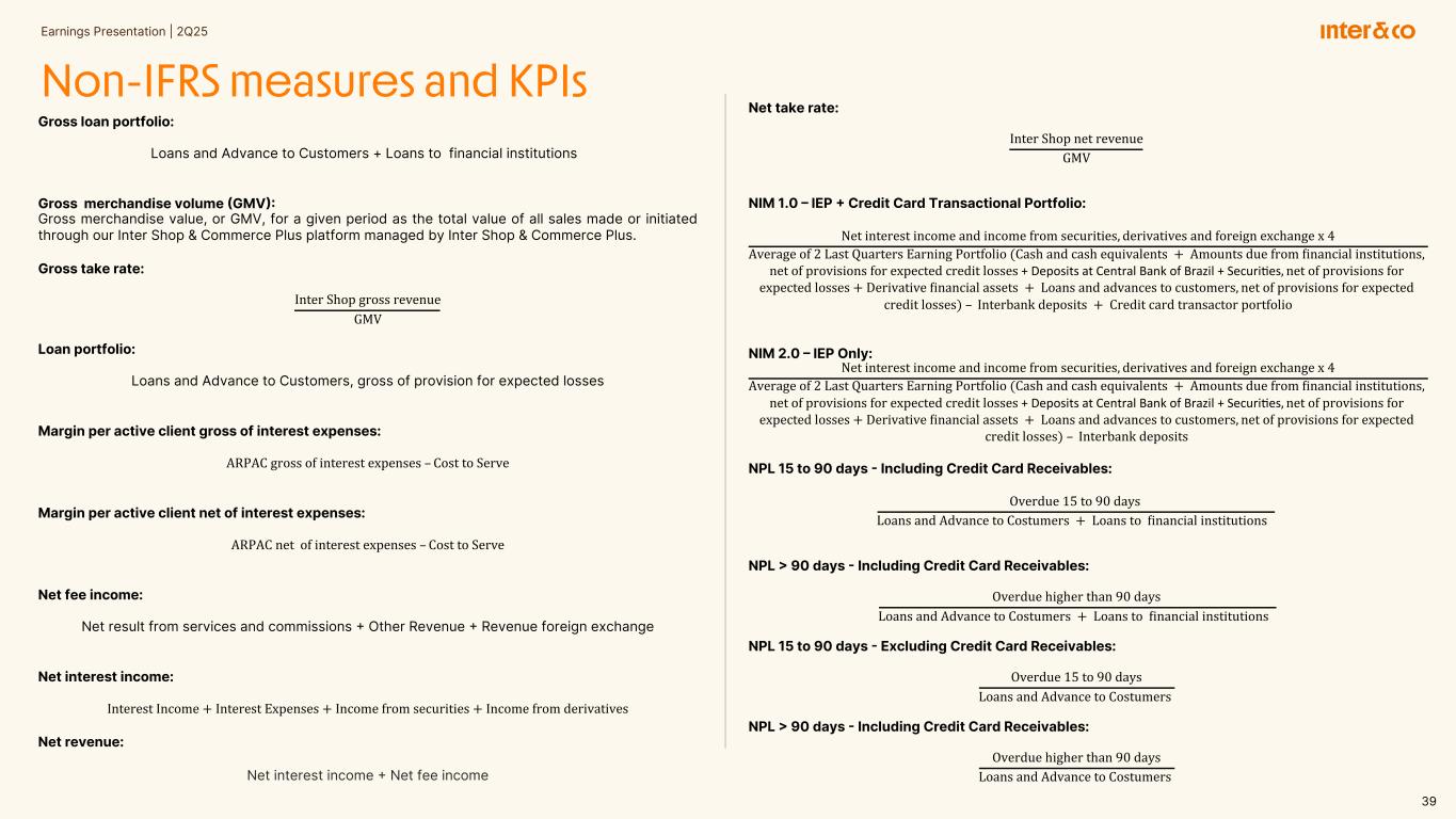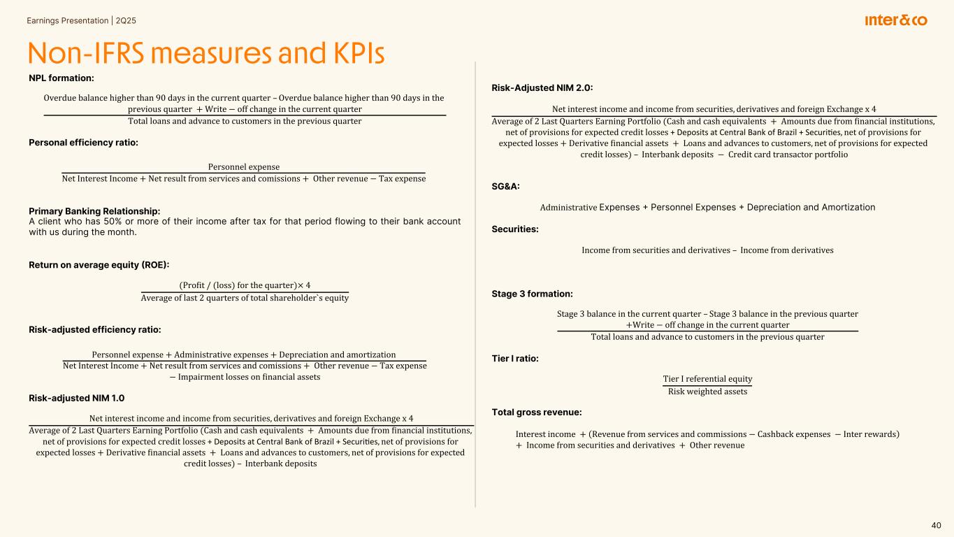 39 Earnings Presentation | 2Q25 Gross loan portfolio: Loans and Advance to Customers + Loans to financial institutions Gross merchandise volume (GMV): Gross merchandise value, or GMV, for a given period as the total value of all sales made or initiated through our Inter Shop & Commerce Plus platform managed by Inter Shop & Commerce Plus. Gross take rate: Inter Shop gross revenue GMV Loan portfolio: Loans and Advance to Customers, gross of provision for expected losses Margin per active client gross of interest expenses: ARPAC gross of interest expenses – Cost to Serve Margin per active client net of interest expenses: ARPAC net of interest expenses – Cost to Serve Net fee income: Net result from services and commissions + Other Revenue + Revenue foreign exchange Net interest income: Interest Income + Interest Expenses + Income from securities + Income from derivatives Net revenue: Net interest income + Net fee income Net take rate: Inter Shop net revenue GMV NIM 1.0 – IEP + Credit Card Transactional Portfolio: Net interest income and income from securities, derivatives and foreign exchange x 4 Average of 2 Last Quarters Earning Portfolio (Cash and cash equivalents + Amounts due from Minancial institutions, net of provisions for expected credit losses + Deposits at Central Bank of Brazil + Securi$es, net of provisions for expected losses + Derivative Minancial assets + Loans and advances to customers, net of provisions for expected credit losses) – Interbank deposits + Credit card transactor portfolio NIM 2.0 – IEP Only: Net interest income and income from securities, derivatives and foreign exchange x 4 Average of 2 Last Quarters Earning Portfolio (Cash and cash equivalents + Amounts due from Minancial institutions, net of provisions for expected credit losses + Deposits at Central Bank of Brazil + Securi$es, net of provisions for expected losses + Derivative Minancial assets + Loans and advances to customers, net of provisions for expected credit losses) – Interbank deposits NPL 15 to 90 days - Including Credit Card Receivables: Overdue 15 to 90 days Loans and Advance to Costumers + Loans to Minancial institutions NPL > 90 days - Including Credit Card Receivables: Overdue higher than 90 days Loans and Advance to Costumers + Loans to Minancial institutions NPL 15 to 90 days - Excluding Credit Card Receivables: Overdue 15 to 90 days Loans and Advance to Costumers NPL > 90 days - Including Credit Card Receivables: Overdue higher than 90 days Loans and Advance to Costumers Non-IFRS measures and KPIs
