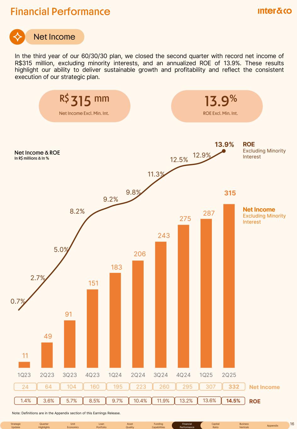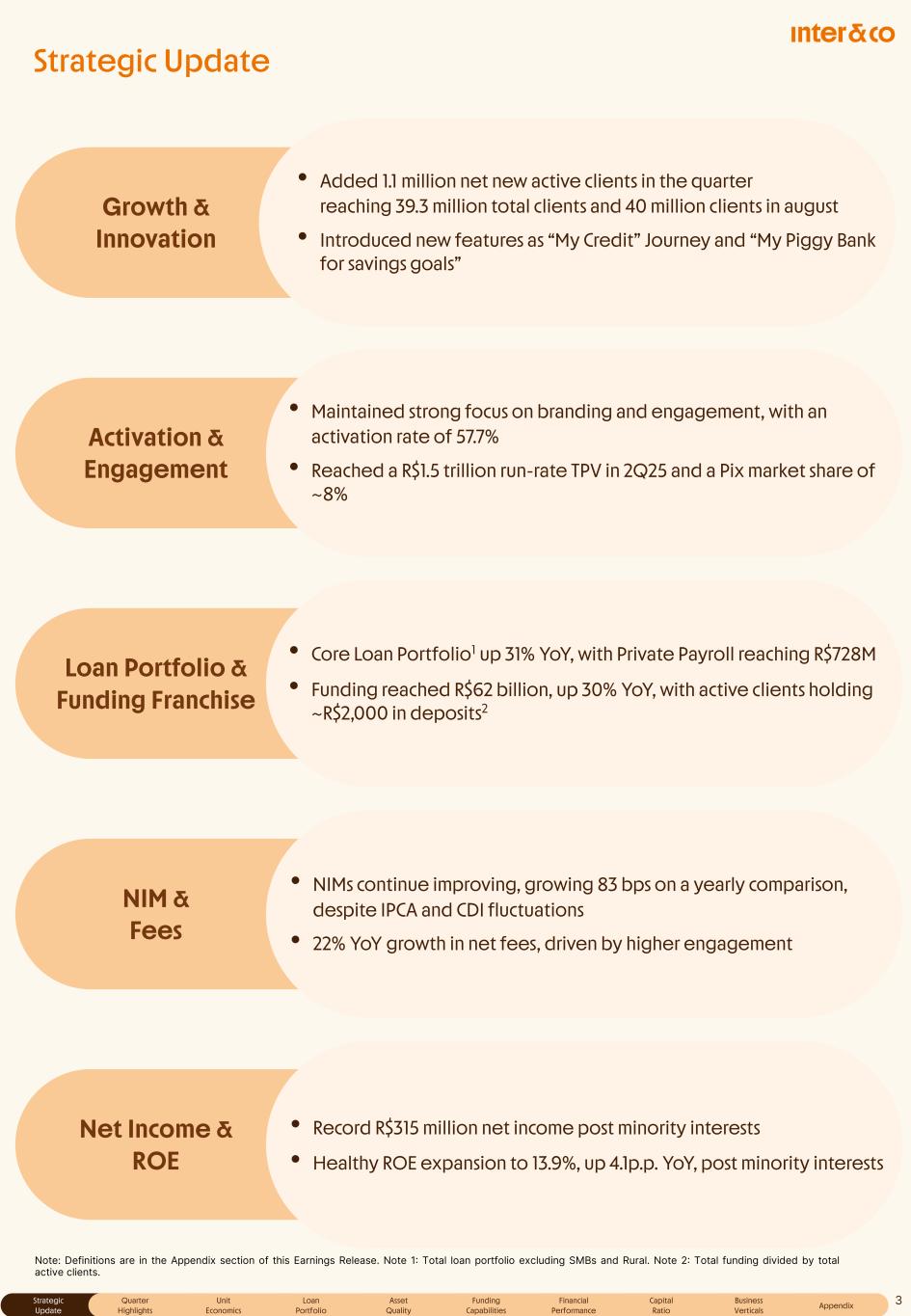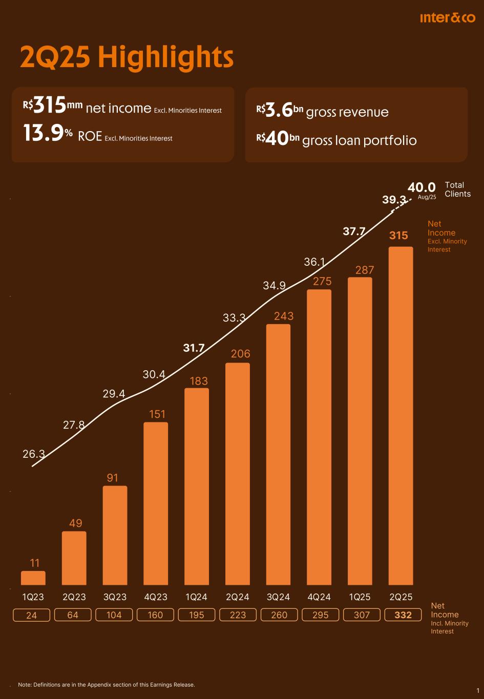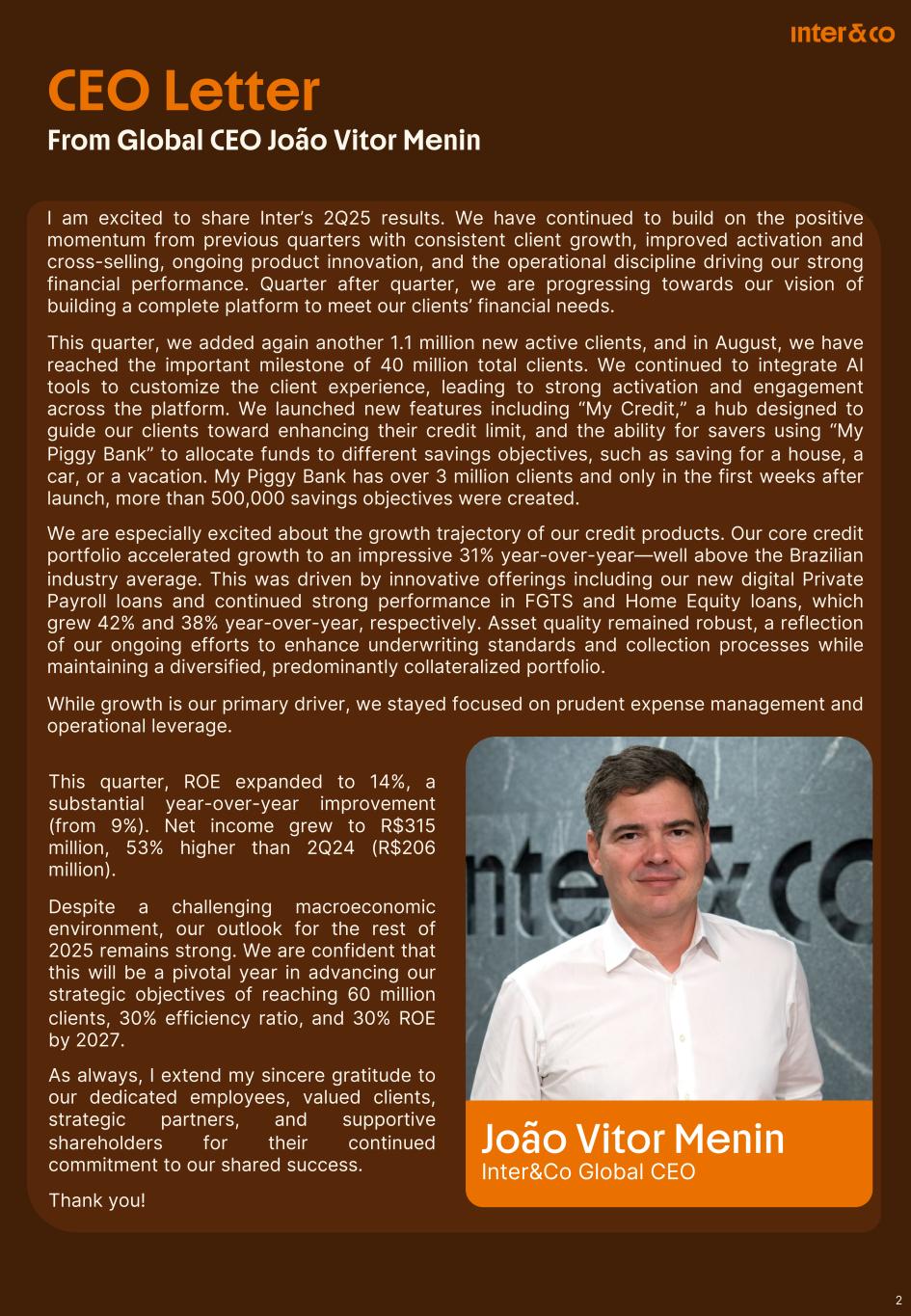 From Global CEO João Vitor Menin CEO Letter 2 I am excited to share Inter’s 2Q25 results. We have continued to build on the positive momentum from previous quarters with consistent client growth, improved activation and cross-selling, ongoing product innovation, and the operational discipline driving our strong financial performance. Quarter after quarter, we are progressing towards our vision of building a complete platform to meet our clients’ financial needs. This quarter, we added again another 1.1 million new active clients, and in August, we have reached the important milestone of 40 million total clients. We continued to integrate AI tools to customize the client experience, leading to strong activation and engagement across the platform. We launched new features including “My Credit,” a hub designed to guide our clients toward enhancing their credit limit, and the ability for savers using “My Piggy Bank” to allocate funds to different savings objectives, such as saving for a house, a car, or a vacation. My Piggy Bank has over 3 million clients and only in the first weeks after launch, more than 500,000 savings objectives were created. We are especially excited about the growth trajectory of our credit products. Our core credit portfolio accelerated growth to an impressive 31% year-over-year—well above the Brazilian industry average. This was driven by innovative offerings including our new digital Private Payroll loans and continued strong performance in FGTS and Home Equity loans, which grew 42% and 38% year-over-year, respectively. Asset quality remained robust, a reflection of our ongoing efforts to enhance underwriting standards and collection processes while maintaining a diversified, predominantly collateralized portfolio. While growth is our primary driver, we stayed focused on prudent expense management and operational leverage. This quarter, ROE expanded to 14%, a substantial year-over-year improvement (from 9%). Net income grew to R$315 million, 53% higher than 2Q24 (R$206 million). Despite a challenging macroeconomic environment, our outlook for the rest of 2025 remains strong. We are confident that this will be a pivotal year in advancing our strategic objectives of reaching 60 million clients, 30% efficiency ratio, and 30% ROE by 2027. As always, I extend my sincere gratitude to our dedicated employees, valued clients, strategic partners, and supportive shareholders for their continued commitment to our shared success. Thank you! João Vitor Menin Inter&Co Global CEO