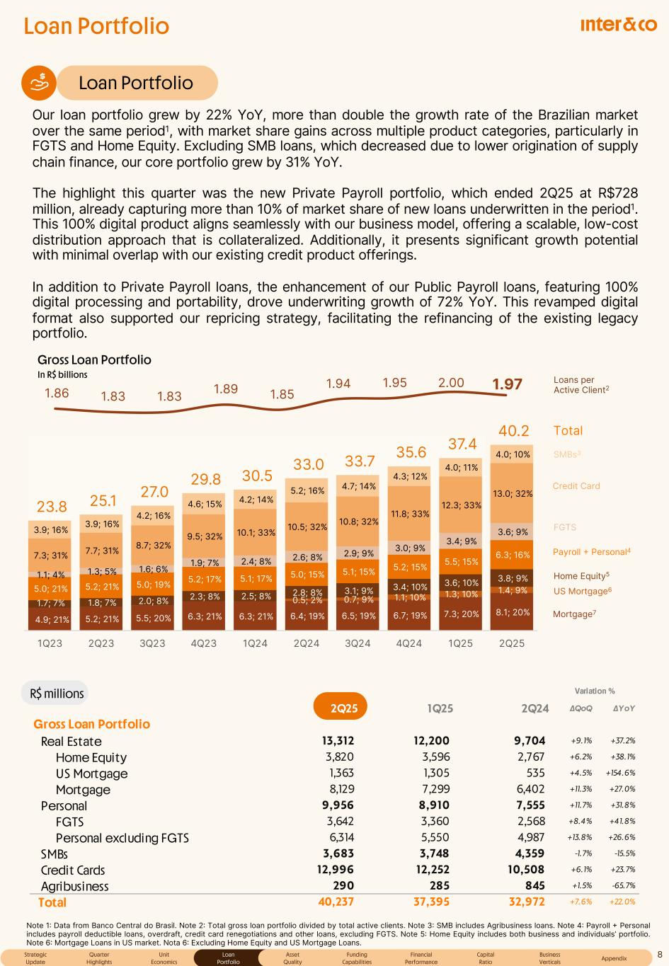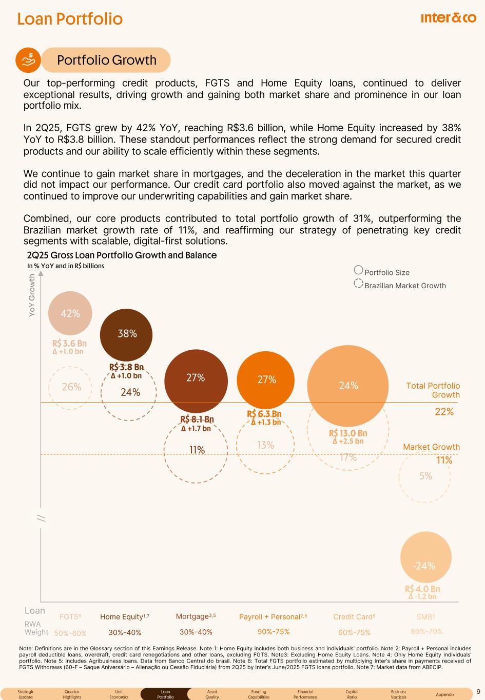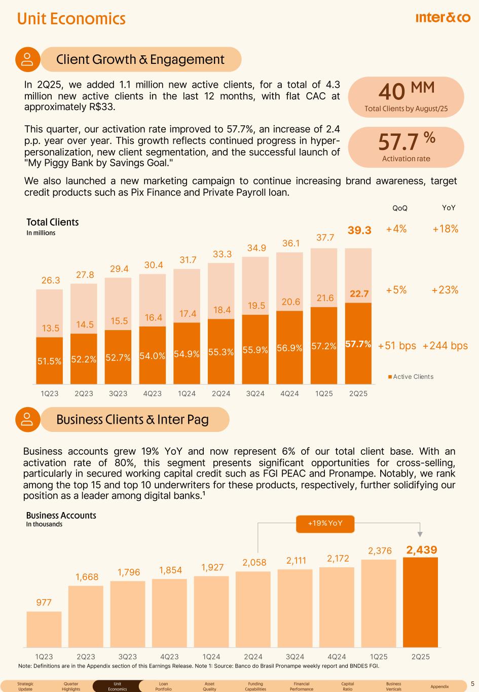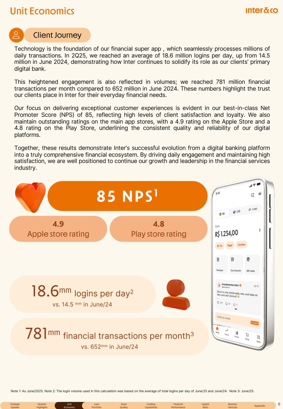 Note: Definitions are in the Appendix section of this Earnings Release. Note 1: Source: Banco do Brasil Pronampe weekly report and BNDES FGI. Unit Economics 40 MM Total Clients by August/25 Client Growth & Engagement 51.5% 52.2% 52.7% 54.0% 54.9% 55.3% 55.9% 56.9% 57.2% 57.7% 13.5 14.5 15.5 16.4 17.4 18.4 19.5 20.6 21.6 22.7 26.3 27.8 29.4 30.4 31.7 33.3 34.9 36.1 37.7 39.3 1 .0 6 .0 1 1.0 1 6.0 2 1.0 2 6.0 3 1.0 3 6.0 1Q23 2Q23 3Q23 4Q23 1Q24 2Q24 3Q24 4Q24 1Q25 2Q25 Active Clients YoYQoQ +4% +18% +5% +23% +51 bps +244 bps Total Clients In millions Business Accounts In thousands Business Clients & Inter Pag +19%YoY Quarter Highlights Appendix Unit Economics Loan Portfolio Asset Quality Funding Capabilities Financial Performance Capital Ratio Business Verticals Strategic Update 57.7 % Activation rate 977 1,668 1,796 1,854 1,927 2,058 2,111 2,172 2,376 2,439 1. 0 5 01 .0 10 0 1. 0 15 0 1.0 2 0 1 .0 2 50 1. 0 1Q23 2Q23 3Q23 4Q23 1Q24 2Q24 3Q24 4Q24 1Q25 2Q25 5 In 2Q25, we added 1.1 million new active clients, for a total of 4.3 million new active clients in the last 12 months, with flat CAC at approximately R$33. This quarter, our activation rate improved to 57.7%, an increase of 2.4 p.p. year over year. This growth reflects continued progress in hyper- personalization, new client segmentation, and the successful launch of "My Piggy Bank by Savings Goal." Business accounts grew 19% YoY and now represent 6% of our total client base. With an activation rate of 80%, this segment presents significant opportunities for cross-selling, particularly in secured working capital credit such as FGI PEAC and Pronampe. Notably, we rank among the top 15 and top 10 underwriters for these products, respectively, further solidifying our position as a leader among digital banks.¹ We also launched a new marketing campaign to continue increasing brand awareness, target credit products such as Pix Finance and Private Payroll loan.