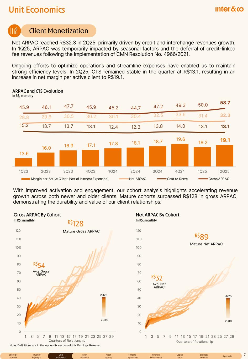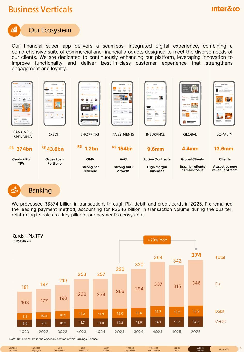 2Q25 1Q25 2Q24 ∆QoQ ∆YoY Unit Economics Total Clients mm 39.3 37.7 33.3 +4.3% +18.2% Active Clients mm 22.7 21.6 18.4 +5.2% +23.4% Gross ARPAC R$ 53.7 50.0 44.7 +7.3% +20.0% CTS R$ 13.1 13.1 12.3 +0.1% +7.0% Income Statement Total Gross Revenue R$ mm 3,567 3,162 2,404 +12.8% +48.4% Net Revenue R$ mm 2,003 1,838 1,479 +9.0% +35.5% Earnings Before Tax R$ mm 384 358 298 +7.3% +28.9% Net Income R$ mm 332 307 223 +8.3% +49.2% Net Income Excl. Minority Int. R$ mm 315 287 206 +10.0% +52.6% Balance Sheet & Capital Variation % Funding R$ bn 62.2 59.1 47.8 +5.4% +30.3% Shareholders' Equity R$ bn 9.4 9.0 8.6 +4.2% +9.1% Basel Ratio % 15.7% 14.7% 19.3% +1.0 p.p. -3.6 p.p. Volume KPIs Cards + PIX TPV R$ bn 374 342 290 +9.4% +28.8% GMV R$ mm 1,237 1,282 1,136 -3.6% +8.8% AuC R$ bn 154 146 105 +5.8% +46.8% Asset Quality NPL > 90 days - excl. c.c. rec.% 4.6% 4.6% 5.% -0.1 p.p. -0.5 p.p. NPL 15-90 days - excl. c.c. rec.% 4.1% 4.3% 4.3% -0.2 p.p. -0.2 p.p. Coverage Ratio % 143% 143% 130% +0.9 p.p. +13.2 p.p. Performance KPIs NIM 2.0 - IEP Only % 9.1% 8.8% 8.2% +0.2 p.p. +0.8 p.p. Risk Adjusted NIM 2.0 - IEP Only % 5.6% 5.5% 4.9% +0.0 p.p. +0.6 p.p. Cost of Funding % of CDI 64.8% 63.8% 64.3% +1.1 p.p. +0.6 p.p. Fee Income Ratio % 26.6% 25.9% 29.5% +0.8 p.p. -2.9 p.p. Efficiency Ratio % 47.8% 48.8% 47.9% -1.0 p.p. -0.0 p.p. ROE % 14.5% 13.6% 10.4% +0.9 p.p. +4.1 p.p. ROE Excl. Minority Int. % 13.9% 12.9% 9.8% +1.0 p.p. +4.1 p.p. Note: Definitions are in the Appendix section of this Earnings Release. Quarter Highlights Quarter Highlights Appendix Unit Economics Loan Portfolio Asset Quality Funding Capabilities Financial Performance Capital Ratio Business Verticals Strategic Update 4