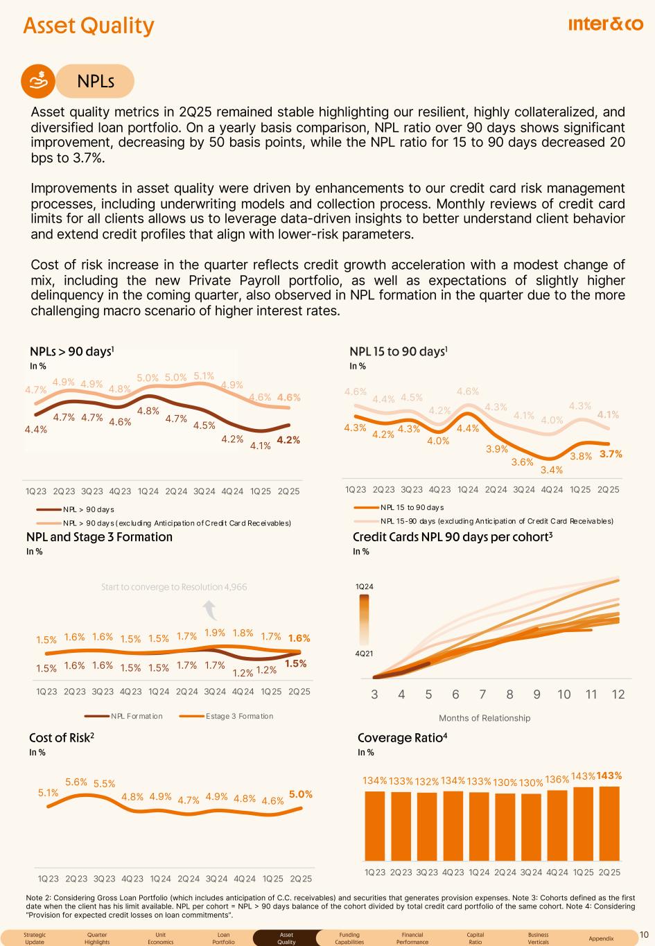 Loan Portfolio Portfolio Growth Note: Definitions are in the Glossary section of this Earnings Release. Note 1: Home Equity includes both business and individuals’ portfolio. Note 2: Payroll + Personal includes payroll deductible loans, overdraft, credit card renegotiations and other loans, excluding FGTS. Note3: Excluding Home Equity Loans. Note 4: Only Home Equity individuals’ portfolio. Note 5: Includes Agribusiness loans. Data from Banco Central do brasil. Note 6: Total FGTS portfolio estimated by multiplying Inter’s share in payments received of FGTS Withdraws (60-F – Saque Aniversário – Alienação ou Cessão Fiduciária) from 2Q25 by Inter’s June/2025 FGTS loans portfolio. Note 7: Market data from ABECIP. 2Q25 Gross Loan Portfolio Growth and Balance In % YoY and in R$ billions Portfolio Size Brazilian Market Growth Quarter Highlights Appendix Unit Economics Loan Portfolio Asset Quality Funding Capabilities Financial Performance Capital Ratio Business Verticals Strategic Update R$ 4.0 Bn Δ -1.2 bn -24% R$ 3.6 Bn Δ +1.0 bn 42% R$ 3.8 Bn Δ +1.0 bn 38% R$ 13.0 Bn Δ +2.5 bn 24% R$ 8.1 Bn Δ +1.7 bn 27% R$ 6.3 Bn Δ +1.3 bn 27% Payroll + Personal2,5 50%-75% Credit Card5 60%-75% FGTS6 50%-60% Home Equity1,7 30%-40% RWA Weight Loan Mortgage3,5 30%-40% SMB5 80%-70% Yo Y G ro w th Total Portfolio Growth 22% 26% 24% 17% 11% 13% 5% Market Growth 11% 9 Our top-performing credit products, FGTS and Home Equity loans, continued to deliver exceptional results, driving growth and gaining both market share and prominence in our loan portfolio mix. In 2Q25, FGTS grew by 42% YoY, reaching R$3.6 billion, while Home Equity increased by 38% YoY to R$3.8 billion. These standout performances reflect the strong demand for secured credit products and our ability to scale efficiently within these segments. We continue to gain market share in mortgages, and the deceleration in the market this quarter did not impact our performance. Our credit card portfolio also moved against the market, as we continued to improve our underwriting capabilities and gain market share. Combined, our core products contributed to total portfolio growth of 31%, outperforming the Brazilian market growth rate of 11%, and reaffirming our strategy of penetrating key credit segments with scalable, digital-first solutions. //