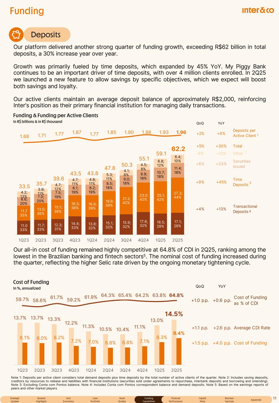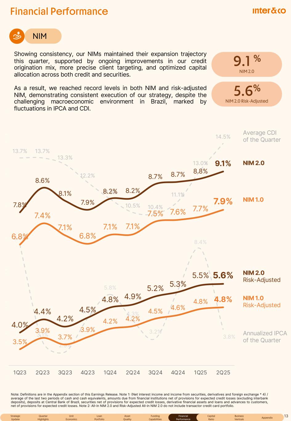 11.0 33% 11.7; 33% 12.3; 31% 14.4; 33% 13.8; 32% 15.1; 32% 15.9; 32% 17.6; 32% 16.5; 28% 17.1; 28% 11.7 35% 13.0; 36% 15.1; 38% 16.3; 38% 16.9; 39% 18.8; 39% 21.2; 42% 23.0; 42% 25.1; 42% 27.3; 44% 6.6; 20% 7.0; 20% 7.5; 19% 8.1; 19% 8.2; 19% 8.5; 18% 9.0; 18% 9.9; 18% 10.7; 18% 11.4; 18% 4.2; 13% 3.9; 11% 4.7; 12% 4.7; 11% 4.8; 11% 5.3; 11% 4.1; 8% 4.5; 8% 6.8; 12% 6.4; 10% 33.5 35.7 39.6 43.5 43.8 47.8 50.3 55.1 59.1 62.2 1Q23 2Q23 3Q23 4Q23 1Q24 2Q24 3Q24 4Q24 1Q25 2Q25 Funding Deposits Note 1: Deposits per active client considers total demand deposits plus time deposits by the total number of active clients of the quarter. Note 2: Includes saving deposits, creditors by resources to release and liabilities with financial institutions (securities sold under agreements to repurchase, interbank deposits and borrowing and onlending). Note 3: Excluding Conta com Pontos balance. Note 4: Includes Conta com Pontos correspondent balance and demand deposits. Note 5: Based on the earnings reports of peers and other market players Funding & Funding per Active Clients In R$ billions & in R$ thousand Cost of Funding In %, annualized 13.7% 13.7% 13.3% 12.2% 11.3% 10.5% 10.4% 11.1% 13.0% 14.5% 8.1% 8.0% 8.2% 7.2% 7.0% 6.8% 6.8% 7.1% 8.3% 9.4% 59.7% 58.6% 61.7% 59.2% 61.9% 64.3% 65.4% 64.2% 63.8% 64.8% 0. 0% 10. 0% 20 .0 % 30 .0 % 40 .0 % 50 .0 % 60 .0 % 2.0% 4.0% 6.0% 8.0% 10.0 % 12.0% 14.0% 16.0% 18.0% 20.0% 1Q23 2Q23 3Q23 4Q23 1Q24 2Q24 3Q24 4Q24 1Q25 2Q25 Quarter Highlights Appendix Unit Economics Loan Portfolio Asset Quality Funding Capabilities Financial Performance Capital Ratio Business Verticals Strategic Update QoQ YoY +2% +6% Deposits per Active Client +5% +30% Total -6% +22% Other +6% +33% Securities Issued +9% +45% Time Deposits +4% +13% Transactional Deposits 11 Our platform delivered another strong quarter of funding growth, exceeding R$62 billion in total deposits, a 30% increase year over year. Growth was primarily fueled by time deposits, which expanded by 45% YoY. My Piggy Bank continues to be an important driver of time deposits, with over 4 million clients enrolled. In 2Q25 we launched a new feature to allow savings by specific objectives, which we expect will boost both savings and loyalty. Our active clients maintain an average deposit balance of approximately R$2,000, reinforcing Inter’s position as their primary financial institution for managing daily transactions. Our all-in cost of funding remained highly competitive at 64.8% of CDI in 2Q25, ranking among the lowest in the Brazilian banking and fintech sectors5. The nominal cost of funding increased during the quarter, reflecting the higher Selic rate driven by the ongoing monetary tightening cycle. 1 2 3 4 QoQ YoY +1.0 p.p. +0.6 p.p. Cost of Funding as % of CDI +1.1 p.p. +2.6 p.p. Average CDI Rate +1.5 p.p. +4.0 p.p. Cost of Funding 1.68 1.71 1.77 1.87 1.77 1.85 1.90 1.98 1.93 1.96 1 .60 1 .65 1 .70 1 .75 1 .80 1 .85 1 .90 1 .95 2 .0