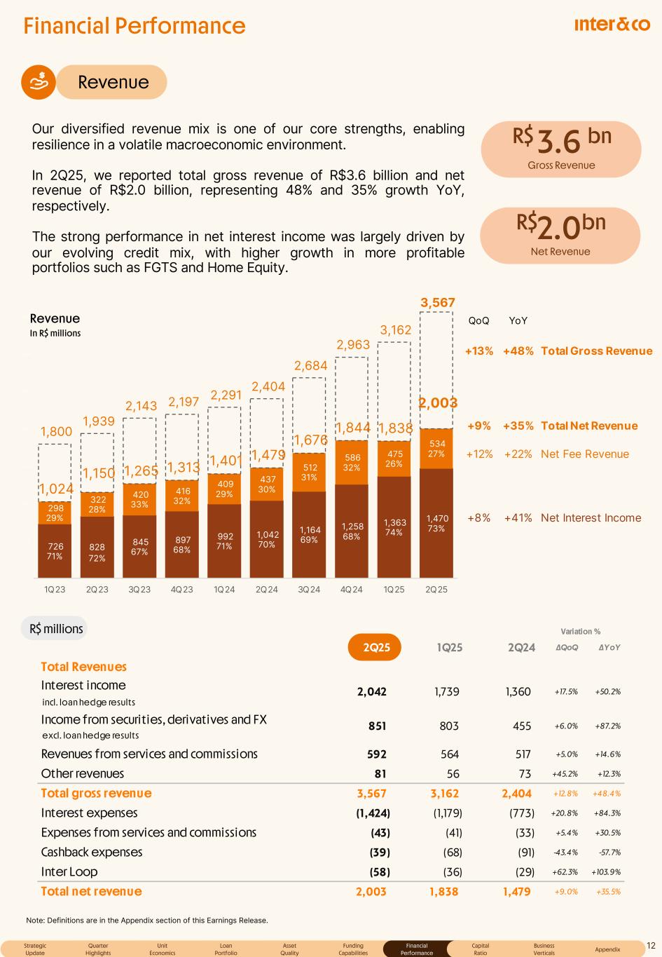 Financial Performance Revenue R$ millions Note: Definitions are in the Appendix section of this Earnings Release. 2Q25 1Q25 2Q24 ∆QoQ ∆YoY Total Revenues Interest income incl. loan hedge results Income from securities, derivatives and FX excl. loan hedge results Revenues from services and commissions 592 564 517 +5.0% +14.6% Other revenues 81 56 73 +45.2% +12.3% Total gross revenue 3,567 3,162 2,404 +12.8% +48.4% Interest expenses (1,424) (1,179) (773) +20.8% +84.3% Expenses from services and commissions (43) (41) (33) +5.4% +30.5% Cashback expenses (39) (68) (91) -43.4% -57.7% Inter Loop (58) (36) (29) +62.3% +103.9% Total net revenue 2,003 1,838 1,479 +9.0% +35.5% Variation % 2,042 1,739 1,360 +17.5% +50.2% 851 803 455 +6.0% +87.2% Revenue In R$ millions QoQ YoY +13% +48% Total Gross Revenue +9% +35% Total Net Revenue +12% +22% Net Fee Revenue +8% +41% Net Interest Income 726 71% 828 72% 845 67% 897 68% 992 71% 1,042 70% 1,164 69% 1,258 68% 1,363 74% 1,470 73% 298 29% 322 28% 420 33% 416 32% 409 29% 437 30% 512 31% 586 32% 475 26% 534 27% 1,024 1,150 1,265 1,313 1,401 1,479 1,676 1,844 1,838 2,003 1,800 1,939 2,143 2,197 2,291 2,404 2,684 2,963 3,162 3,567 - 5 00 1, 00 0 1, 50 0 2 ,0 00 2 ,50 0 3 ,0 00 3 ,50 0 1Q23 2Q23 3Q23 4Q23 1Q24 2Q24 3Q24 4Q24 1Q25 2Q25 Quarter Highlights Appendix Unit Economics Loan Portfolio Asset Quality Funding Capabilities Financial Performance Capital Ratio Business Verticals Strategic Update R$ 3.6 bn Gross Revenue R$2.0bn Net Revenue 12 Our diversified revenue mix is one of our core strengths, enabling resilience in a volatile macroeconomic environment. In 2Q25, we reported total gross revenue of R$3.6 billion and net revenue of R$2.0 billion, representing 48% and 35% growth YoY, respectively. The strong performance in net interest income was largely driven by our evolving credit mix, with higher growth in more profitable portfolios such as FGTS and Home Equity.