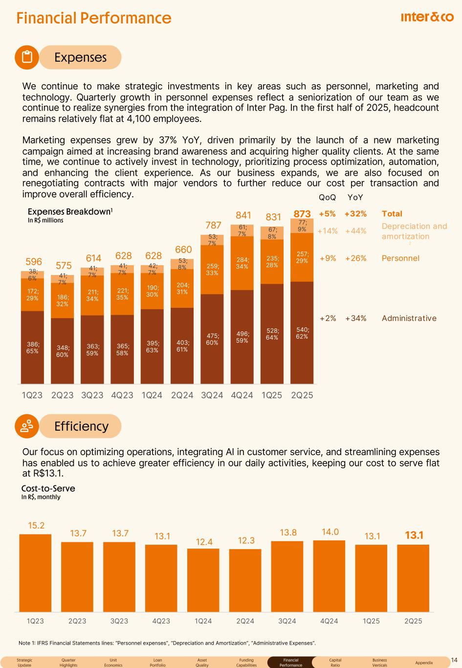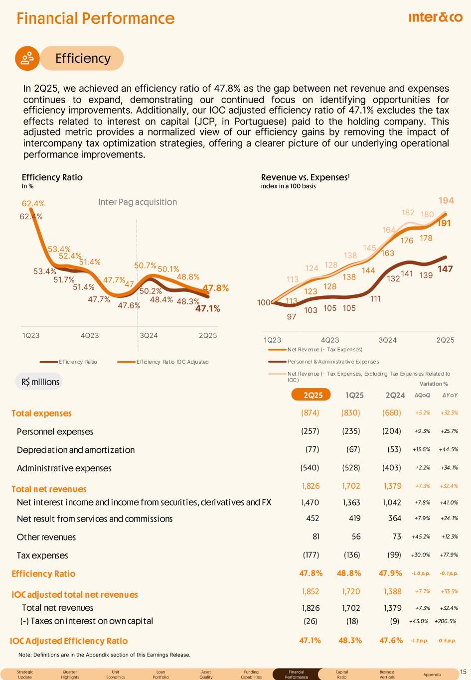 Financial Performance Expenses Note 1: IFRS Financial Statements lines: “Personnel expenses”, “Depreciation and Amortization”, “Administrative Expenses”. 2 Efficiency Cost-to-Serve In R$, monthly Quarter Highlights Appendix Unit Economics Loan Portfolio Asset Quality Funding Capabilities Financial Performance Capital Ratio Business Verticals Strategic Update 14 We continue to make strategic investments in key areas such as personnel, marketing and technology. Quarterly growth in personnel expenses reflect a seniorization of our team as we continue to realize synergies from the integration of Inter Pag. In the first half of 2025, headcount remains relatively flat at 4,100 employees. Marketing expenses grew by 37% YoY, driven primarily by the launch of a new marketing campaign aimed at increasing brand awareness and acquiring higher quality clients. At the same time, we continue to actively invest in technology, prioritizing process optimization, automation, and enhancing the client experience. As our business expands, we are also focused on renegotiating contracts with major vendors to further reduce our cost per transaction and improve overall efficiency. Our focus on optimizing operations, integrating AI in customer service, and streamlining expenses has enabled us to achieve greater efficiency in our daily activities, keeping our cost to serve flat at R$13.1. 386; 65% 348; 60% 363; 59% 365; 58% 395; 63% 403; 61% 475; 60% 496; 59% 528; 64% 540; 62% 172; 29% 186; 32% 211; 34% 221; 35% 190; 30% 204; 31% 259; 33% 284; 34% 235; 28% 257; 29% 38; 6% 41; 7% 41; 7% 41; 7% 42; 7% 53; 8% 53; 7% 61; 7% 67; 8% 77; 9% 596 575 614 628 628 660 787 841 831 873 - 1 0 2 0 0 3 0 0 4 0 0 5 0 0 6 0 0 7 0 0 8 0 0 9 0 0 1 ,0 0 1Q23 2Q23 3Q23 4Q23 1Q24 2Q24 3Q24 4Q24 1Q25 2Q25 QoQ YoY +5% +32% Total +14% +44% Depreciation and amortization +9% +26% Personnel +2% +34% Administrative Expenses Breakdown1 In R$ millions 15.2 13.7 13.7 13.1 12.4 12.3 13.8 14.0 13.1 13.1 - 2 .0 4 .0 6 .0 8 .0 10 .0 12 .0 14 .0 16 .0 1Q23 2Q23 3Q23 4Q23 1Q24 2Q24 3Q24 4Q24 1Q25 2Q25
