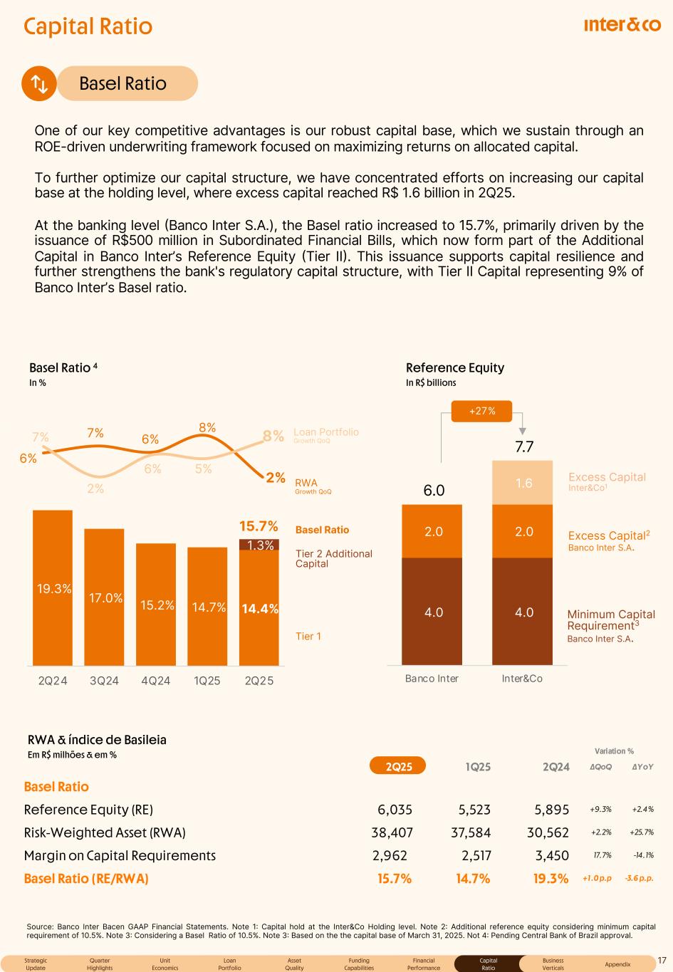 19.3% 17.0% 15.2% 14.7% 14.4% 1.3% 15.7% 0 .0 % 5 .0 % 10 .0 % 15 .0 % 2 0. 0% 2 5. 0% 2Q24 3Q24 4Q24 1Q25 2Q25 2Q25 1Q25 2Q24 ∆QoQ ∆YoY Basel Ratio Reference Equity (RE) 6,035 5,523 5,895 +9.3% +2.4% Risk-Weighted Asset (RWA) 38,407 37,584 30,562 +2.2% +25.7% Margin on Capital Requirements 2,962 2,517 3,450 17.7% -14.1% Basel Ratio (RE/RWA) 15.7% 14.7% 19.3% +1.0 p.p -3.6 p.p. Variation % Capital Ratio Basel Ratio One of our key competitive advantages is our robust capital base, which we sustain through an ROE-driven underwriting framework focused on maximizing returns on allocated capital. To further optimize our capital structure, we have concentrated efforts on increasing our capital base at the holding level, where excess capital reached R$ 1.6 billion in 2Q25. At the banking level (Banco Inter S.A.), the Basel ratio increased to 15.7%, primarily driven by the issuance of R$500 million in Subordinated Financial Bills, which now form part of the Additional Capital in Banco Inter’s Reference Equity (Tier II). This issuance supports capital resilience and further strengthens the bank's regulatory capital structure, with Tier II Capital representing 9% of Banco Inter’s Basel ratio. Reference Equity In R$ billions Loan Portfolio Growth QoQ RWA Growth QoQ RWA & índice de Basileia Em R$ milhões & em % Basel Ratio 4 In % Minimum Capital Requirement3 Banco Inter S.A. Excess Capital2 Banco Inter S.A. Source: Banco Inter Bacen GAAP Financial Statements. Note 1: Capital hold at the Inter&Co Holding level. Note 2: Additional reference equity considering minimum capital requirement of 10.5%. Note 3: Considering a Basel Ratio of 10.5%. Note 3: Based on the the capital base of March 31, 2025. Not 4: Pending Central Bank of Brazil approval. 6 7% 6% 8% 2% 7% 2% 6% 5% 8% 0% 2% 4% 6% 8% 10% 12% 4.0 4.0 2.0 2.0 1.6 6.0 7.7 - 1 .0 2 .0 3 .0 4 .0 5 .0 6 .0 7 .0 8 .0 9 .0 Banco Inter Inter&Co Excess Capital Inter&Co1 +27% Quarter Highlights Appendix Unit Economics Loan Portfolio Asset Quality Funding Capabilities Financial Performance Capital Ratio Business Verticals Strategic Update 17 Tier 1 Tier 2 Additional Capital Basel Ratio