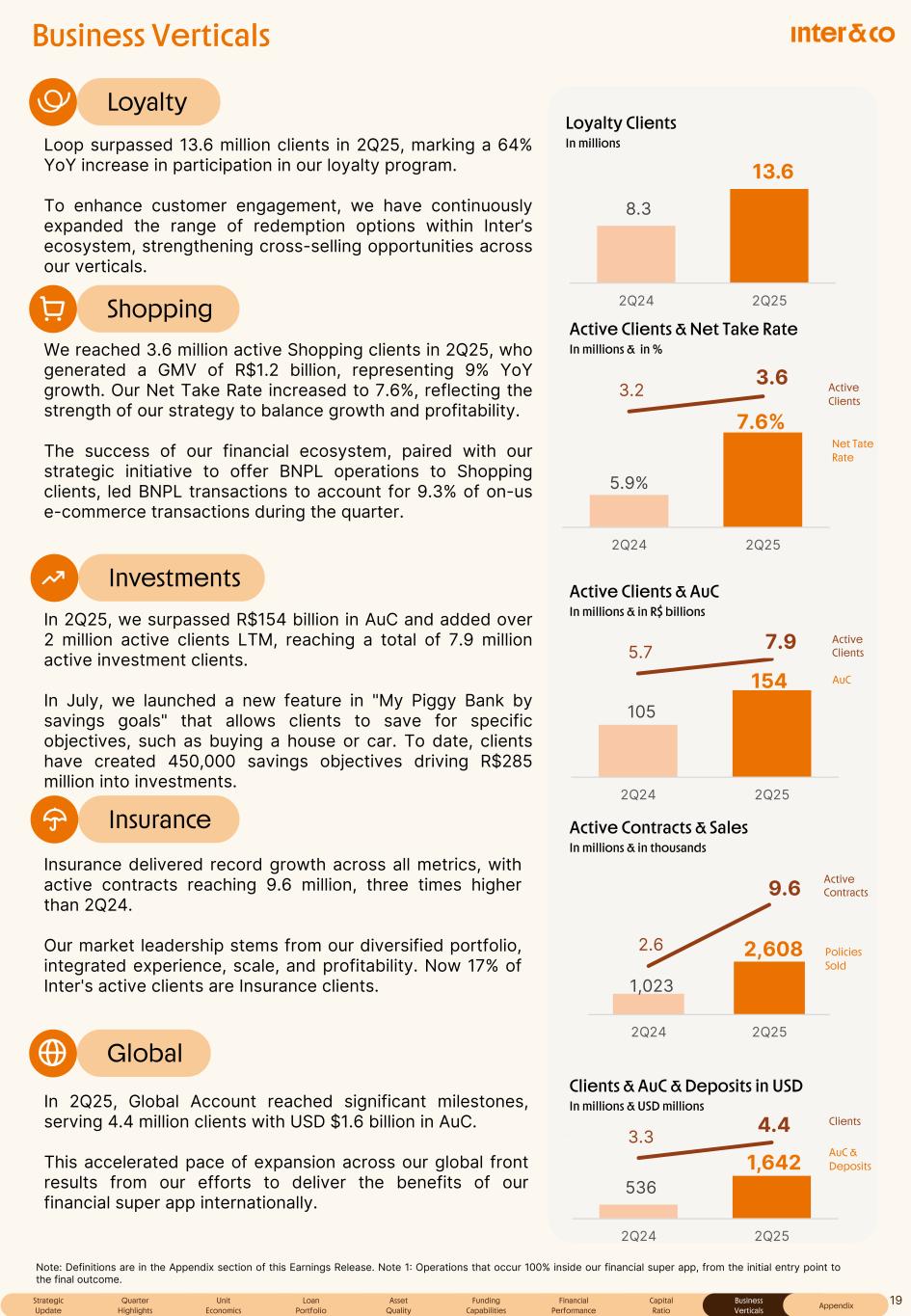 8.6 9.2 10.3 11.7 11.9 12.3 12.9 14.1 13.7 14.6 9.9 10.4 10.9 12.2 11.3 12.0 12.6 13.7 13.2 13.9 163 177 198 230 234 266 294 337 315 346 181 197 219 253 257 290 320 364 342 374 - 10 .0 2 0. 0 3 0. 0 4 0. 0 5 0. 0 6 0. 0 7 0. 0 8 0. 0 9 0. 0 10 0. 0 1Q23 2Q23 3Q23 4Q23 1Q24 2Q24 3Q24 4Q24 1Q25 2Q25 Business Verticals Our Ecosystem BANKING & SPENDING SHOPPING INVESTMENTS INSURANCE GLOBALCREDIT LOYALTY Cards + Pix TPV Gross Loan Portfolio AuC Strong AuC growth Active Contracts High margin business Global Clients Brazilian clients as main focus Clients Attractive new revenue stream Banking Debit Credit Pix Total Cards + Pix TPV In R$ billions 7.300,35 Our financial super app delivers a seamless, integrated digital experience, combining a comprehensive suite of commercial and financial products designed to meet the diverse needs of our clients. We are dedicated to continuously enhancing our platform, leveraging innovation to improve functionality and deliver best-in-class customer experience that strengthens engagement and loyalty. Note: Definitions are in the Appendix section of this Earnings Release. +29% YoY 9.6mm 4.4mm 13.6mm374bnR$ 43.8bnR$ 1.2bnR$ 154bnR$ Quarter Highlights Appendix Unit Economics Loan Portfolio Asset Quality Funding Capabilities Financial Performance Capital Ratio Business Verticals Strategic Update 18 We processed R$374 billion in transactions through Pix, debit, and credit cards in 2Q25. Pix remained the leading payment method, accounting for R$346 billion in transaction volume during the quarter, reinforcing its role as a key pillar of our payment's ecosystem. GMV Strong net revenue