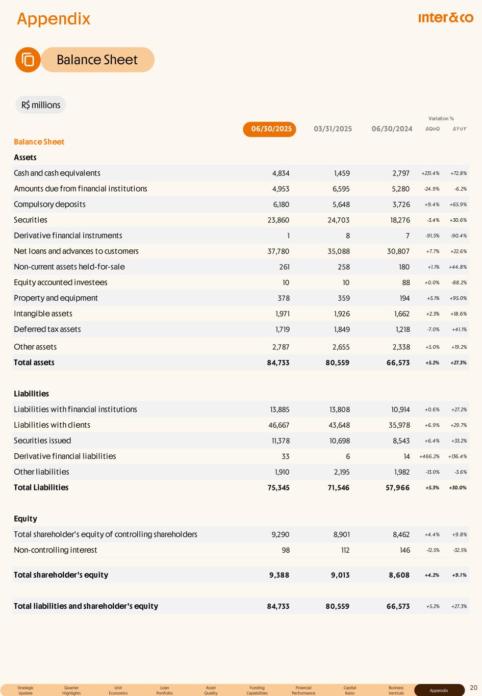 Appendix Balance Sheet R$ millions 06/30/2025 03/31/2025 06/30/2024 ∆QoQ ∆YoY Balance Sheet Assets Cash and cash equivalents 4,834 1,459 2,797 +231.4% +72.8% Amounts due from financial institutions 4,953 6,595 5,280 -24.9% -6.2% Compulsory deposits 6,180 5,648 3,726 +9.4% +65.9% Securities 23,860 24,703 18,276 -3.4% +30.6% Derivative financial instruments 1 8 7 -91.5% -90.4% Net loans and advances to customers 37,780 35,088 30,807 +7.7% +22.6% Non-current assets held-for-sale 261 258 180 +1.1% +44.8% Equity accounted investees 10 10 88 +0.0% -88.2% Property and equipment 378 359 194 +5.1% +95.0% Intangible assets 1,971 1,926 1,662 +2.3% +18.6% Deferred tax assets 1,719 1,849 1,218 -7.0% +41.1% Variation % Other assets 2,787 2,655 2,338 +5.0% +19.2% Total assets 84,733 80,559 66,573 +5.2% +27.3% Liabilities Liabilities with financial institutions 13,885 13,808 10,914 +0.6% +27.2% Liabilities with clients 46,667 43,648 35,978 +6.9% +29.7% Securities issued 11,378 10,698 8,543 +6.4% +33.2% Derivative financial liabilities 33 6 14 +466.2% +136.4% Other liabilities 1,910 2,195 1,982 -13.0% -3.6% Total Liabilities 75,345 71,546 57,966 +5.3% +30.0% Equity Total shareholder's equity of controlling shareholders 9,290 8,901 8,462 +4.4% +9.8% Non-controlling interest 98 112 146 -12.5% -32.5% Total shareholder's equity 9,388 9,013 8,608 +4.2% +9.1% Total liabilities and shareholder's equity 84,733 80,559 66,573 +5.2% +27.3% 20Quarter Highlights Appendix Unit Economics Loan Portfolio Asset Quality Funding Capabilities Financial Performance Capital Ratio Business Verticals Strategic Update