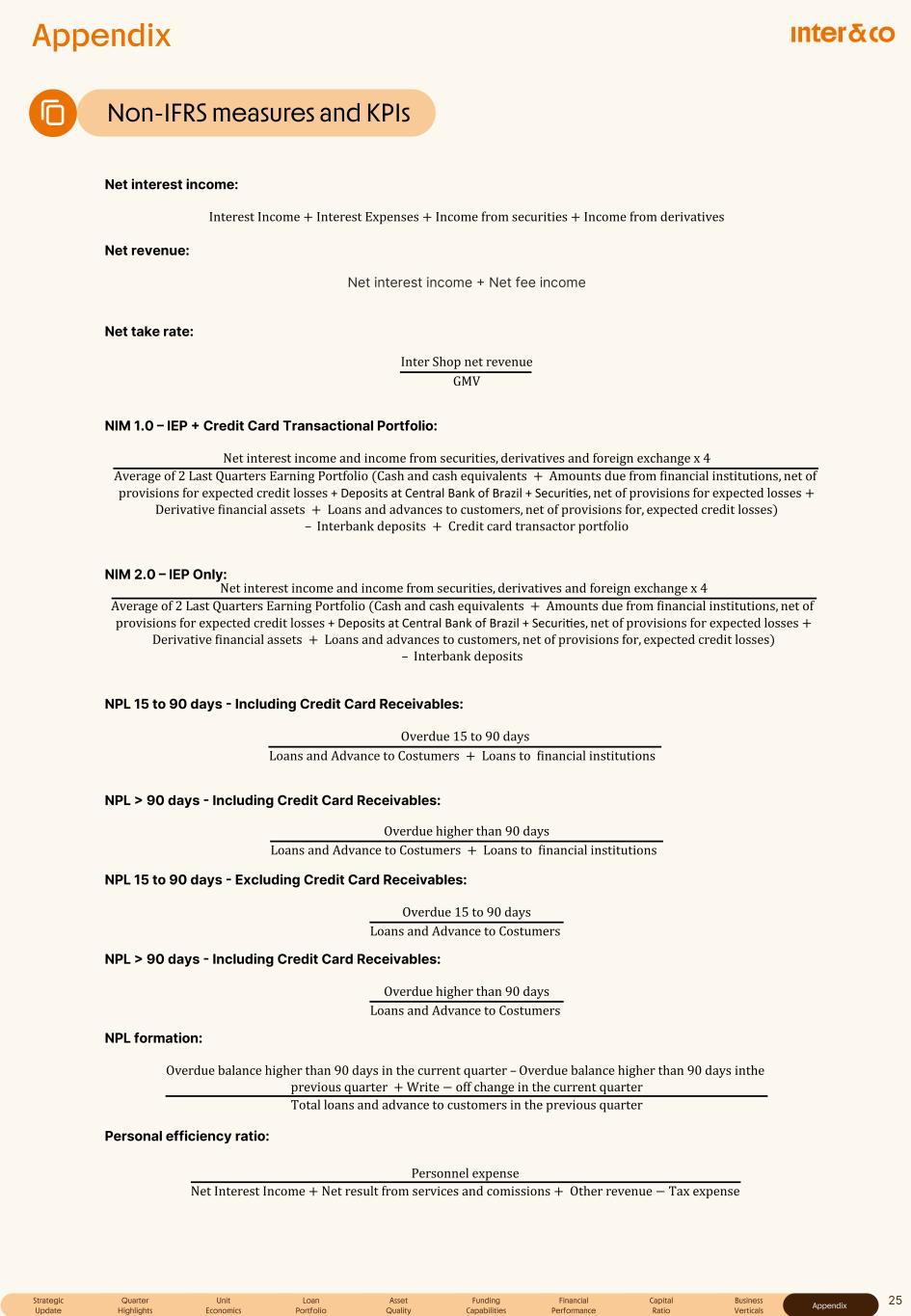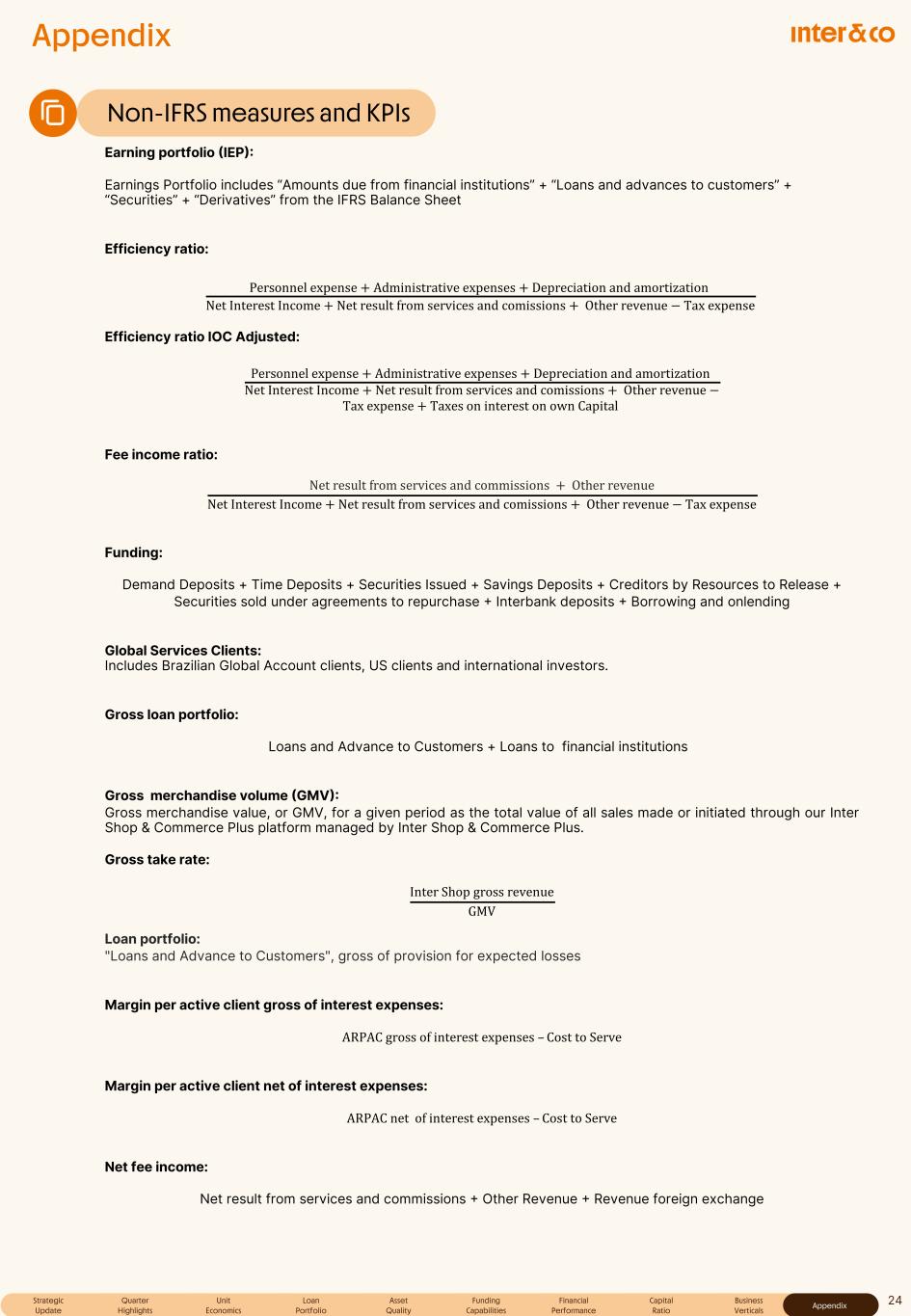 Appendix Non-IFRS measures and KPIs Earning portfolio (IEP): Earnings Portfolio includes “Amounts due from financial institutions” + “Loans and advances to customers” + “Securities” + “Derivatives” from the IFRS Balance Sheet Efficiency ratio: Personnel expense + Administrative expenses + Depreciation and amortization Net Interest Income + Net result from services and comissions + Other revenue − Tax expense Efficiency ratio IOC Adjusted: Personnel expense + Administrative expenses + Depreciation and amortization Net Interest Income + Net result from services and comissions + Other revenue − Tax expense + Taxes on interest on own Capital Fee income ratio: Net result from services and commissions + Other revenue Net Interest Income + Net result from services and comissions + Other revenue − Tax expense Funding: Demand Deposits + Time Deposits + Securities Issued + Savings Deposits + Creditors by Resources to Release + Securities sold under agreements to repurchase + Interbank deposits + Borrowing and onlending Global Services Clients: Includes Brazilian Global Account clients, US clients and international investors. Gross loan portfolio: Loans and Advance to Customers + Loans to financial institutions Gross merchandise volume (GMV): Gross merchandise value, or GMV, for a given period as the total value of all sales made or initiated through our Inter Shop & Commerce Plus platform managed by Inter Shop & Commerce Plus. Gross take rate: Inter Shop gross revenue GMV Loan portfolio: "Loans and Advance to Customers", gross of provision for expected losses Margin per active client gross of interest expenses: ARPAC gross of interest expenses – Cost to Serve Margin per active client net of interest expenses: ARPAC net of interest expenses – Cost to Serve Net fee income: Net result from services and commissions + Other Revenue + Revenue foreign exchange 24Quarter Highlights Appendix Unit Economics Loan Portfolio Asset Quality Funding Capabilities Financial Performance Capital Ratio Business Verticals Strategic Update