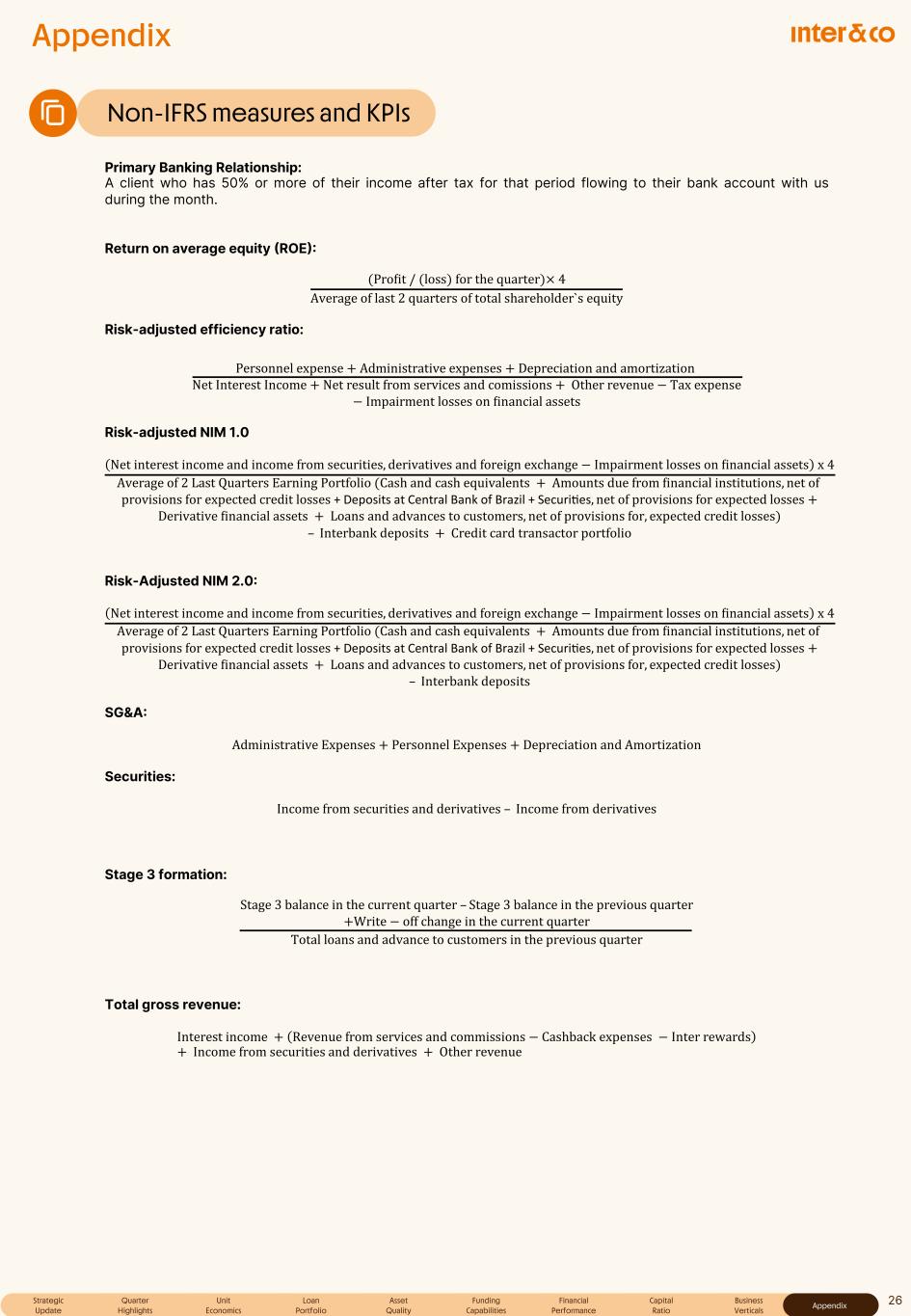 Appendix Non-IFRS measures and KPIs Net interest income: Interest Income + Interest Expenses + Income from securities + Income from derivatives Net revenue: Net interest income + Net fee income Net take rate: Inter Shop net revenue GMV NIM 1.0 – IEP + Credit Card Transactional Portfolio: Net interest income and income from securities, derivatives and foreign exchange x 4 Average of 2 Last Quarters Earning Portfolio (Cash and cash equivalents + Amounts due from Minancial institutions, net of provisions for expected credit losses + Deposits at Central Bank of Brazil + Securi$es, net of provisions for expected losses + Derivative Minancial assets + Loans and advances to customers, net of provisions for, expected credit losses) – Interbank deposits + Credit card transactor portfolio NIM 2.0 – IEP Only: Net interest income and income from securities, derivatives and foreign exchange x 4 Average of 2 Last Quarters Earning Portfolio (Cash and cash equivalents + Amounts due from Minancial institutions, net of provisions for expected credit losses + Deposits at Central Bank of Brazil + Securi$es, net of provisions for expected losses + Derivative Minancial assets + Loans and advances to customers, net of provisions for, expected credit losses) – Interbank deposits NPL 15 to 90 days - Including Credit Card Receivables: Overdue 15 to 90 days Loans and Advance to Costumers + Loans to Minancial institutions NPL > 90 days - Including Credit Card Receivables: Overdue higher than 90 days Loans and Advance to Costumers + Loans to Minancial institutions NPL 15 to 90 days - Excluding Credit Card Receivables: Overdue 15 to 90 days Loans and Advance to Costumers NPL > 90 days - Including Credit Card Receivables: Overdue higher than 90 days Loans and Advance to Costumers NPL formation: Overdue balance higher than 90 days in the current quarter – Overdue balance higher than 90 days inthe previous quarter + Write − off change in the current quarter Total loans and advance to customers in the previous quarter Personal efficiency ratio: Personnel expense Net Interest Income + Net result from services and comissions + Other revenue − Tax expense 25Quarter Highlights Appendix Unit Economics Loan Portfolio Asset Quality Funding Capabilities Financial Performance Capital Ratio Business Verticals Strategic Update